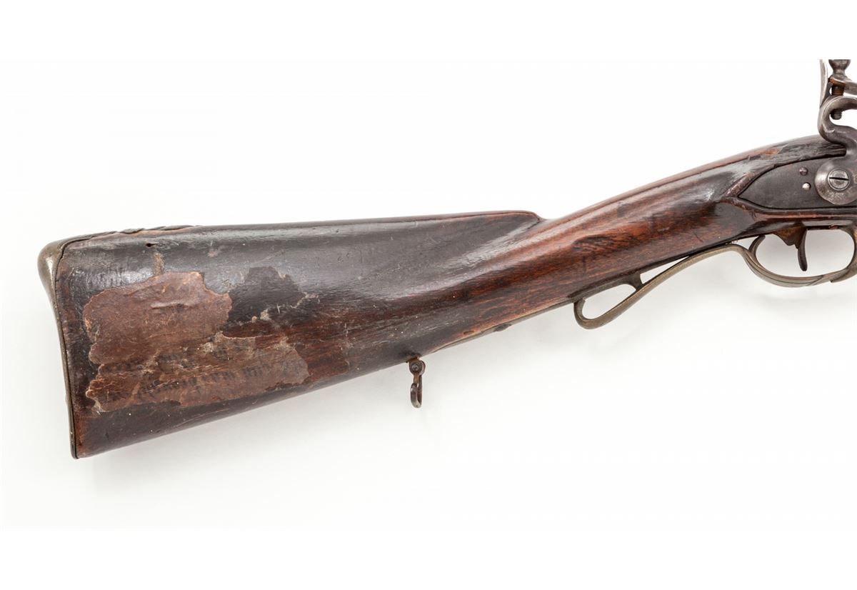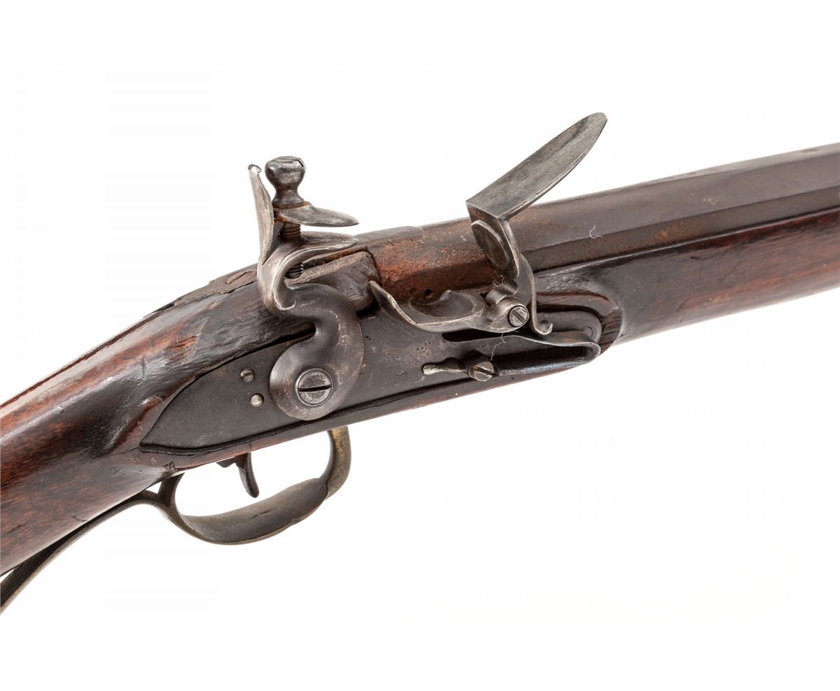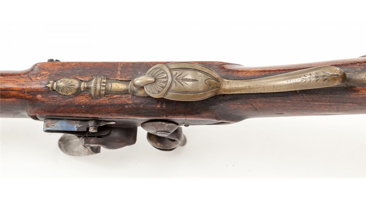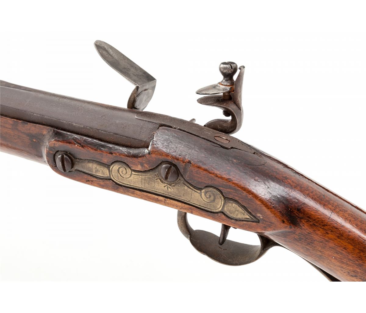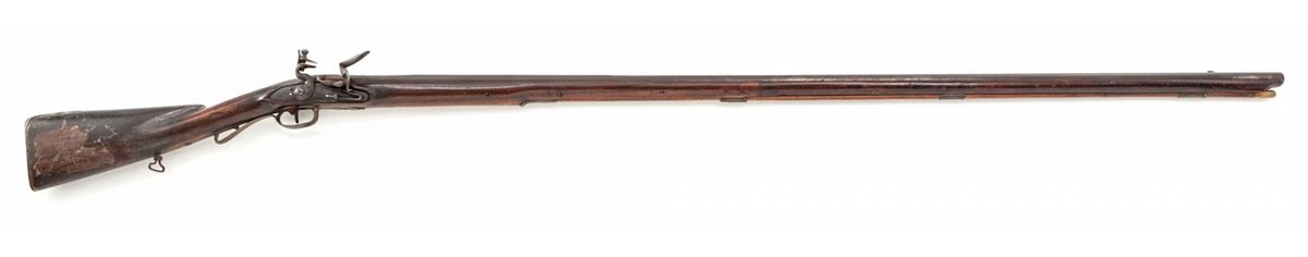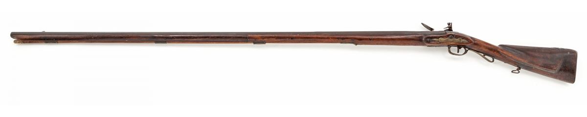 Early French Long Fowler, 54'' octagonal-to-round smoothbore barrel with touch mark and engraving at breech; walnut stock has a nicely carved and elongated crescent cheekpiece; forend has a takedown feature in which two-thirds of the forward forend remains attached to the barrel when barrel is removed for service or cleaning. The bold raised brass mounts are nicely formed and engraved in the traditional French period style. Overall length is 70''. A partial piece of parchment paper, which appears as old as this Fowler, is attached to the right butt side with writing barely legible. This Fowler is ca. 1760. Condition is very good overall, retaining its original period finish and patina. Stock shows some period handling dings. Est.: $2,000-$3,000. (Antique)