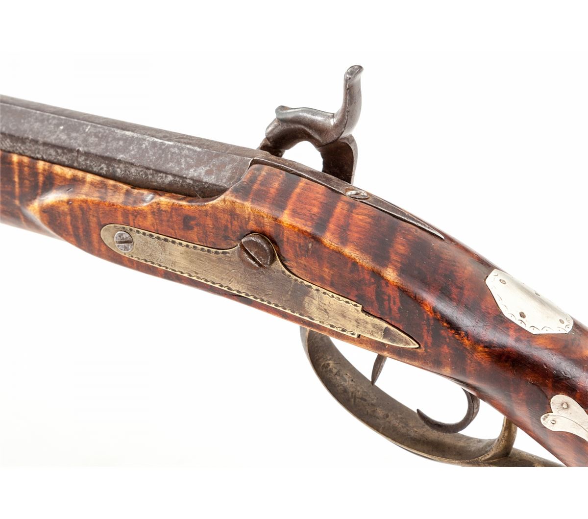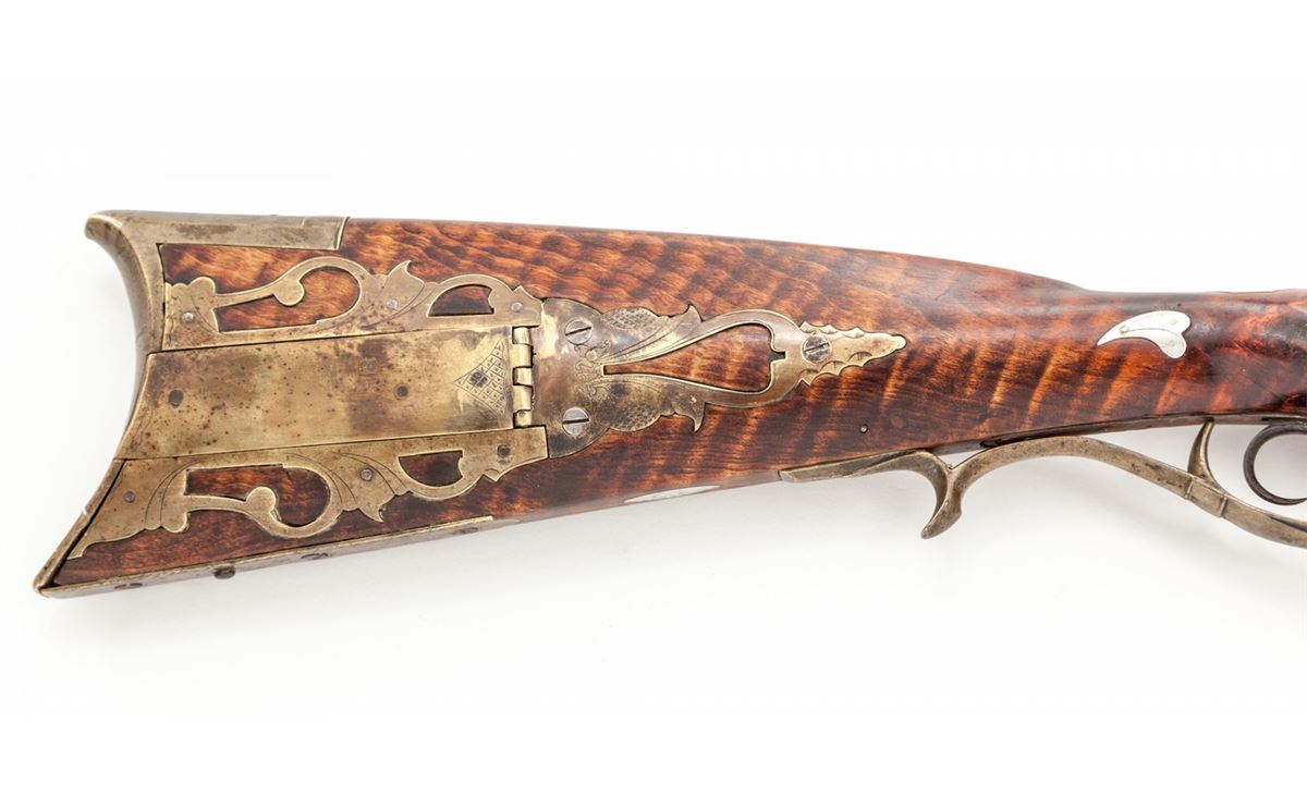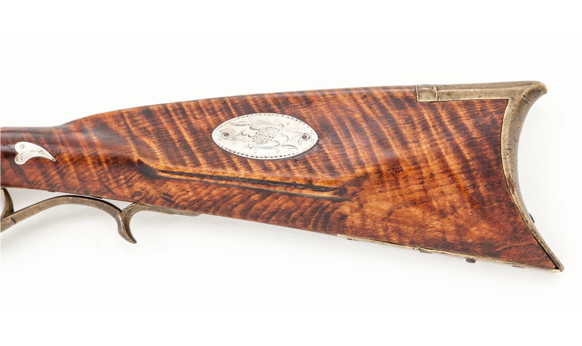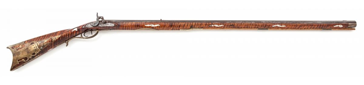 Percussion Kentucky Rifle, signed ''M. Ringle'' in script, .45 cal. rifled bore, 41'' octagonal barrel, 56'' overall, highly figured curly maple stock with thirteen (13) engraved silver inlays; fancy brass patchbox has the classic regional keyhole piercing on its finial with four more in its sideplates; dual set triggers, full-length brass sideplate and brass forend wear plate. Ringle was from Western Pennsylvania in the town of Bellefonte. Condition is very good overall. Silver inlays have been cleaned and several have been replaced. Stock is fine in its cleaned state. A fine looking Kentucky rifle. Est.: $2,200-$3,000. (Antique)