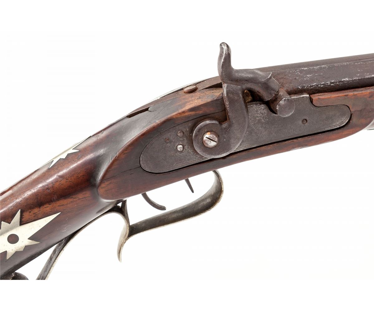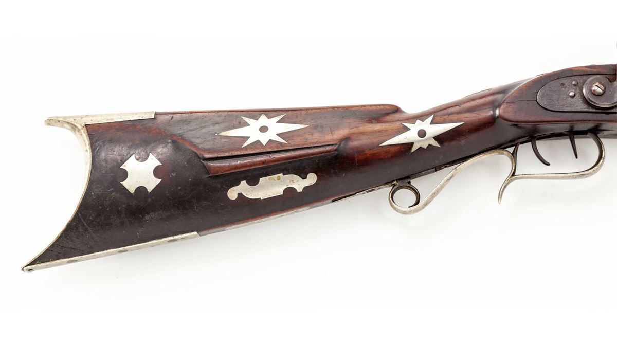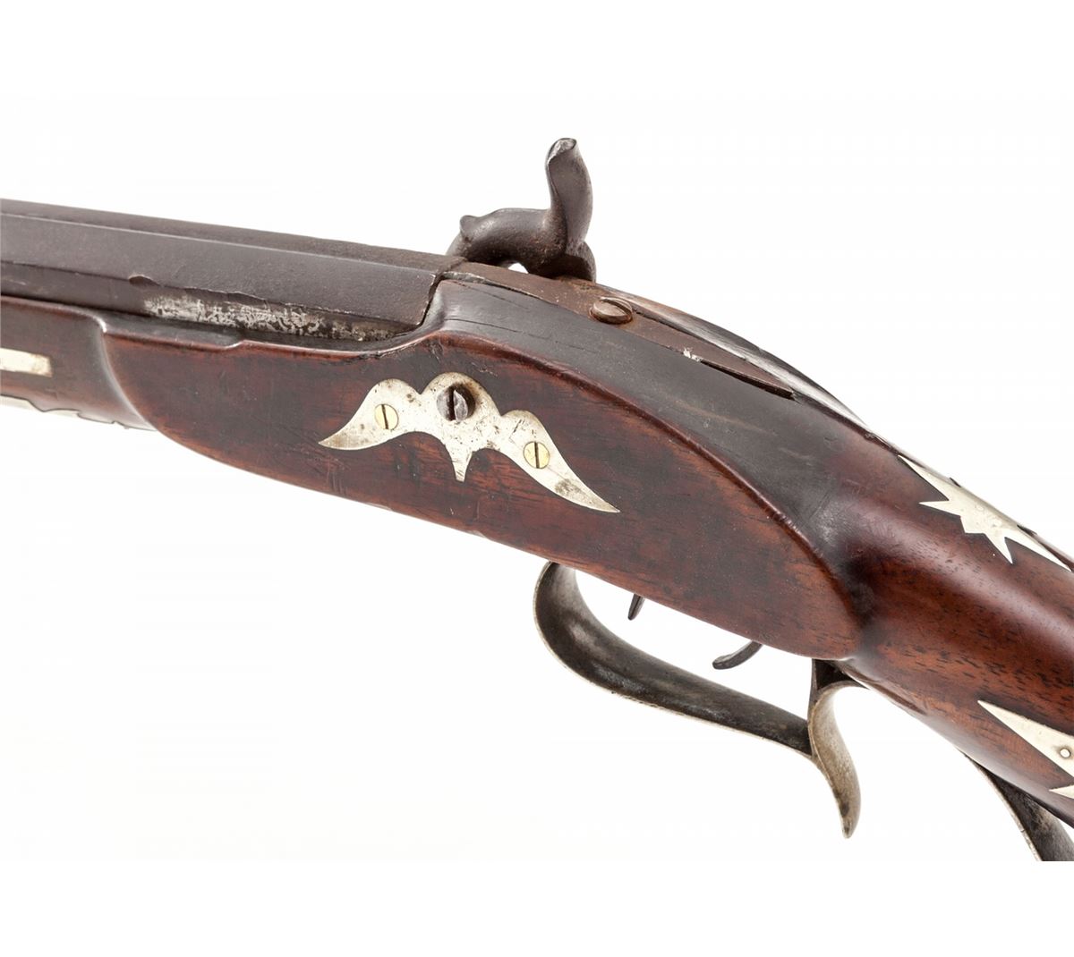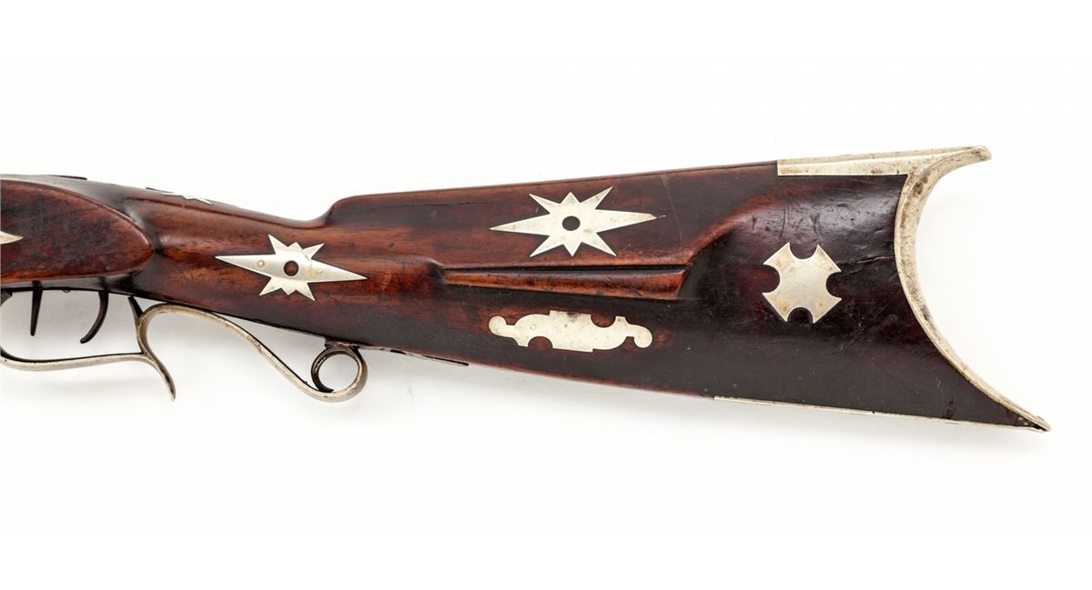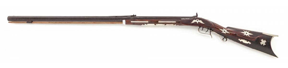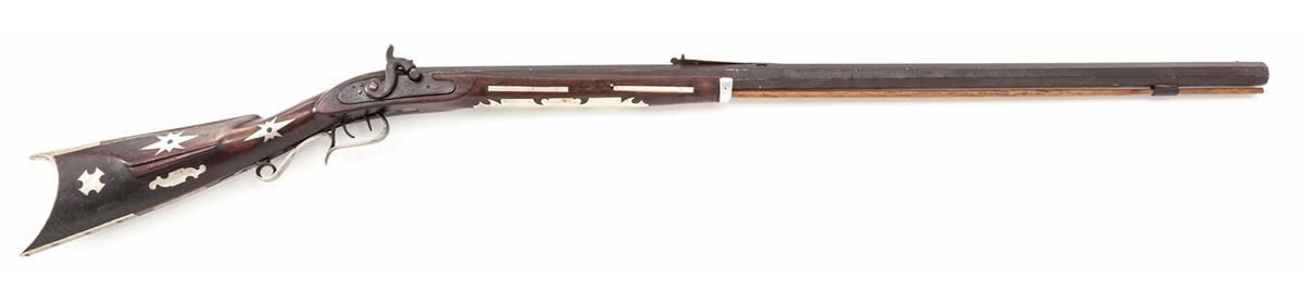 Percussion Halfstock Kentucky Rifle, attributed to Joseph Golcher, .40 cal. rifled bore, 35'' octagonal barrel, dark stained map stock with cheek rests on both sides (occasionally seen on Ohio region rifles), with adjustable ramp rear sight. Lock nicely engraved ''Joseph Golcher''. This rifle is fully silver mounted and is decorated with sixteen (16) silver inlays of eight-pointed stars, bars, cross and other freeforms. Condition is good overall. Wood filler was applied to a part of the forend to cover some minor damage, otherwise a fine rifle. Est.: $1,500-$2,500. (Antique)