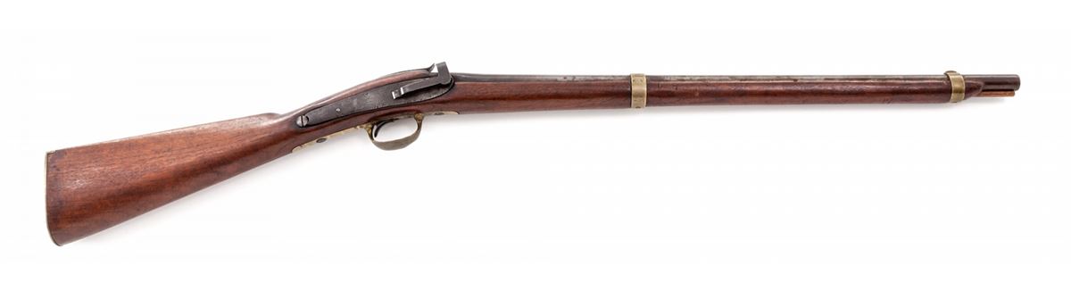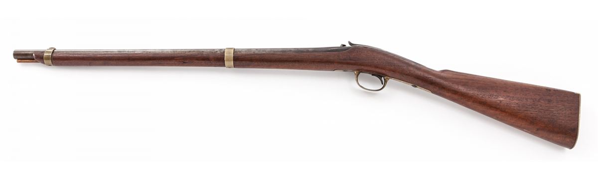 Scarce Smoothbore Jenks ''Mule Ear'' Percussion Carbine, by N.P. Ames, NVSN, .54 cal., 24-1/2'' brown barrel, bright finish with brass bands, triggerguard and buttplate; walnut stock. Lockplate marked with Ames address, Springfield, Mass., as well as ''Wm. Jenks''. Top of barrel marked ''USN/RC''. Mfg'd from 1843-1846 with just over 4000 produced. Condition is very good retaining approx. 30% thinning brown finish to barrel; sideplate and lever retain little original case hardened colors and have overall moderate patina with light pitting. Brass components show light even patination with bands missing screws. Stock shows faint cartouches and oil darkening near lock. Stock hsa been cut and then repaired beneath rear barrel band; barrel band retaining screws are missing. Rear lock screw appears to be a later replacement. Action is crisp, bore is fair to good. Est.: $1,200-$1,800. (Antique)
