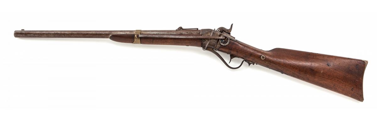 Sharps Model 1853 Slant-Breech Carbine, with Hartford address, #16921, .52 cal., 21-1/2'' barrel, bright barrel, case hardened frame, brass patchbox, buttplate and barrel bands; with pellet priming device and smooth walnut stock and handguard. Lightly cartouched to left side at wrist. Condition is very good with moderate general patination, light scuffs and scratches to wood, and wear at balance point of forend. Pellet primer has been later de-activated, perhaps during the Civil War. Action is very good, as is bore. Est.: $2,500-$3,500. (Antique)