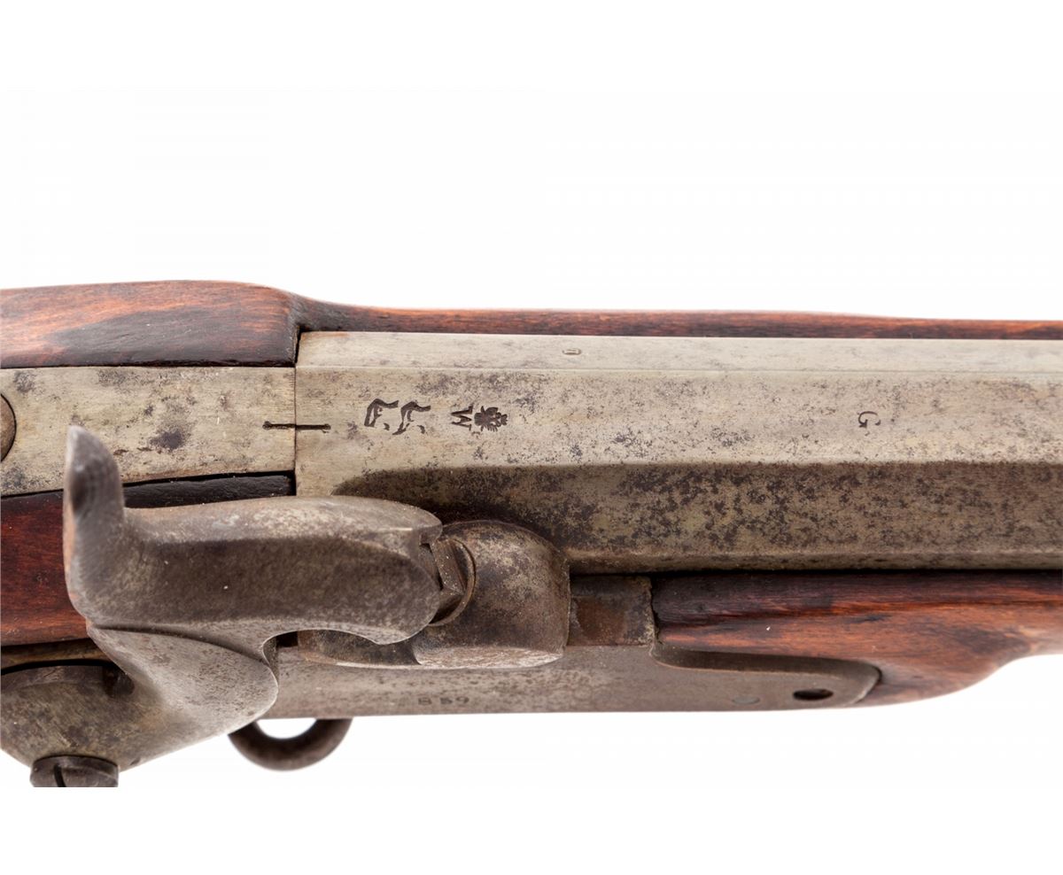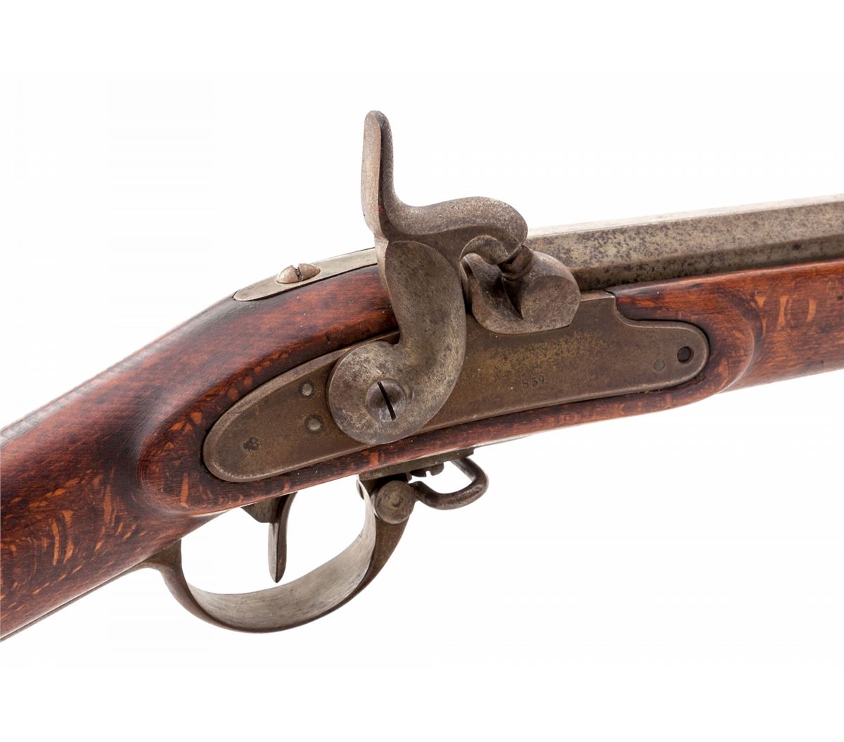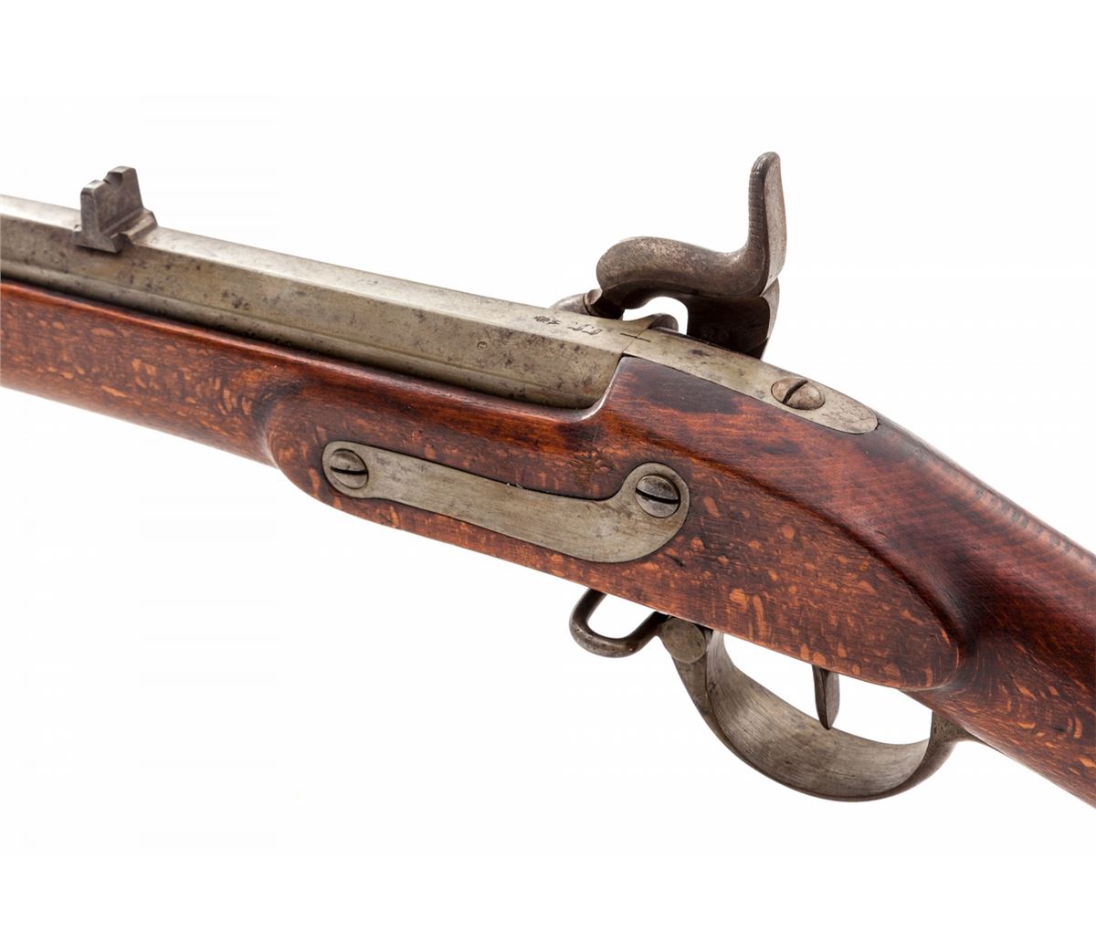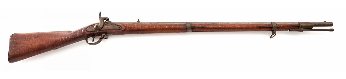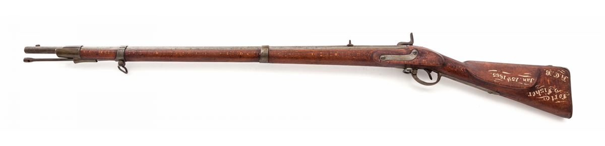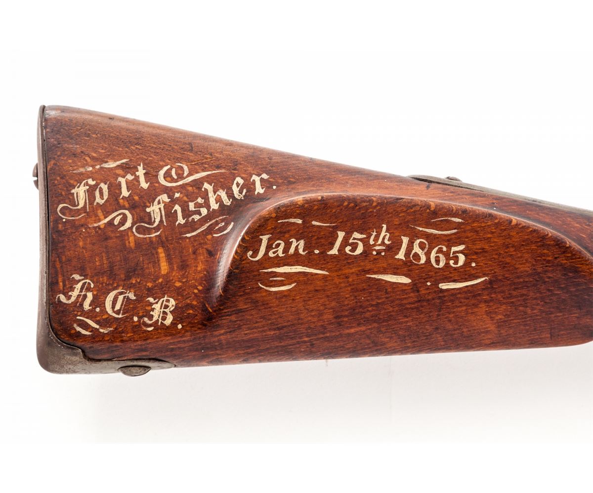 U.S. Civil War Battlefield Pickup Austrian Lorenz Percussion Rifle, NVSN, .54 cal., 37-1/2'' barrel, bright finish, beech stock, with block rear sight. Sideplate marked ''859'' (1859). Cheekpiece area of stock is marked in period white paint, ''Fort Fisher Jan. 15, 1865'', with the initials ''HCB''. Confederate purchased Lorenz rifles saw heavy use in the Army of Tennessee in 1863-64, and often praised as being superior to the Enfield. On Jan. 15, 1865, Fort Fisher fell after a massive Federal amphibious assault, which helped seal the fate of the Confederacy, as Fort Fisher kept North Carolina's port of Wilmington open to blockade runners supplying goods to the South. Condition is excellent showing light general carbon spotting to bright barrel and some moderate toning to triggerguard. Stock is excellent and ramrod is present. Est.: $1,800-$2,400. (Antique)