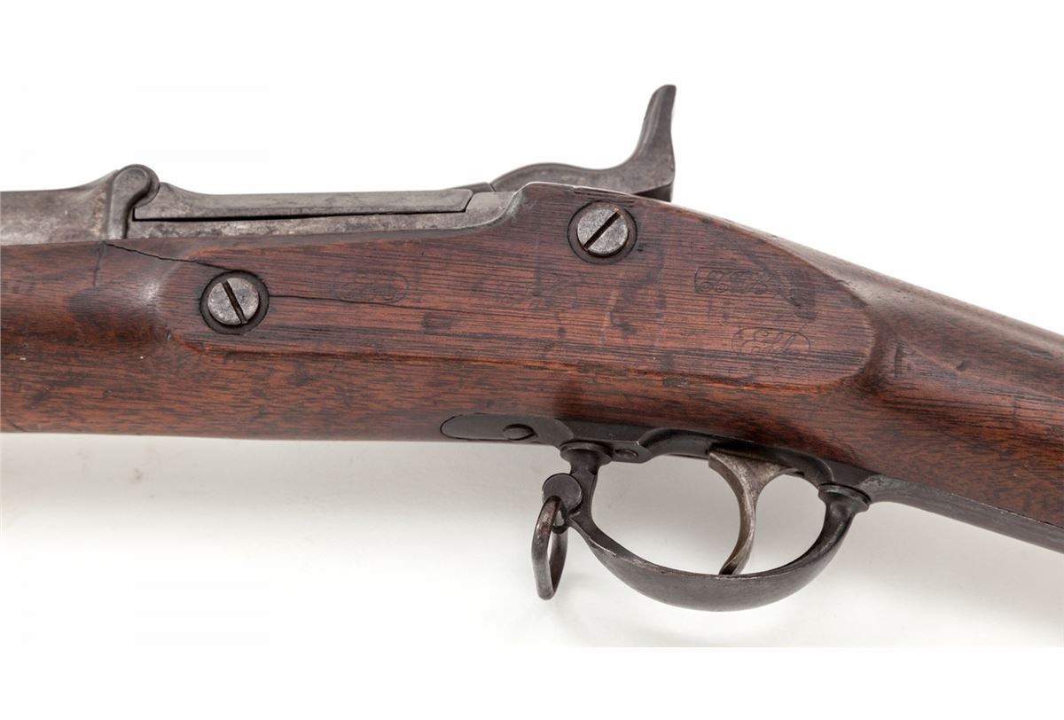 U.S. Model 1868 Trapdoor Rifle, by Springfield, #44422, .50-70 cal., 32-1/2'' barrel, long range type rear sight with adjustable sight leaf, front sight on lug that serves as bayonet stud, 1863 dated lockplate with Federal eagle, 1870 dated breechblock, full-length walnut stock with four cartouches. These rifles were mfg'd from 1868-1872. Condition is very good with overall gray patination. Stock with scuffs and oil darkening and fracture emanating from left side forward lockplate screw that detracts little; stock shows losses to left side of upper tang as well. Action is good, bore is about fine with some areas of pitting. Est.: $1,200-$1,800. (Antique)