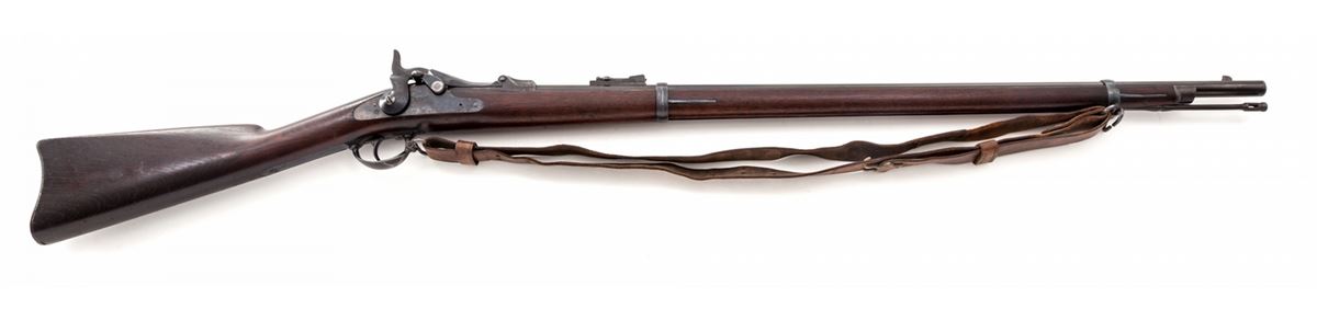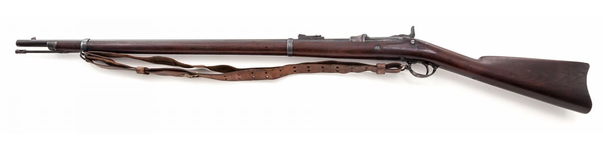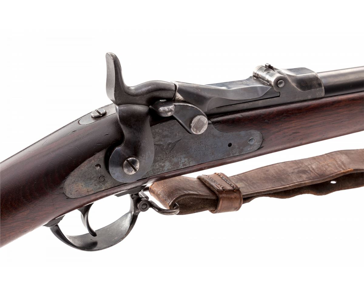 U.S. Model 1873 Springfield Trapdoor Rifle, #63897, .45-70 cal., 32'' barrel, blue and case hardened finish, ESA cartouched walnut stock with short comb and trapless steel buttplate, and period correct leather sling. Condition is excellent retaining approx. 96% original blue. Stock with light scuffs and pressure dings, and light added varnish near cartouche area. Action is crisp, bore is bright. One of the nicest early Trapdoors we have seen. Est.: $2,500-$4,000. (Antique)