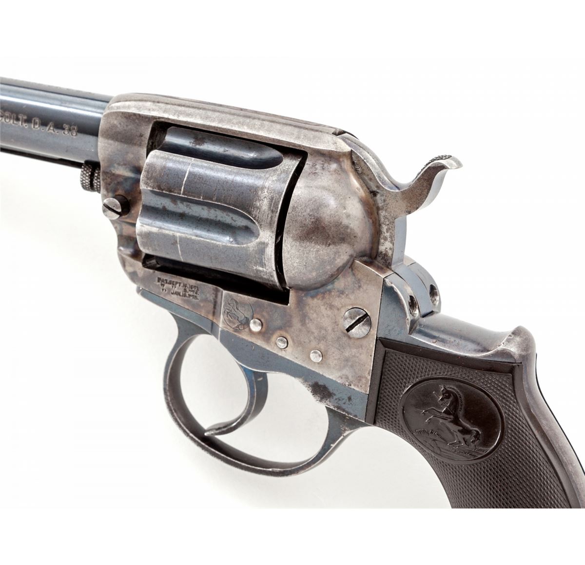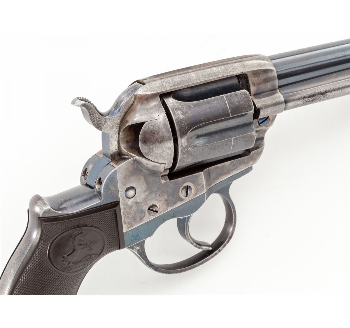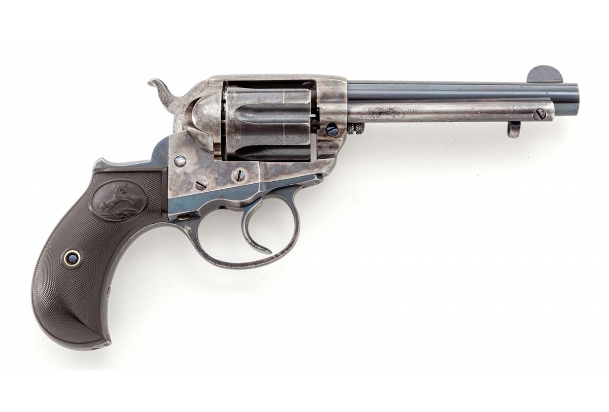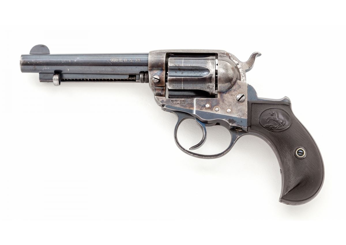 Colt Model 1877 Double Action Revolver, #139036, .38 Colt cal., 4-1/2'' barrel, blue and case hardened finish, with factory checkered hard rubber grips. As shipped to Continental Tobacco Co., New York, on Nov. 14, 1902, with factory letter verifying all features. Condition is fine retaining approx. 92% original blue, with most of the losses to high edges of cylinder, backstrap, and ejector rod housing. Frame retains approx. 85% mostly vivid case colors. Grips with minor flattening, with good double and single action. Bore is fine. Est.: $1,000-$1,500. (C&R)