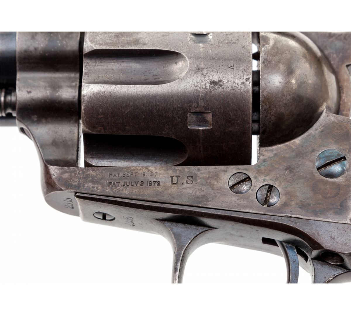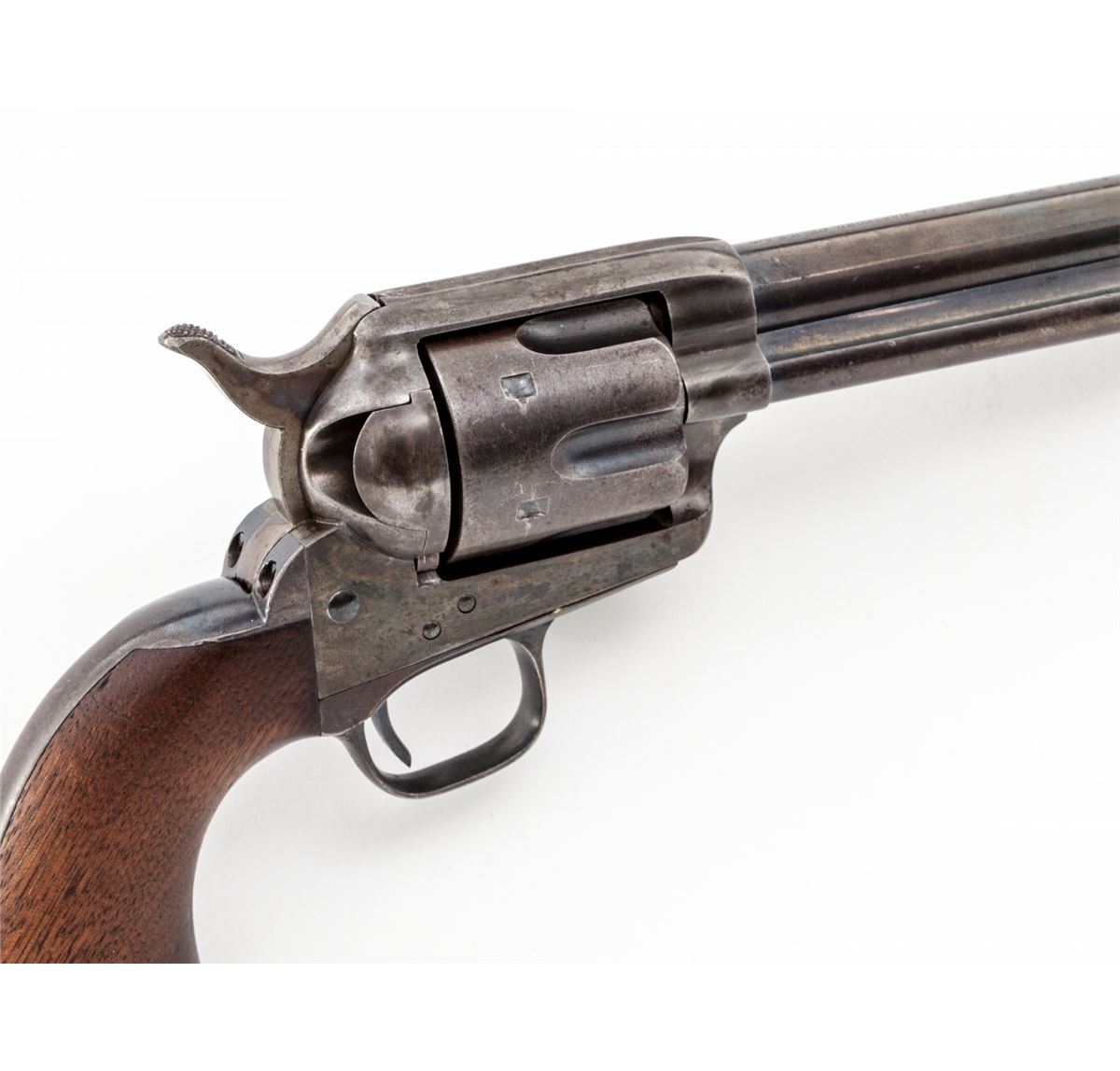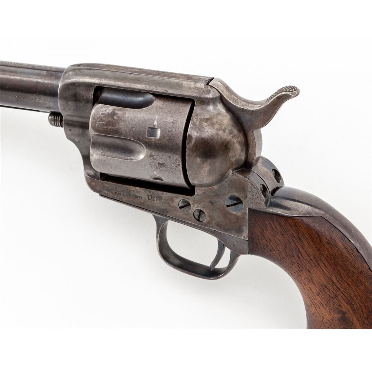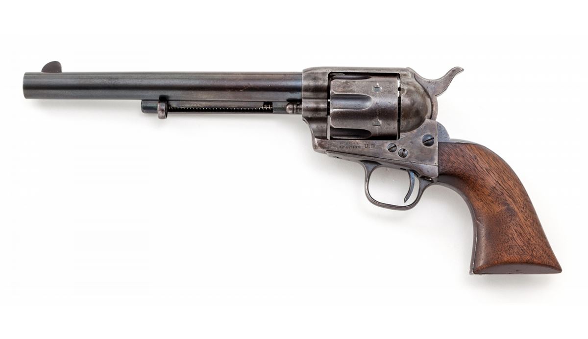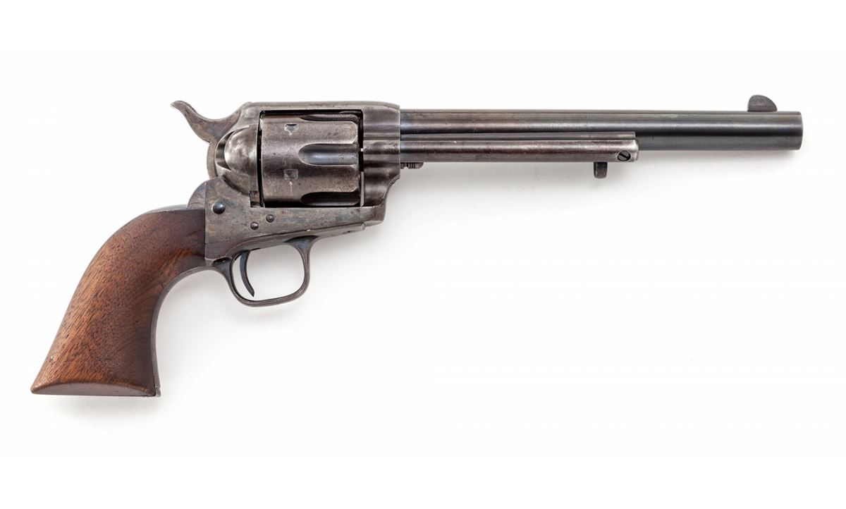 Texas 4th Cavalry Ainsworth Inspected Model 1873 Colt Single Action Revolver, #2885, .45 Colt cal., 7-1/2'' barrel, blue and case hardened finish, with cartouched one-piece walnut grips. According to Cochran, as well as Kopec & Fenn, 8000 revolvers were shipped from the original. July 23, 1873 contract with an estimated serial number range of between no.'s 2337 thru 3437 and were received at the Springfield Armory on Jan. 3, 1874. At that point they were forwarded to the 4th Cavalry as per the Adjutant General's order of Jan. 14, 1874, routed via San Antonio, TX, and issued during the 2nd quarter of 1874. When originally discovered, this revolver had its barrel cut and the original sight had been silver soldered in place on the shortened barrel. Over time our consignor was able to acquire an unissued surplus Ainsworth inspected barrel, which he had installed in place of the altered example. Kopec letter confirms this information and notes that the barrel was cut to 5-1/4'' and not the Artillery length of 5-1/2''. He further states that the cartouche on the grip remains faint but legible, and that at one point, perhaps during the mid-1880s, this revolver was arsenal refinished but executed extremely well with no apparent buffing to any of the metal surfaces. Condition is excellent. Barrel and ejector rod retain approx. 90% blue; cylinder with approx. 85% blue; backstrap and triggerguard show approx. 75% moderately thinning blue. All screws with good color and straight slots. Grips fit exceptionally well showing only light wear. Cartouche with just light to moderate smoothing. Action is crisp, bore is fine to near excellent. Includes copies of all documentation relative to the firearm. This exceptionally scarce and desirable Single Action variant was saved from an ignoble fate by the replacement of one part. Est.: $12,500-$17,500. (Antique)