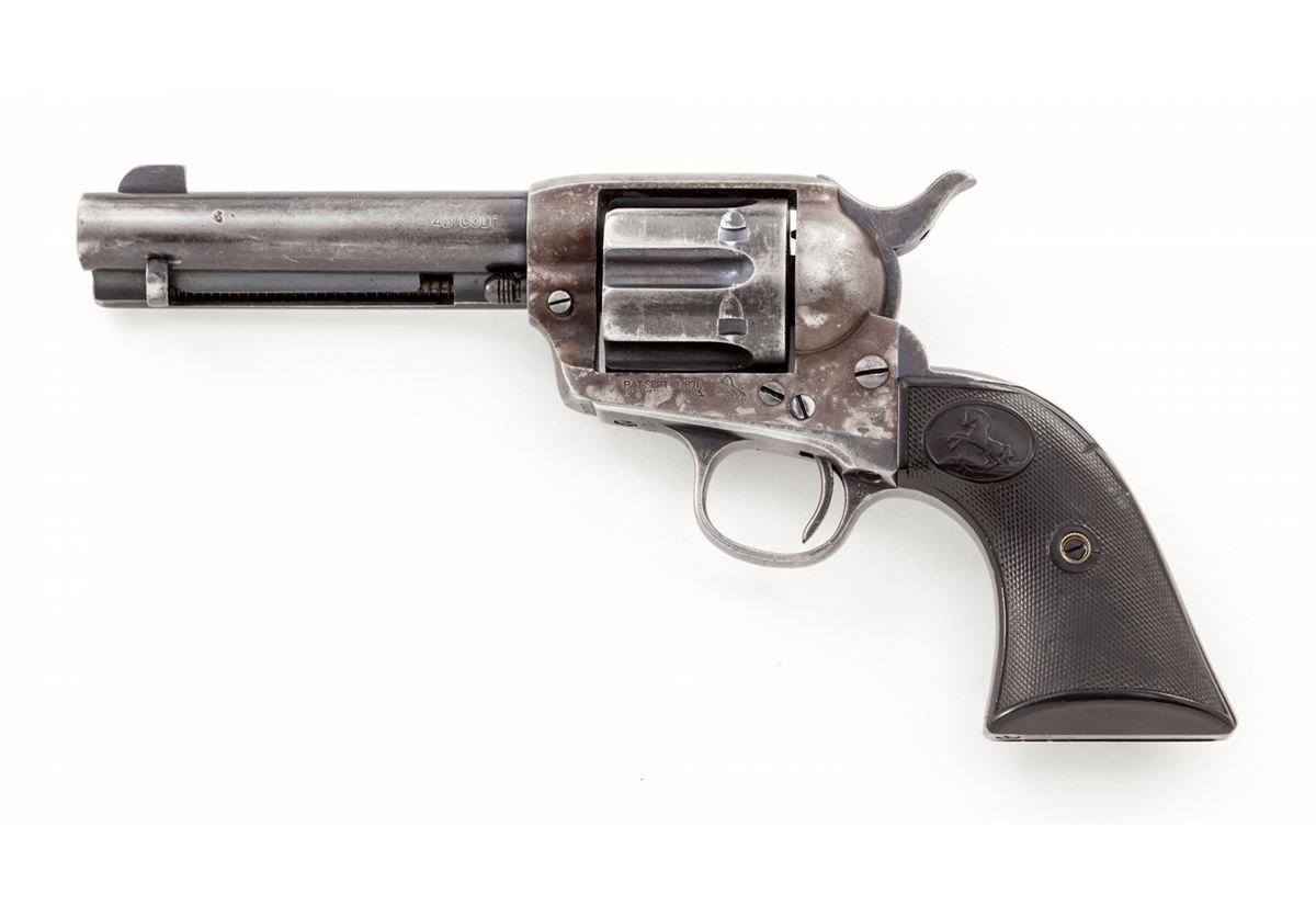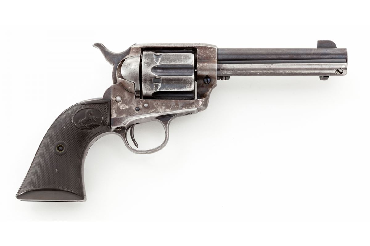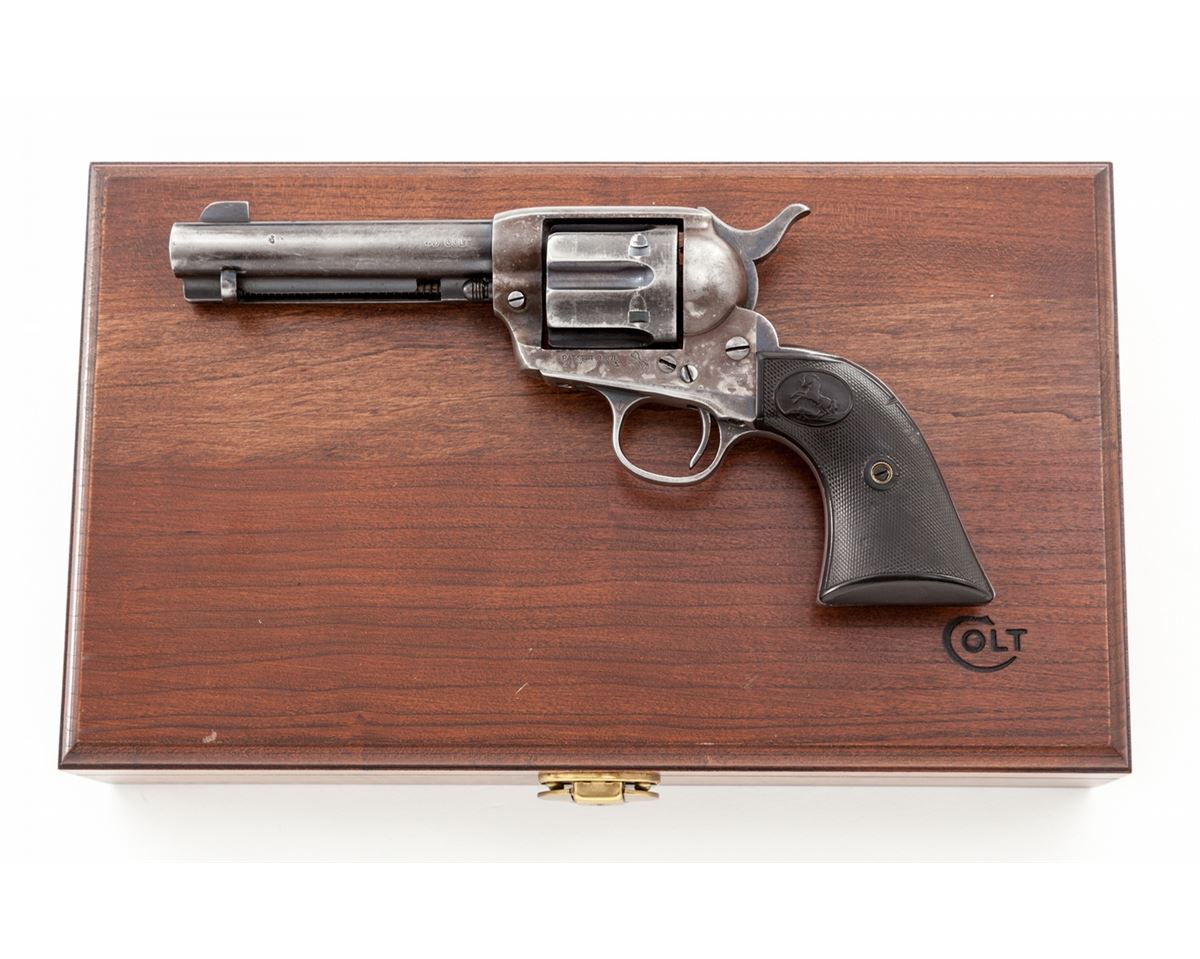 Colt Long Flute Single Action Army Revolver, #330319, .45 Colt cal., 4-3/4'' barrel, blue and case hardened finish, factory checkered hard rubber grips. Mfg'd 1915. Condition is very good to near fine. Barrel and cylinder retain approx. 85% original blue. Case hardened frame with traces of original case colors in protected areas, with the balance having toned a somewhat silvery gray. Backstrap has thinned to approx. 15%-20% blue. Triggerguard retains approx. 20%-30% blue in protected areas. Grips with mild to just moderate flattening. Front sight blade has been flattened for accuracy. Bolt stop screw shows slight deformation. Action is crisp, bore is very good to fine. In more contemporary Colt presentation box. A nice example of a somewhat scarce variation of the famed Colt Single Action revolver. Est.: $4,000-$6,000. (C&R)