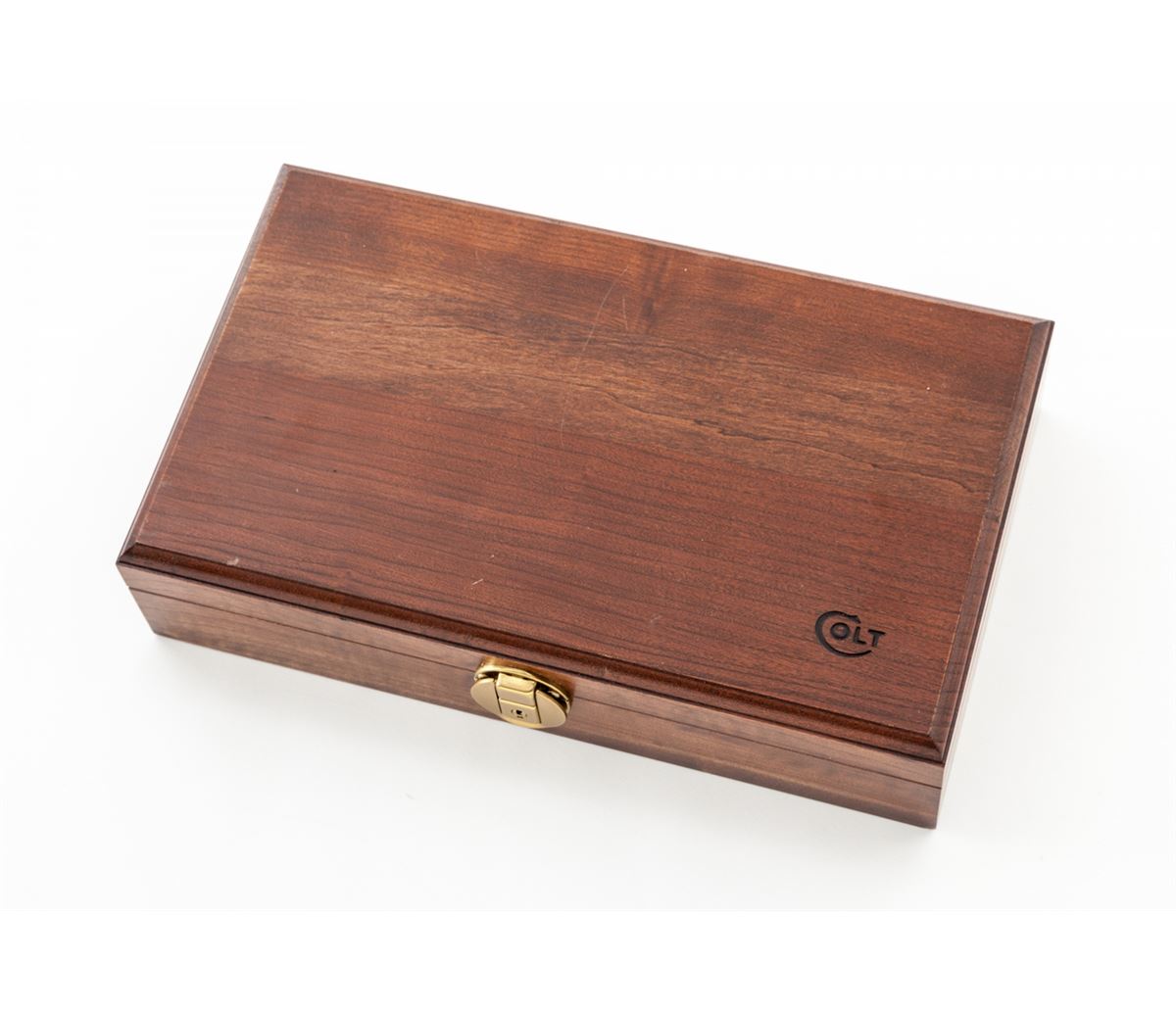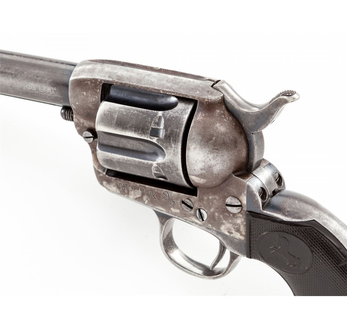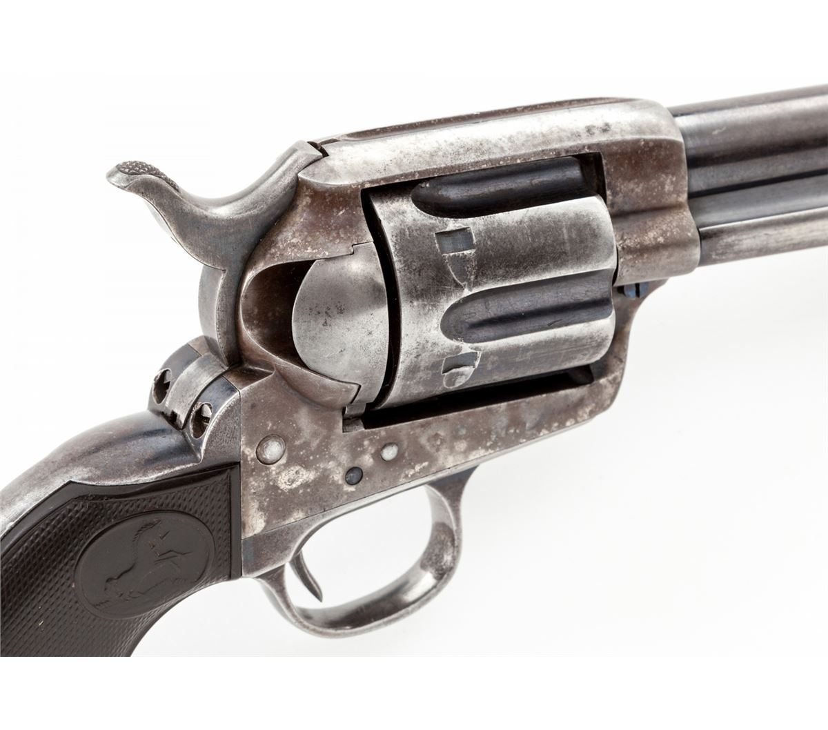 Colt Long Flute Single Action Army Revolver, #330319, .45 Colt cal., 4-3/4'' barrel, blue and case hardened finish, factory checkered hard rubber grips. Mfg'd 1915. Condition is very good to near fine. Barrel and cylinder retain approx. 85% original blue. Case hardened frame with traces of original case colors in protected areas, with the balance having toned a somewhat silvery gray. Backstrap has thinned to approx. 15%-20% blue. Triggerguard retains approx. 20%-30% blue in protected areas. Grips with mild to just moderate flattening. Front sight blade has been flattened for accuracy. Bolt stop screw shows slight deformation. Action is crisp, bore is very good to fine. In more contemporary Colt presentation box. A nice example of a somewhat scarce variation of the famed Colt Single Action revolver. Est.: $4,000-$6,000. (C&R)