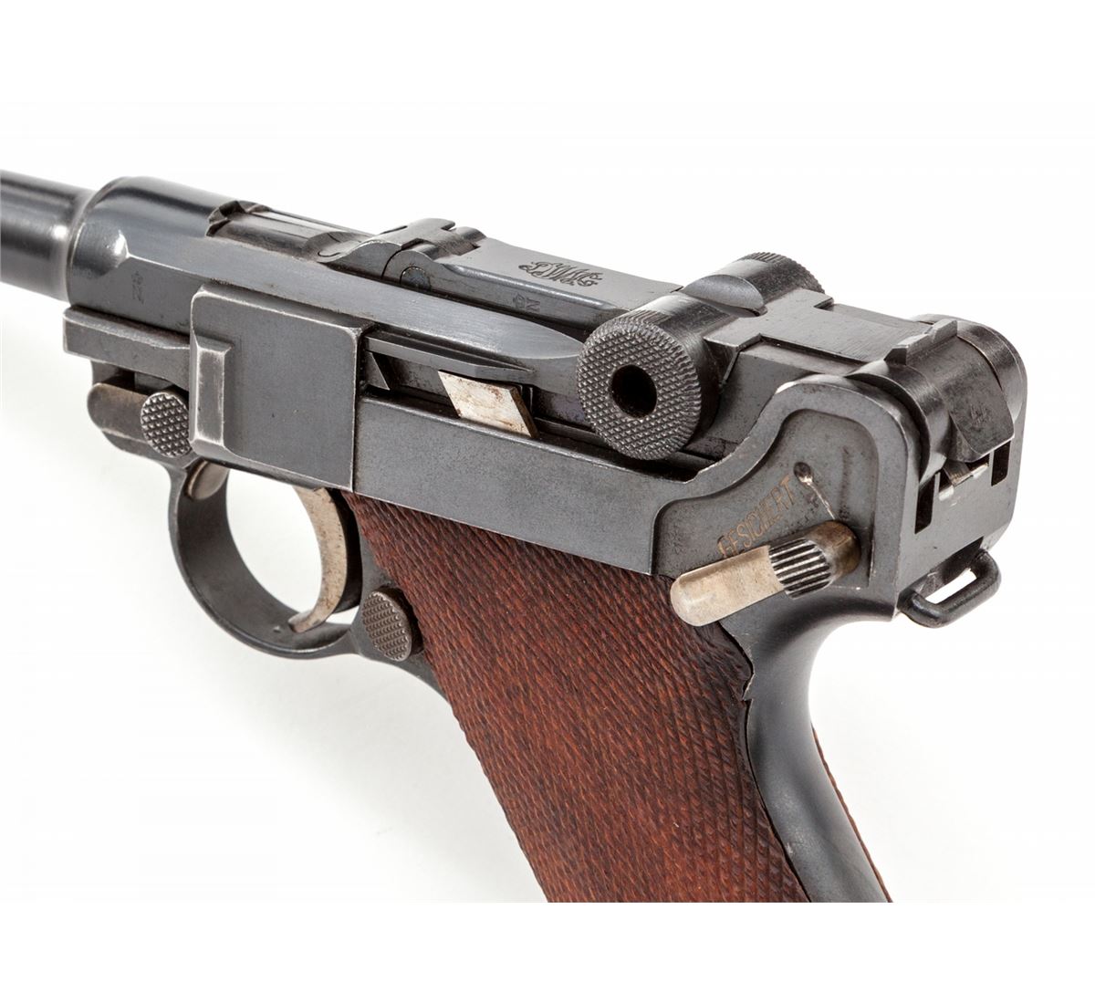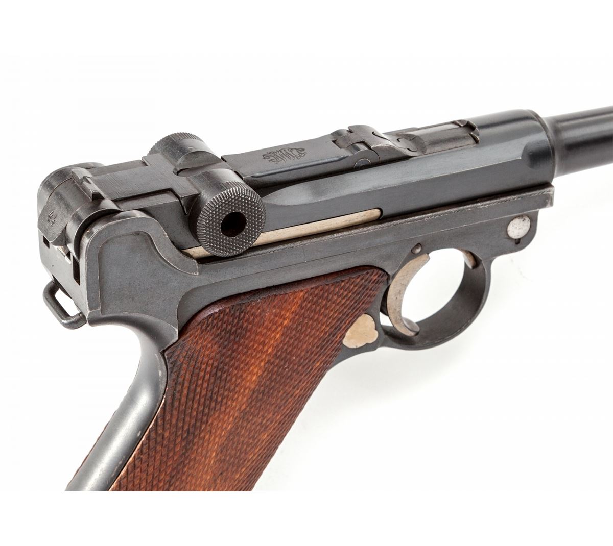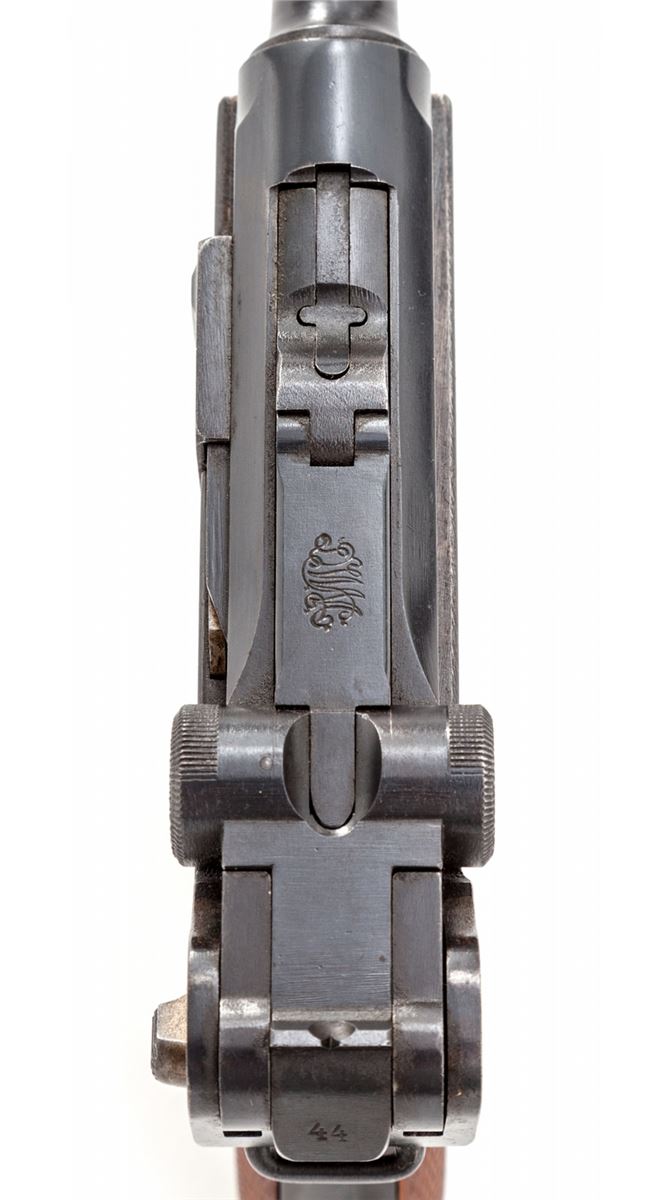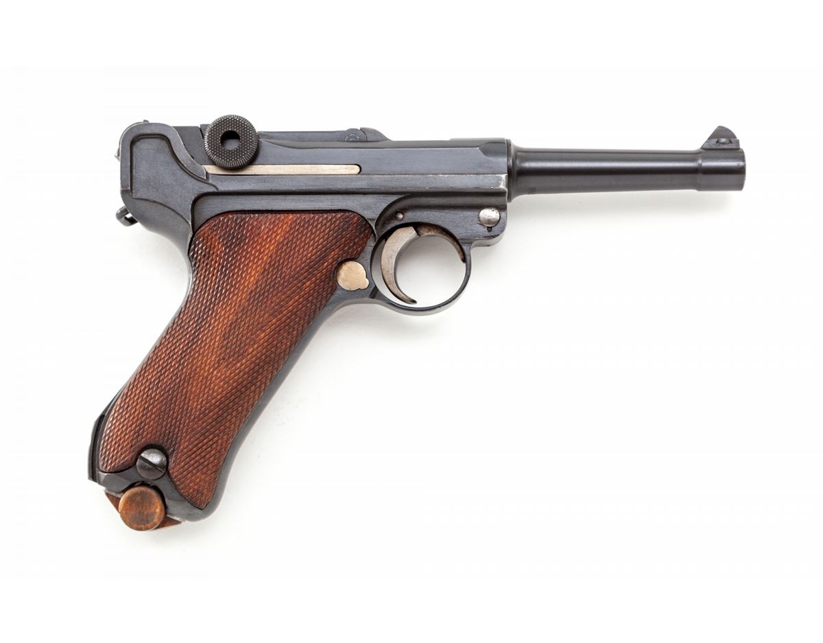1923 Commercial Luger, #84344, 9mm, 4'' barrel, blue finish with straw small parts, walnut grips, nickel-plated magazine with unmarked wood base. ''Germany'' on left side just above thumb safety, blank chamber, DWM marked toggle link, ''Gesichert'' and ''Geladen'' marked safety and extractor, ''(crown)/N'' proofmarks to upper receiver and barrel. Condition is excellent retaining approx. 97% lightly thinning blue, with most of the losses at high edge of sideplate and forward edge of frame. Grips remain mostly crisp with light flattening, and straw parts show little use. Action is crisp, bore is bright. Est.: $1,800-$2,400. (C&R)