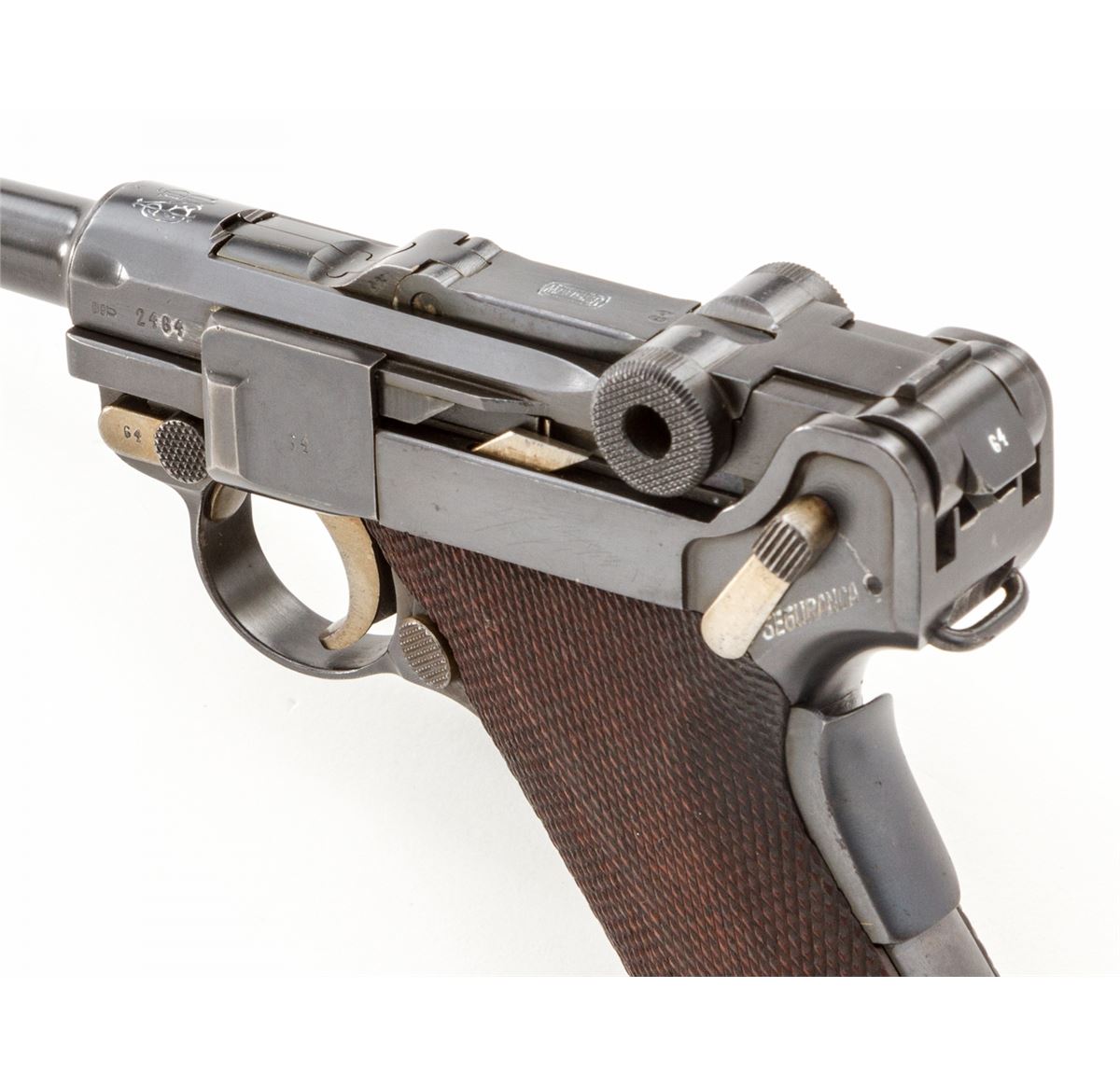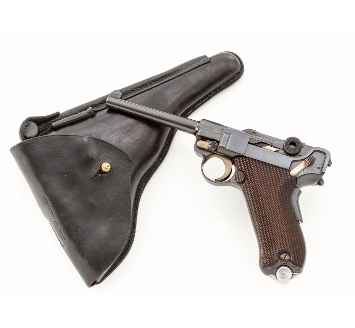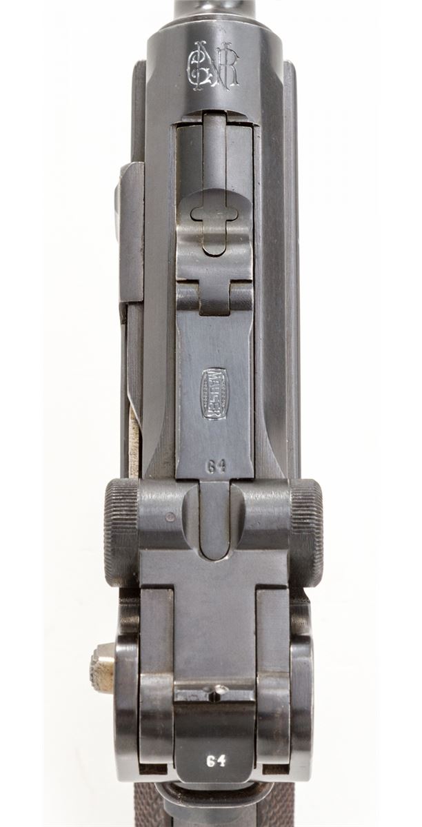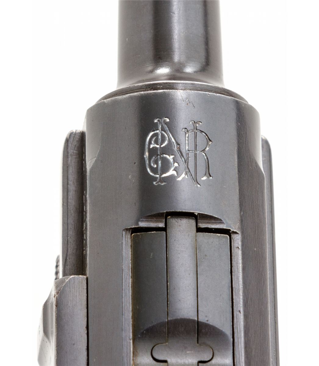 Rare 1906 Mauser Portuguese GNR Luger, #2464v, .30 Luger cal., 4-3/4'' barrel, blue finish with straw small parts, factory checkered walnut grips, and one tin-plated magazine with matching numbered aluminum base. Chamber marked with GNR monogram, Mauser Banner to central toggle link, lower portion of thumb safety marked ''Seguranca'', extractor marked ''Carregada'', ''(crown)/U'' commercial proofmarks. Considered very rare with exactly 564 produced. In correct black leather holster lacking accoutrements. Condition is excellent retaining approx. 97% thinning and toning blue. Grips with mild flattening, and gray toning to fire blue grip screws. Magazine may have been later numbered to match. Action is good, bore is bright. Holster is near excellent. Est.: $3,000-$4,000. (C&R/PPT) (John Siroonian estate)