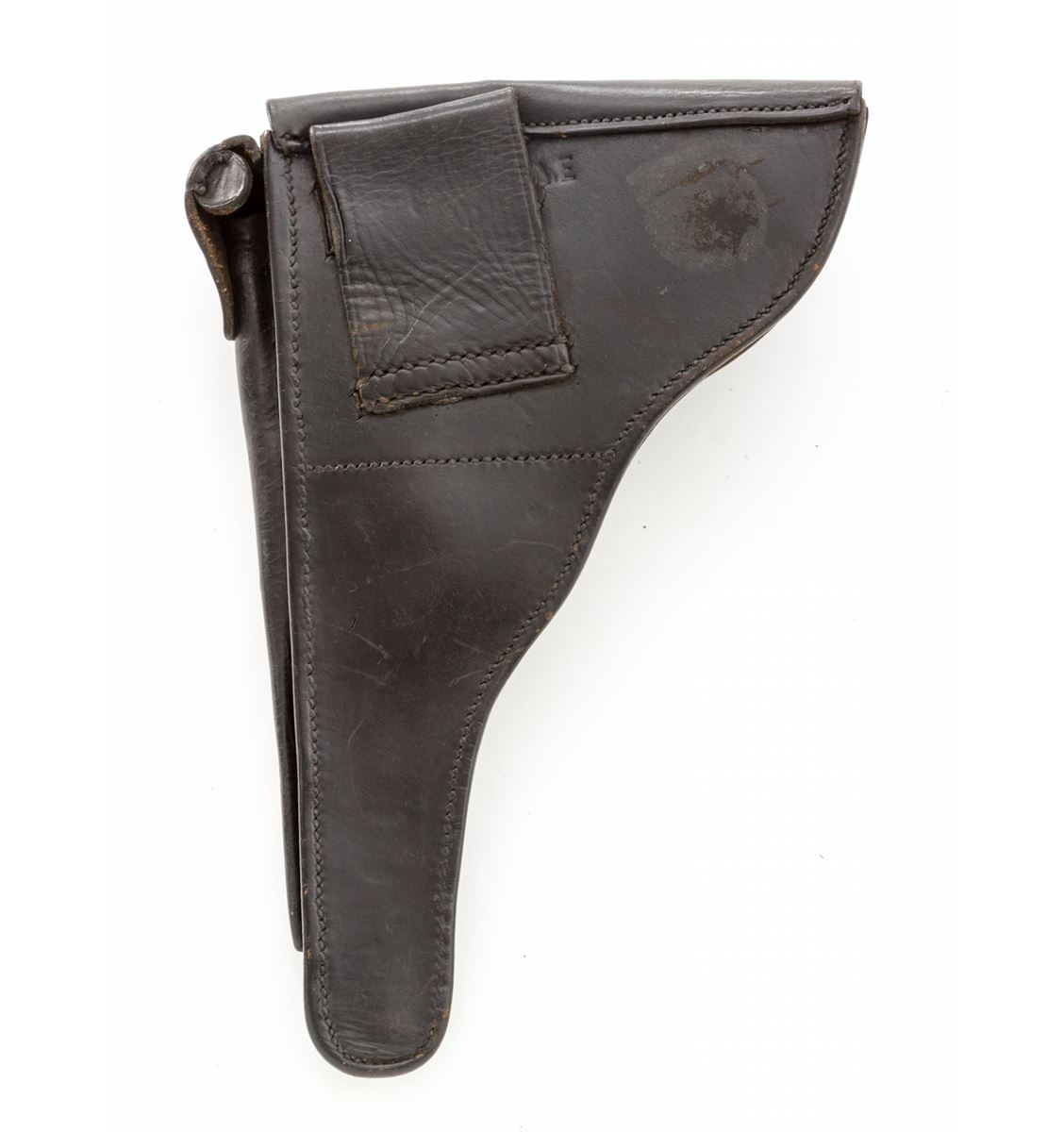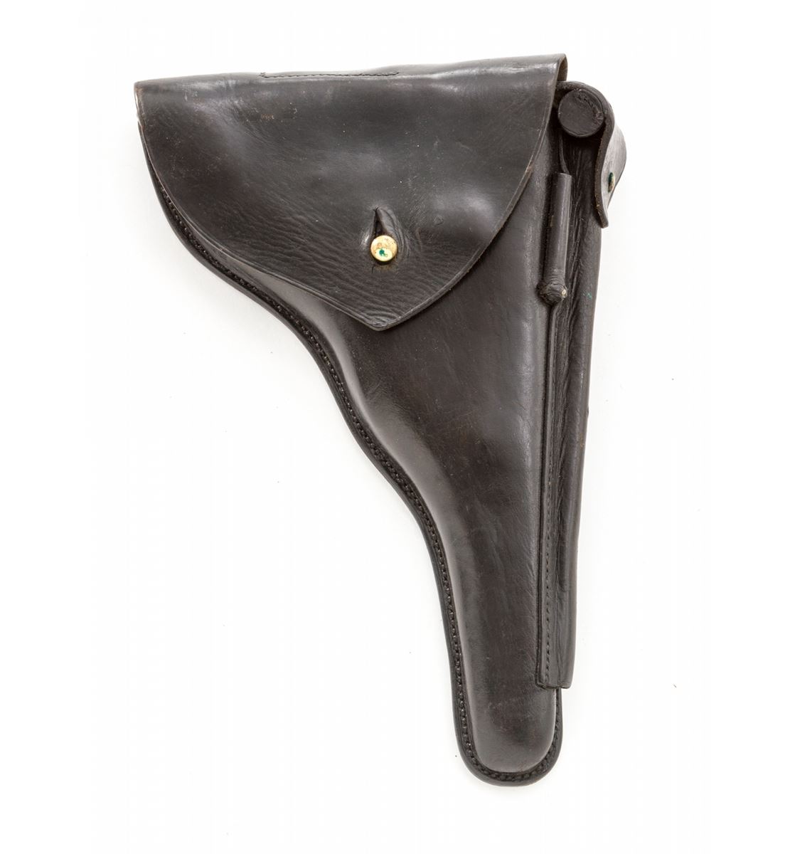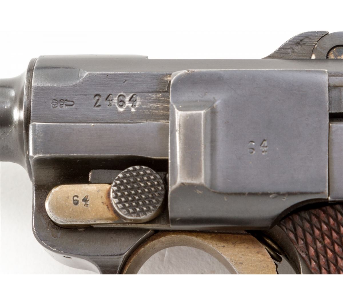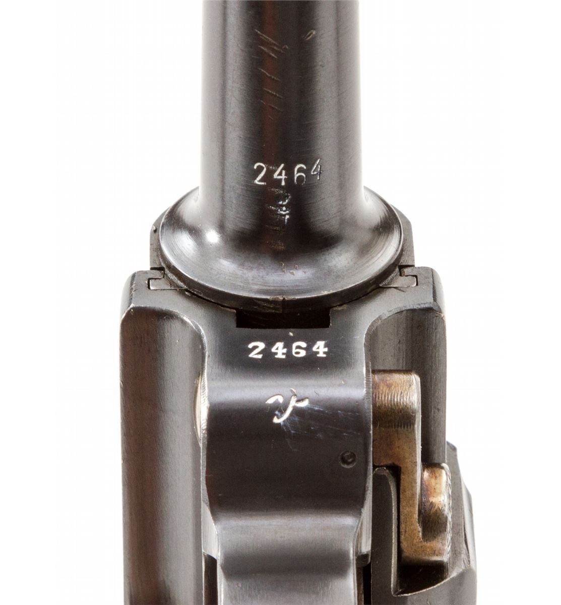 Rare 1906 Mauser Portuguese GNR Luger, #2464v, .30 Luger cal., 4-3/4'' barrel, blue finish with straw small parts, factory checkered walnut grips, and one tin-plated magazine with matching numbered aluminum base. Chamber marked with GNR monogram, Mauser Banner to central toggle link, lower portion of thumb safety marked ''Seguranca'', extractor marked ''Carregada'', ''(crown)/U'' commercial proofmarks. Considered very rare with exactly 564 produced. In correct black leather holster lacking accoutrements. Condition is excellent retaining approx. 97% thinning and toning blue. Grips with mild flattening, and gray toning to fire blue grip screws. Magazine may have been later numbered to match. Action is good, bore is bright. Holster is near excellent. Est.: $3,000-$4,000. (C&R/PPT) (John Siroonian estate)