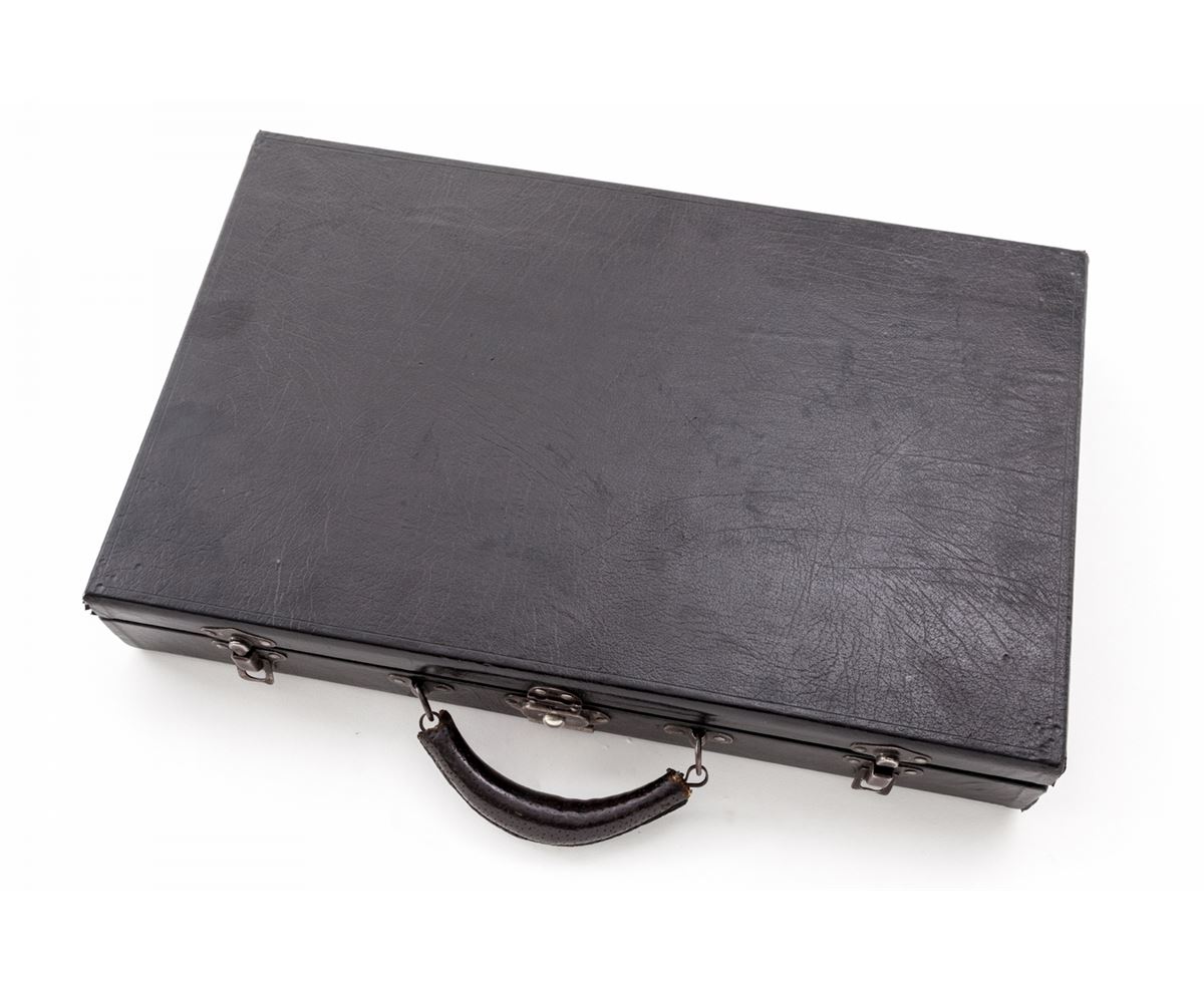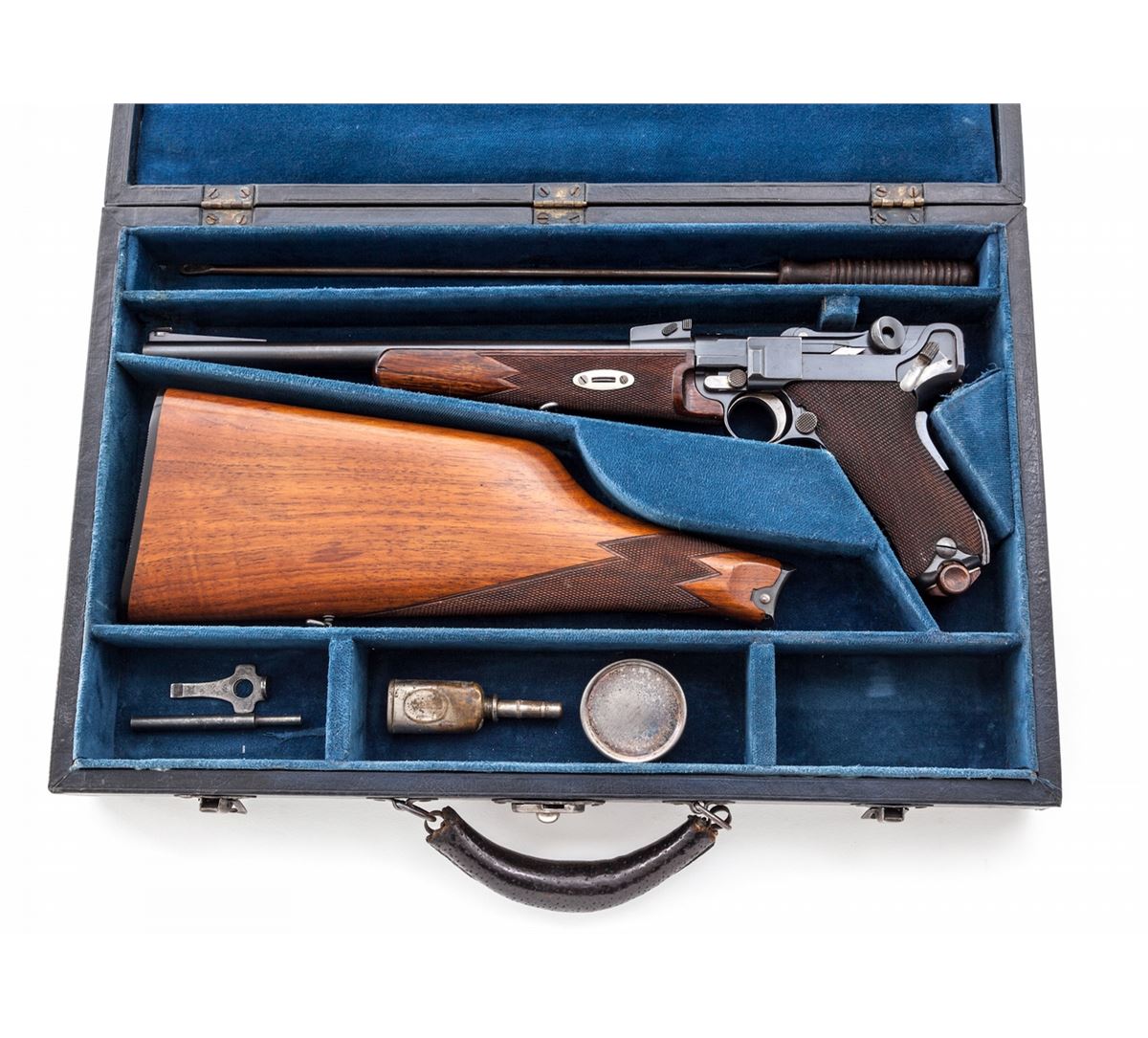 Model 1902 American Eagle Luger Carbine, #24272, .30 Luger cal., 11-3/4'' barrel, blue finish with straw small parts, factory checkered walnut grips, with checkered walnut shoulder stock, and one unmarked nickel-plated magazine with walnut base, with oiler, tool, punch, grease tin, and cleaning rod, in period correct partition casing marked Nolte & Olsen/4703 Third St.-S.F''. American eagle to chamber area, DWM marked toggle, lower portion of thumb safety polished bright, 3-position adjustable rear sight, with long ramp and blue bead front sight; scalloped toggle knobs and grip safety. American eagle variant considered quite scarce. Condition is excellent retaining approx. 98%+ lightly thinning original rust blue, with minor thinning to left and right side of trigger and at base of safety. Front strap shows very mild toning. Action is crisp, bore is very good with mild frosting in the grooves. All visible matching numbers except attaching iron to stock, which is #16. Grips and forend remain mostly crisp and show some oil darkening. Stock is excellent. The 100-year-old case shows light impressions to exterior, minor fading, and light soiling to internal blue material, with moderate patination to brass hinges and external hardware. Est.: $15,000-$20,000. (C&R/PPT) (John Siroonian estate)