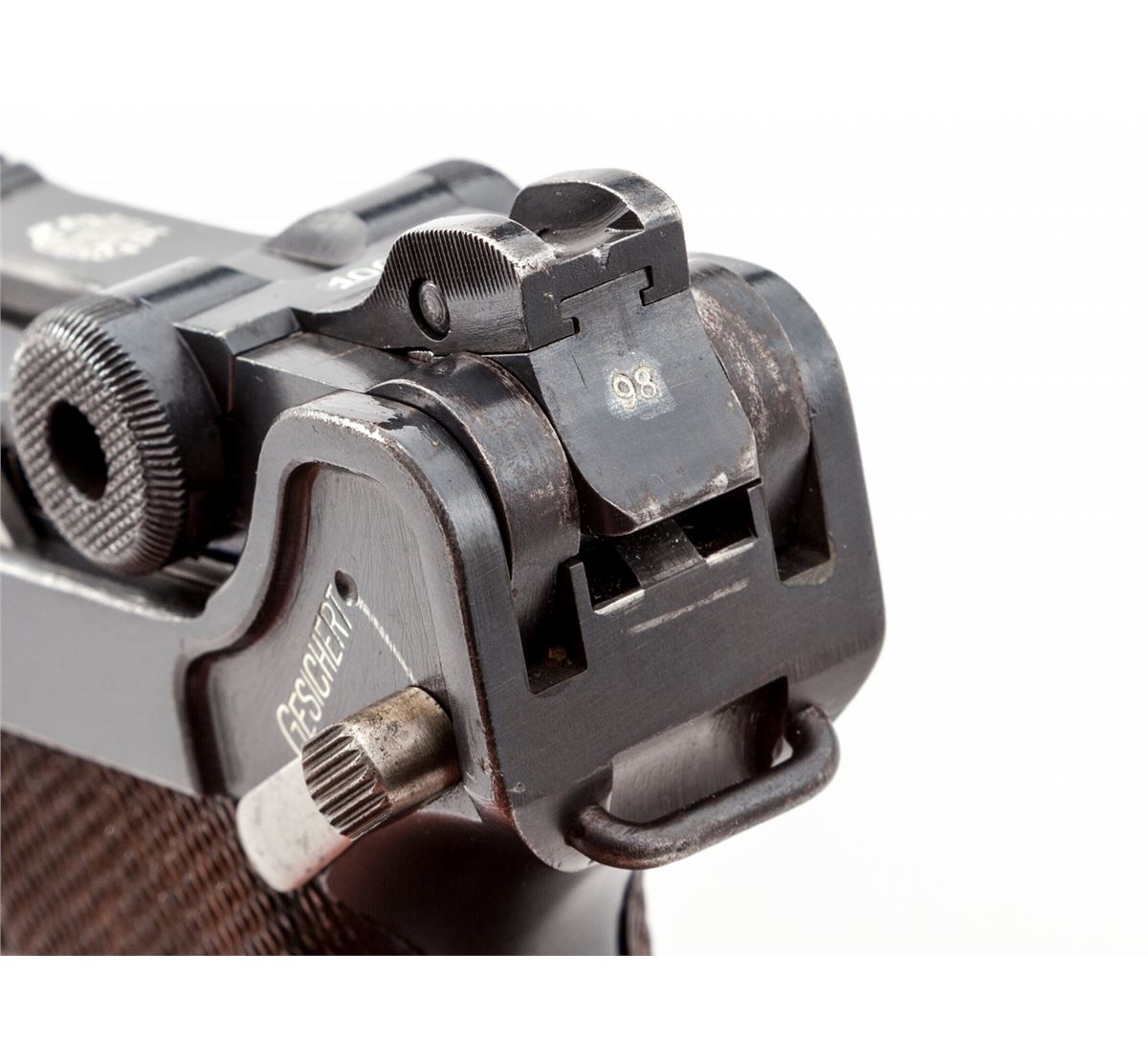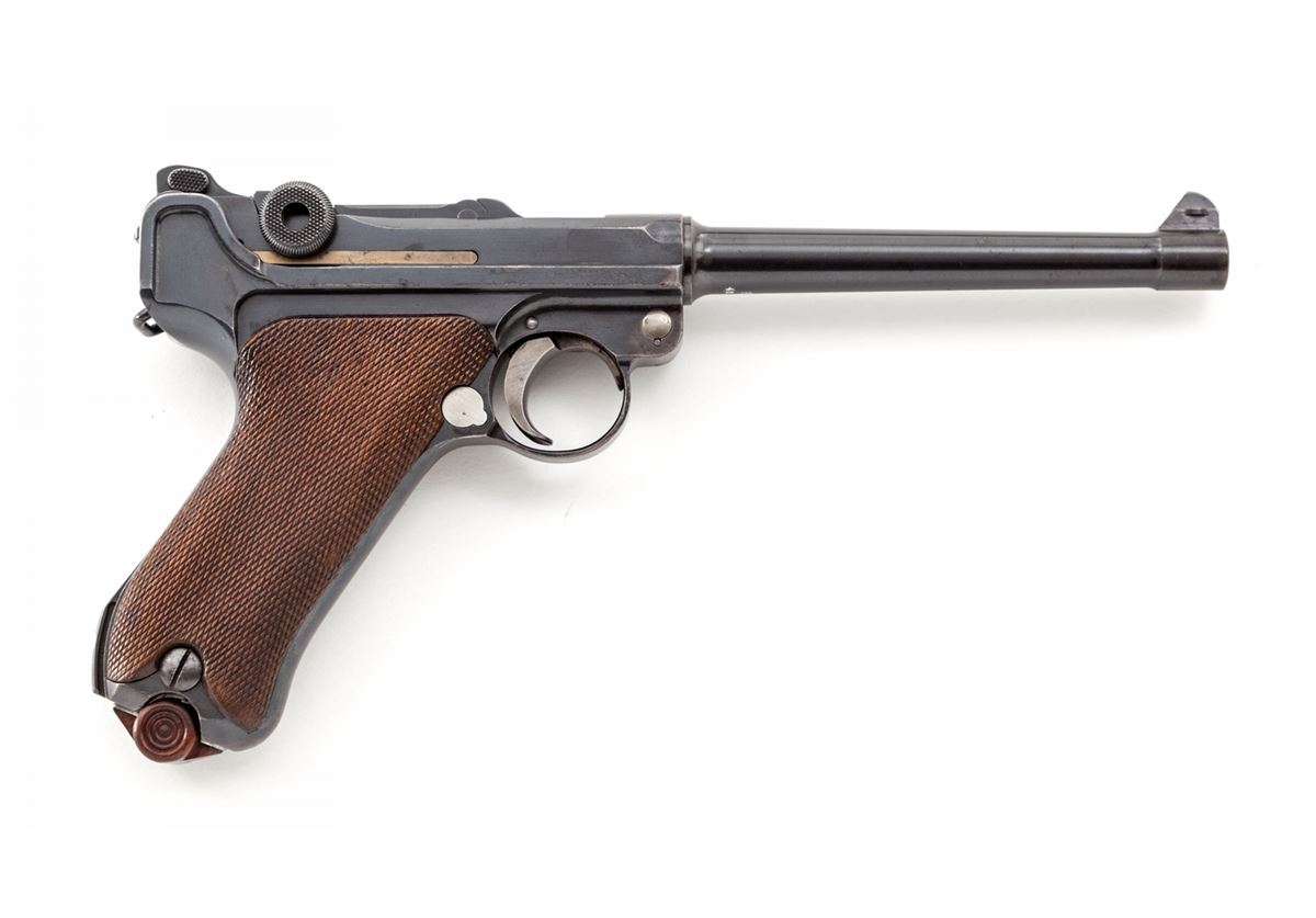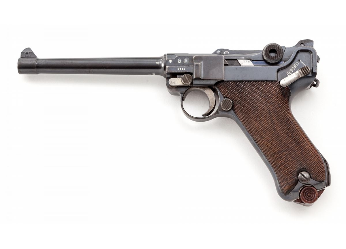 1914 Navy Luger, by DWM, #4298, 9mm, 6'' barrel, blue finish with straw small parts, checkered walnut grips, and one correct matching numbered tin-plated magazine with ringed walnut base and naval proofmark. Top of chamber marked 1916, central toggle link marked DWM, with two-position graduated rear sight, and ''(crown)/M'' proofmarks. Forward left portion of frame and front sight base marked ''1916''. Considered quite scarce with only 8000 mfg'd in 1916. Condition is excellent retaining approx. 97% lightly thinning and toning blue, with some thinning in actioning areas. Grips with very minor flattening. All visible matching numbers. Action is crisp, bore shows some frosting in the grooves as is typical with this period military firearm. Est.: $3,000-$5,000. (C&R/PPT) (John Siroonian estate)