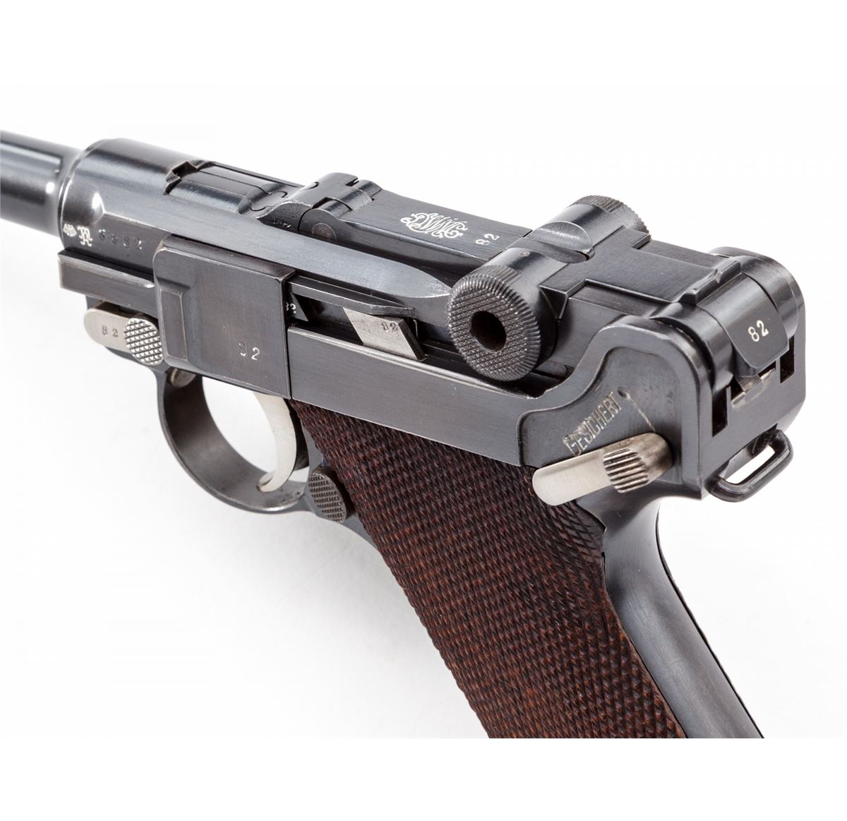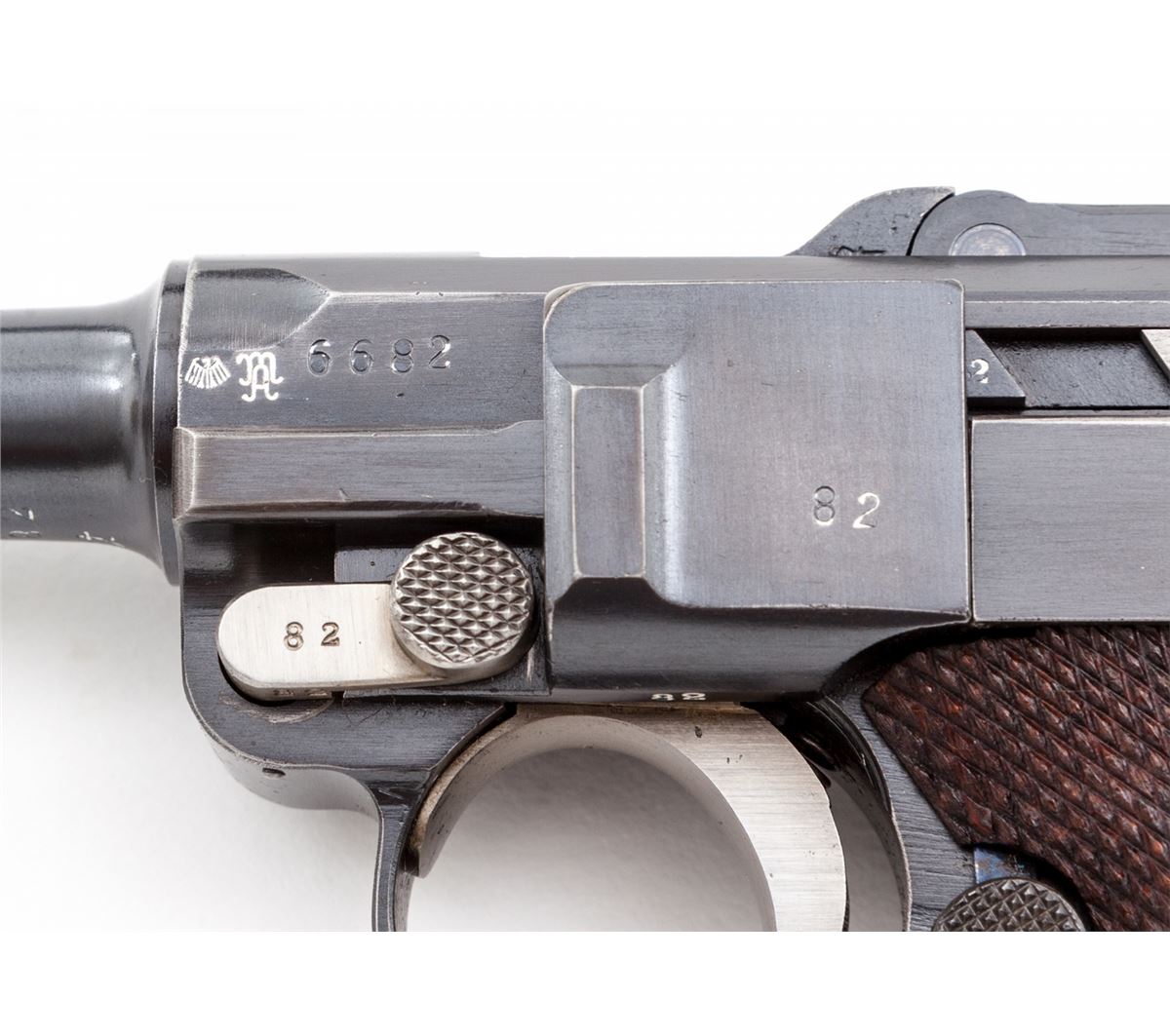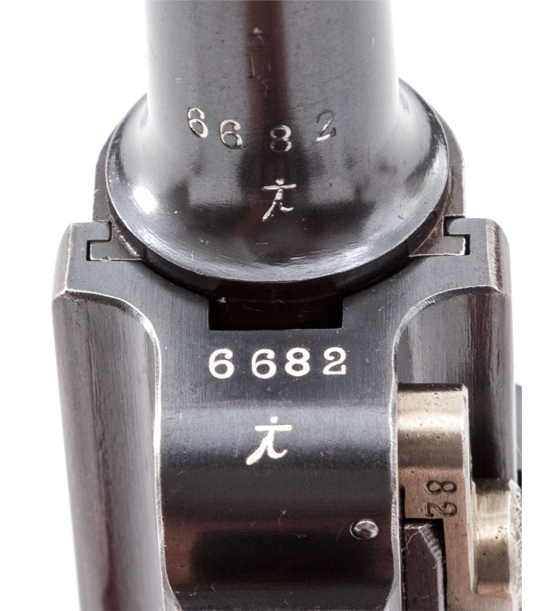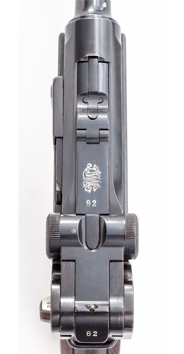 Military & Police No Date Navy Marine Arsenal Luger, #6682t, 9mm, 4'' barrel, blue finish with straw small parts, checkered walnut grips, with one matching numbered tin-plated aluminum based magazine. Chamber area is blank, central toggle link marked DWM, standard ''Gesichert'' and ''Geladen'' markings to safety and extractor, with additional ''M/A'' (Marine Arsenal) markings to left side upper receiver, and ''O-156'' markings to front strap representing the Optsee Fleet inventory number. This particular variation is seldom seen and considered by collectors to be very rare, however the quantity made is unknown with few in collector's hands. Condition is excellent showing light thinning and toning to arsenal finish at high edges; magazine with light rework as well. Grips with mild flattening. Action is crisp, bore is very good to fine showing only light marks in grooves. All visible matching numbers. Est.: $2,000-$4,000. (C&R/PPT) (John Siroonian estate)