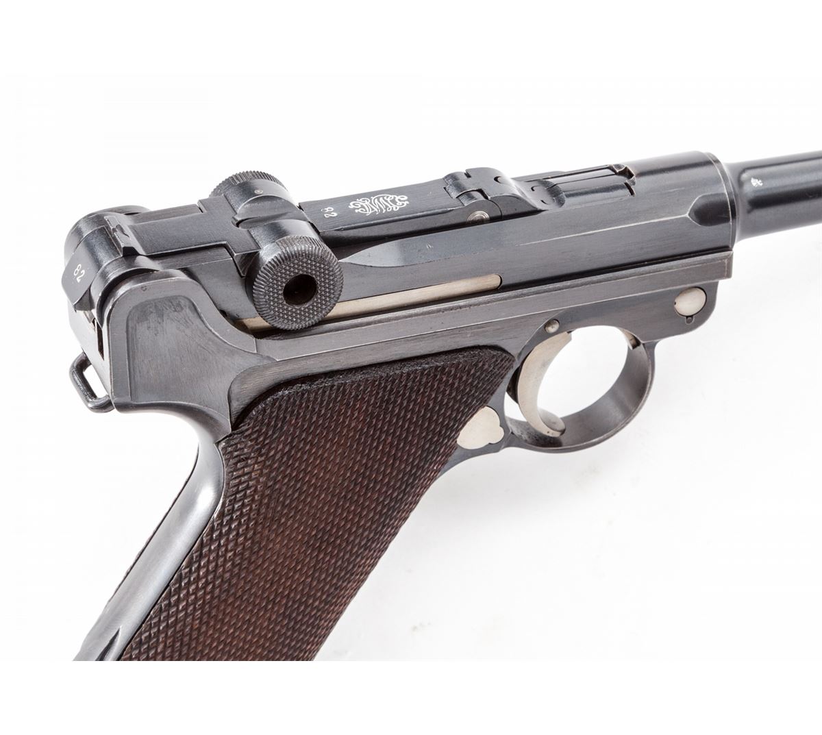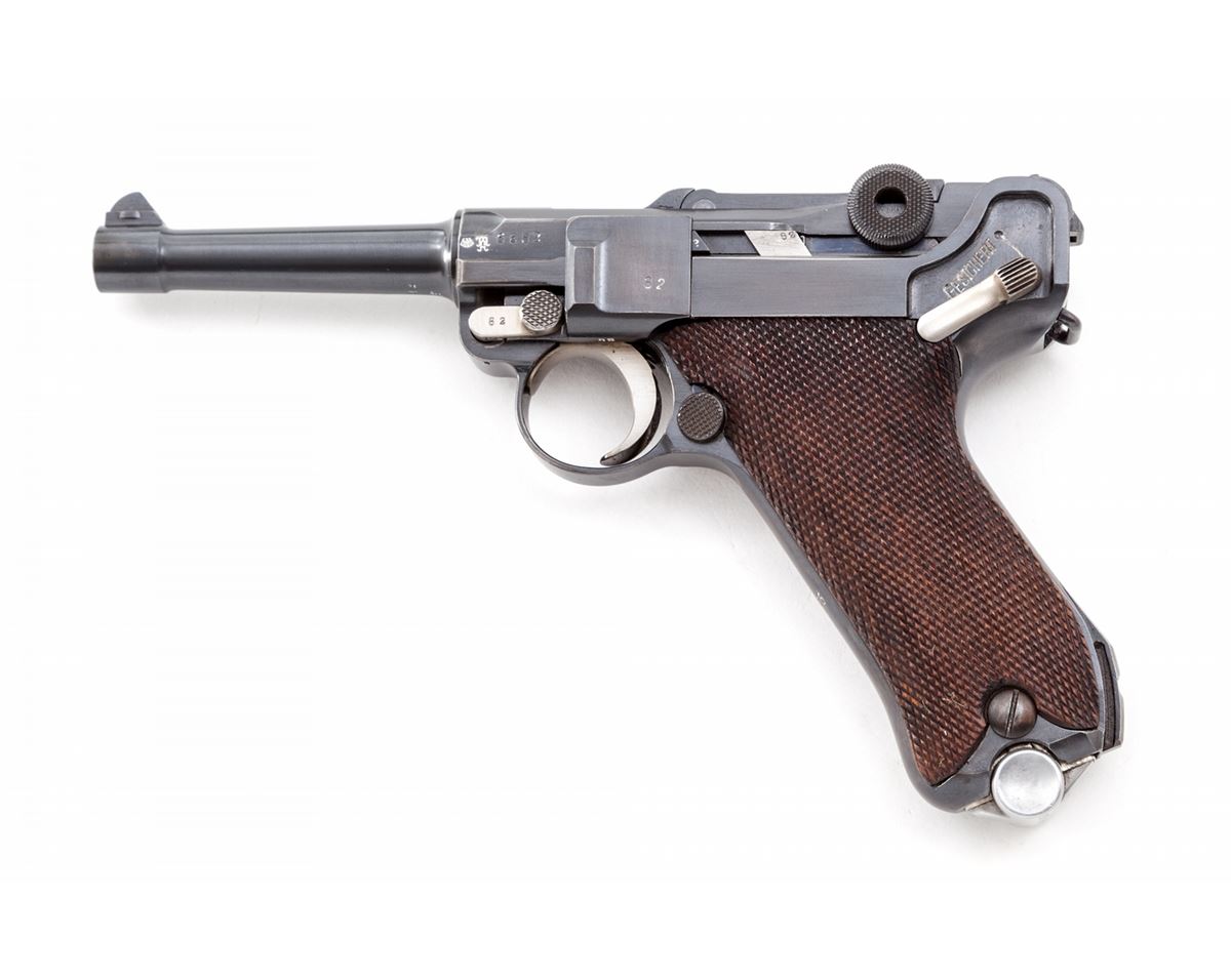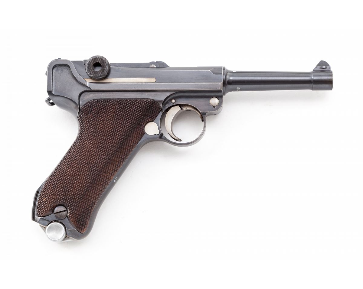 Military & Police No Date Navy Marine Arsenal Luger, #6682t, 9mm, 4'' barrel, blue finish with straw small parts, checkered walnut grips, with one matching numbered tin-plated aluminum based magazine. Chamber area is blank, central toggle link marked DWM, standard ''Gesichert'' and ''Geladen'' markings to safety and extractor, with additional ''M/A'' (Marine Arsenal) markings to left side upper receiver, and ''O-156'' markings to front strap representing the Optsee Fleet inventory number. This particular variation is seldom seen and considered by collectors to be very rare, however the quantity made is unknown with few in collector's hands. Condition is excellent showing light thinning and toning to arsenal finish at high edges; magazine with light rework as well. Grips with mild flattening. Action is crisp, bore is very good to fine showing only light marks in grooves. All visible matching numbers. Est.: $2,000-$4,000. (C&R/PPT) (John Siroonian estate)