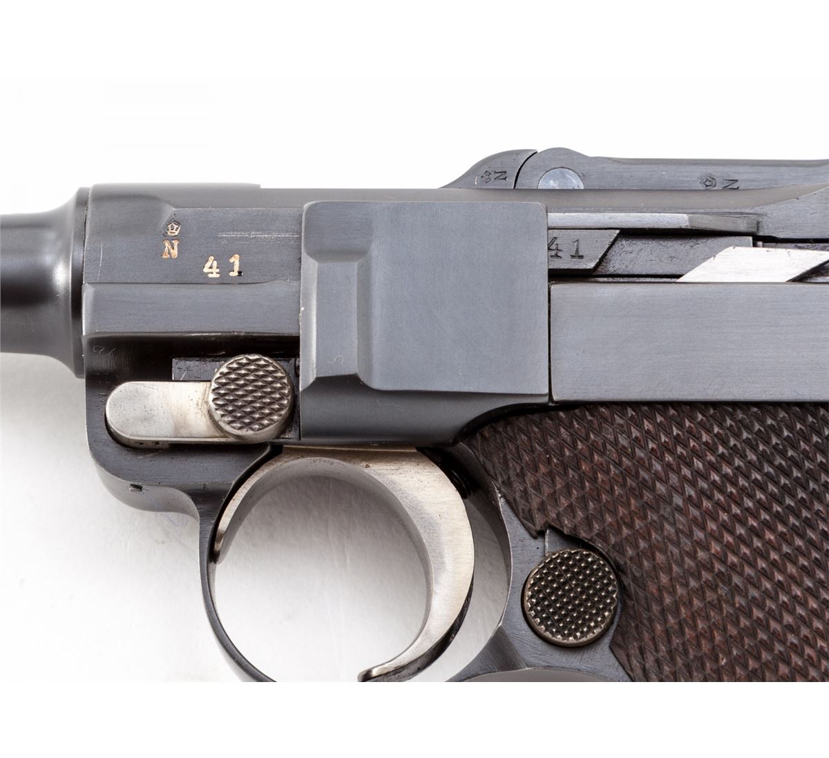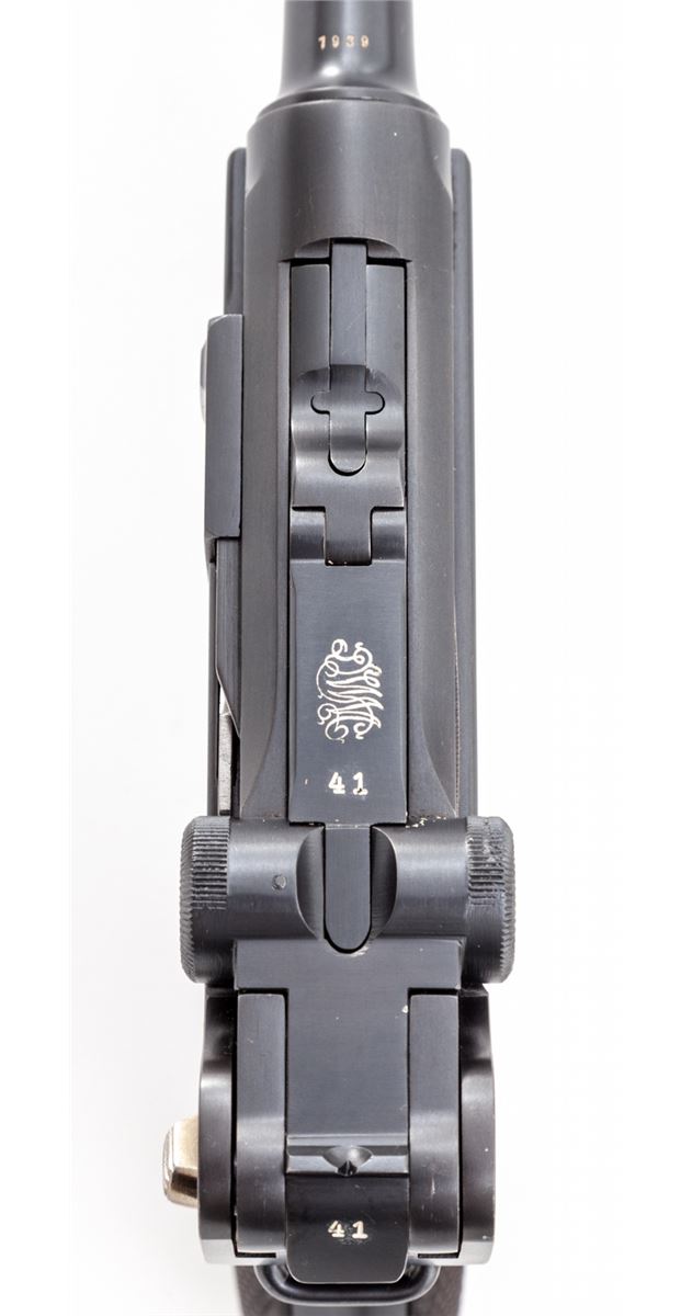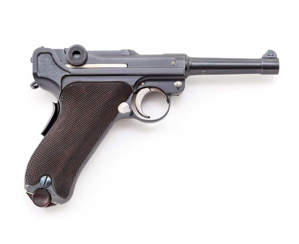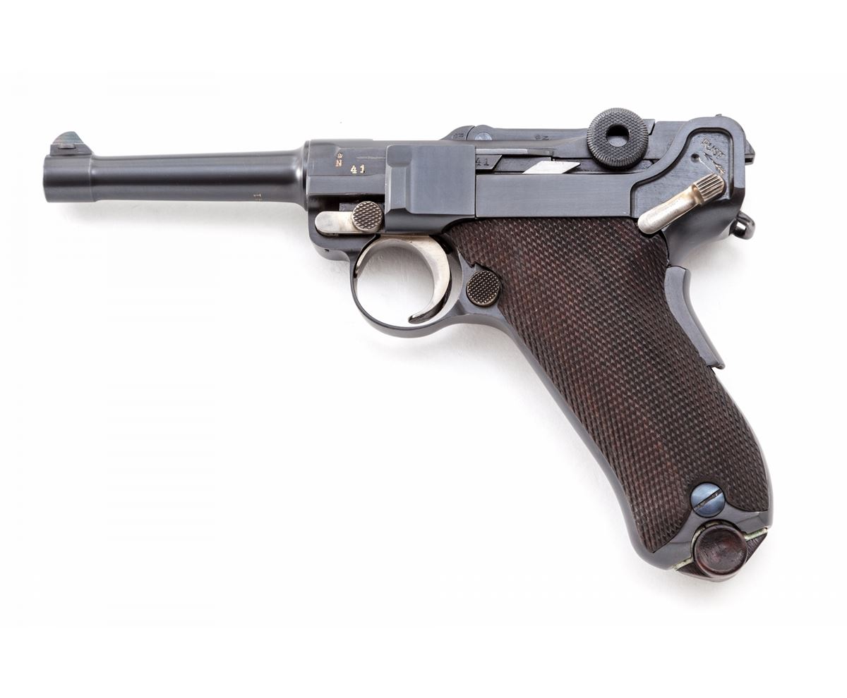 1928 Dutch East Indies Luger, #10641, 9mm, 4'' barrel, blue finish with straw small parts, factory checkered walnut grips, with one tin-plated unmarked wood based magazine. Considered somewhat rare with approx. 3820 mfg'd. Ordered in 1928, this variation 1906 pattern Luger was one of the last produced by DWM. Chamber area is blank, DWM marking to toggle, ''KOL'' monogram to upper right receiver and known by collectors as a ''Dutch Colonial'' proofmark; upper safety area marked ''Rust'' with arrow pointing to the Safe upper position; extractor marked ''Geladen'' to both sides, rear portion of barrel marked 1939, left side of upper receiver with ''(crown)/N'' commercial proofmark. Condition is excellent as showing evidence of at least partial restoration with added rust blue to metal surfaces. Straw small parts show thinning to trigger and at base of thumb safety. Grips remain mostly crisp. Action is tight, bore is fine to near excellent. It is interesting to note that many of these found their way into Japanese hands after the fall of the Dutch East Indies. Est.: $3,500-$5,000. (C&R/PPT) (John Siroonian estate)