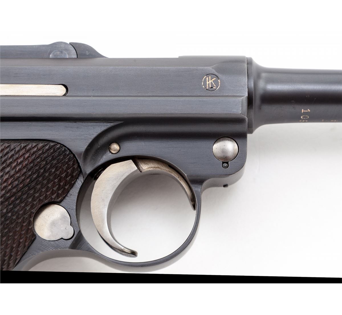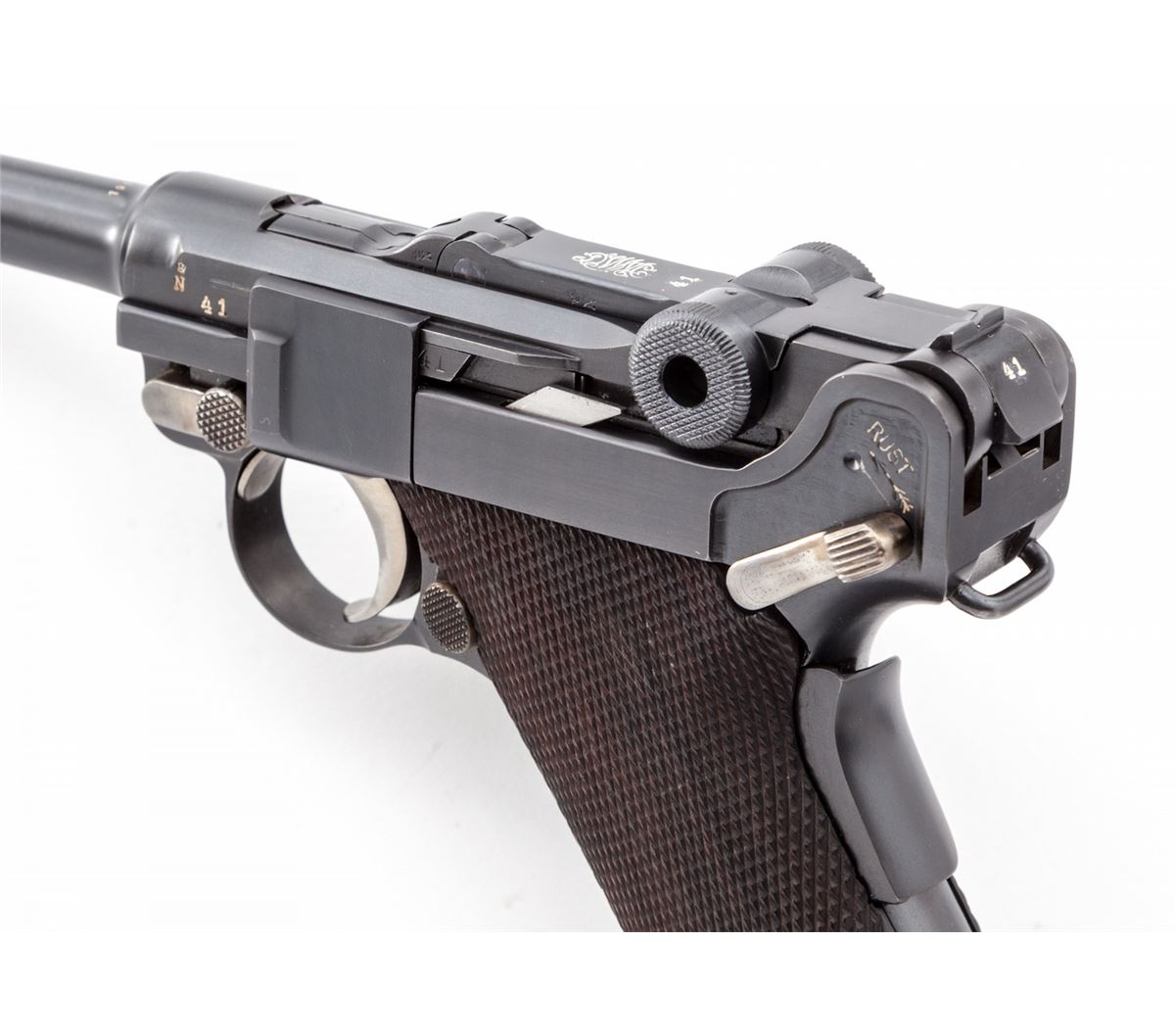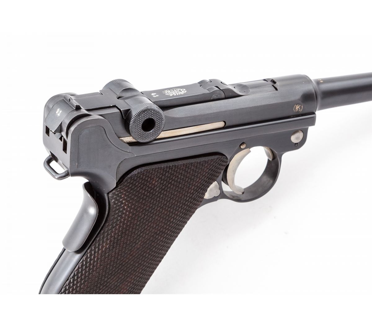 1928 Dutch East Indies Luger, #10641, 9mm, 4'' barrel, blue finish with straw small parts, factory checkered walnut grips, with one tin-plated unmarked wood based magazine. Considered somewhat rare with approx. 3820 mfg'd. Ordered in 1928, this variation 1906 pattern Luger was one of the last produced by DWM. Chamber area is blank, DWM marking to toggle, ''KOL'' monogram to upper right receiver and known by collectors as a ''Dutch Colonial'' proofmark; upper safety area marked ''Rust'' with arrow pointing to the Safe upper position; extractor marked ''Geladen'' to both sides, rear portion of barrel marked 1939, left side of upper receiver with ''(crown)/N'' commercial proofmark. Condition is excellent as showing evidence of at least partial restoration with added rust blue to metal surfaces. Straw small parts show thinning to trigger and at base of thumb safety. Grips remain mostly crisp. Action is tight, bore is fine to near excellent. It is interesting to note that many of these found their way into Japanese hands after the fall of the Dutch East Indies. Est.: $3,500-$5,000. (C&R/PPT) (John Siroonian estate)