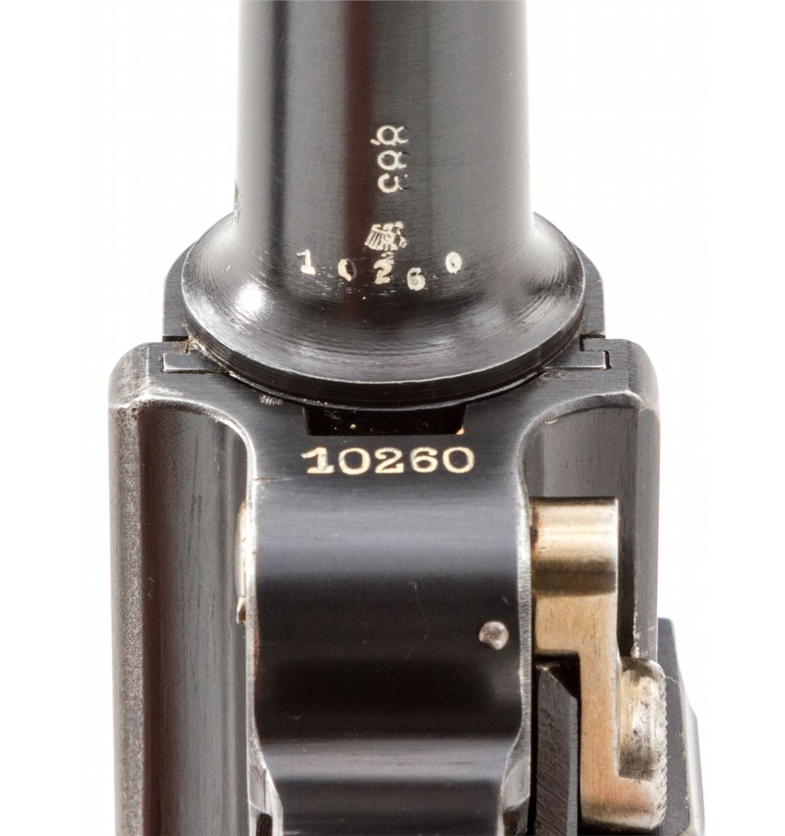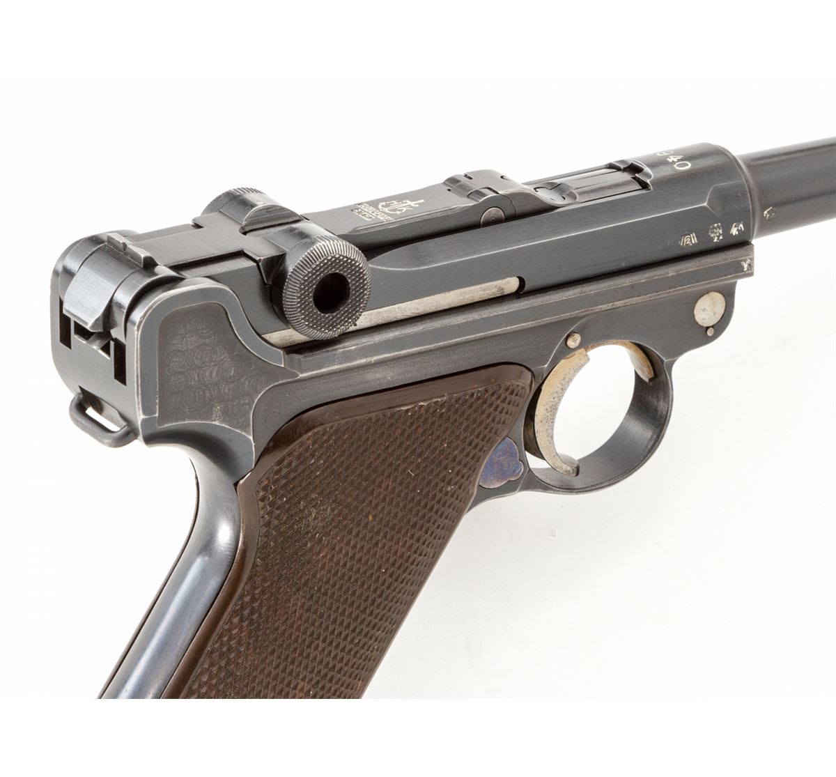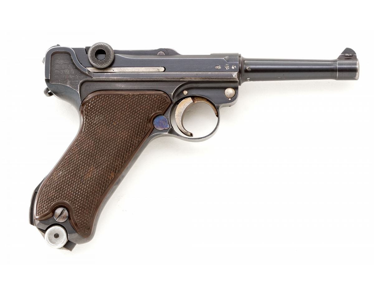 Rare 1940 Dated Krieghoff Luger, #10260, 9mm, 4'' barrel, salt blue finish with straw small parts, factory molded brown checkered plastic grips with smooth border, and two matching numbered blue-bodied extruded magazines with pinned aluminum bases. Chamber dated 1940, standard Krieghoff anchor to central toggle, ''Gesichert/Geladen'' marked thumb safety and extractor, with full complement of Luftwaffe component and inspection markings. In 1940 dated brown leather holster. Considered rare with only 1100 mfg'd. Condition is excellent retaining approx. 98% original lightly toning blue. Grips and action are crisp, bore is bright. Holster with tight stitching and light scuffs and scratches. Est.: $5,000-$7,500. (C&R/PPT) (John Siroonian estate)