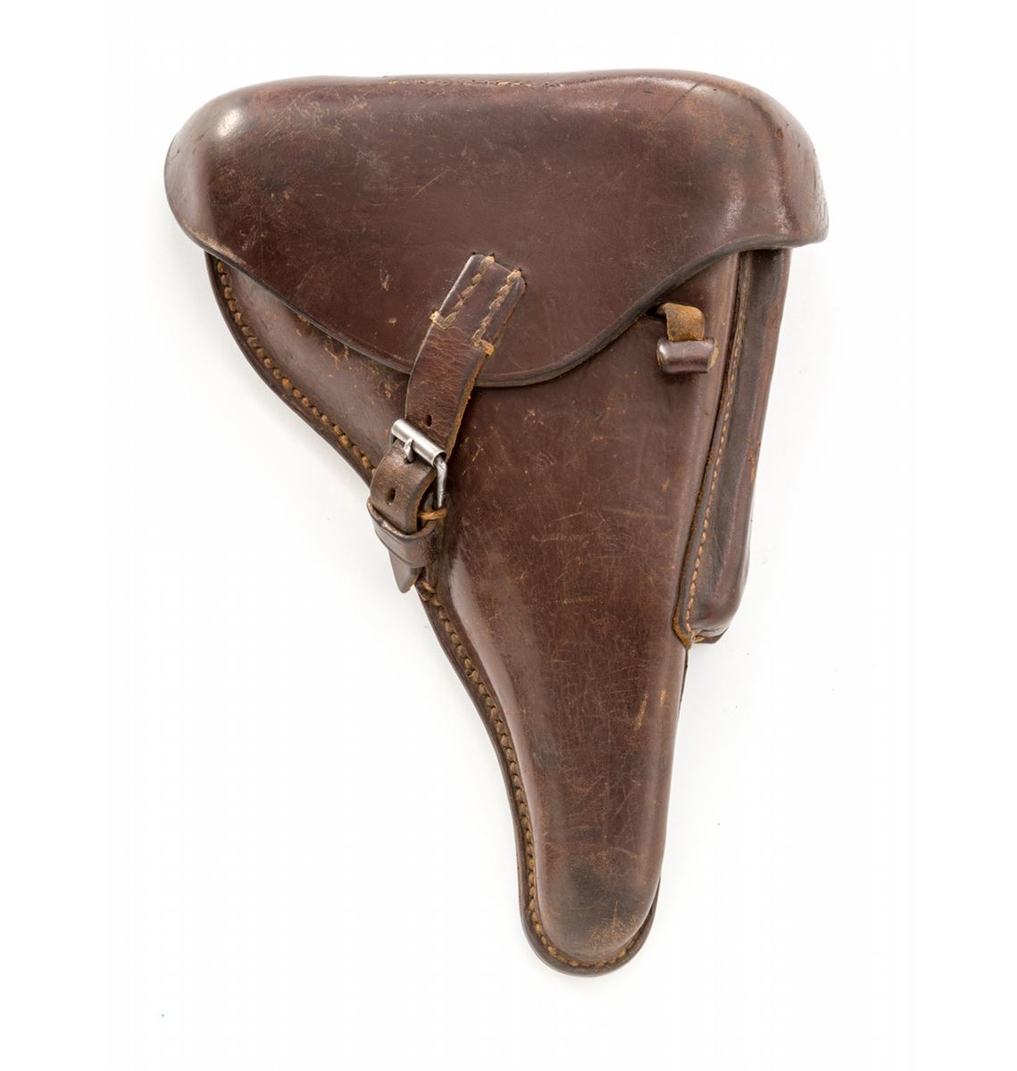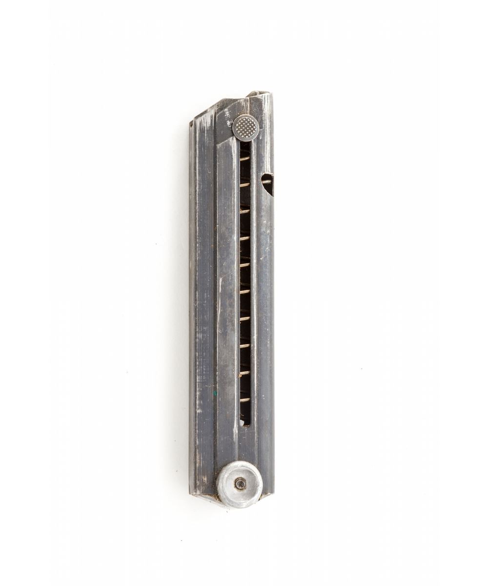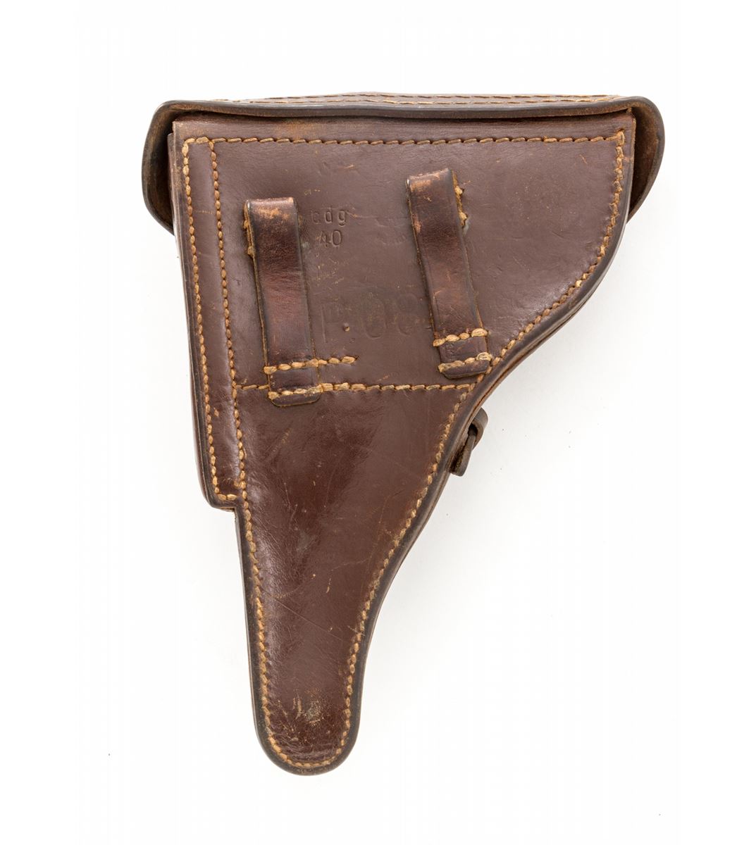 Rare 1940 Dated Krieghoff Luger, #10260, 9mm, 4'' barrel, salt blue finish with straw small parts, factory molded brown checkered plastic grips with smooth border, and two matching numbered blue-bodied extruded magazines with pinned aluminum bases. Chamber dated 1940, standard Krieghoff anchor to central toggle, ''Gesichert/Geladen'' marked thumb safety and extractor, with full complement of Luftwaffe component and inspection markings. In 1940 dated brown leather holster. Considered rare with only 1100 mfg'd. Condition is excellent retaining approx. 98% original lightly toning blue. Grips and action are crisp, bore is bright. Holster with tight stitching and light scuffs and scratches. Est.: $5,000-$7,500. (C&R/PPT) (John Siroonian estate)