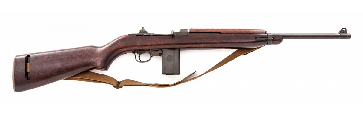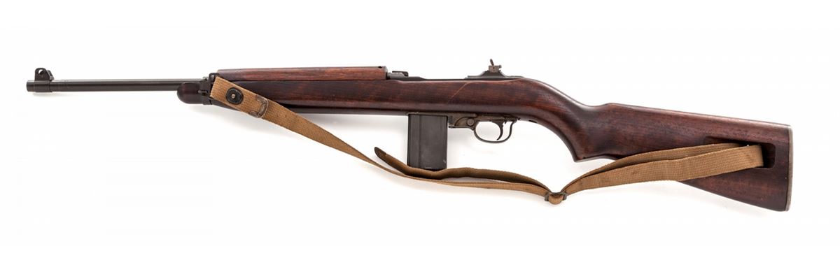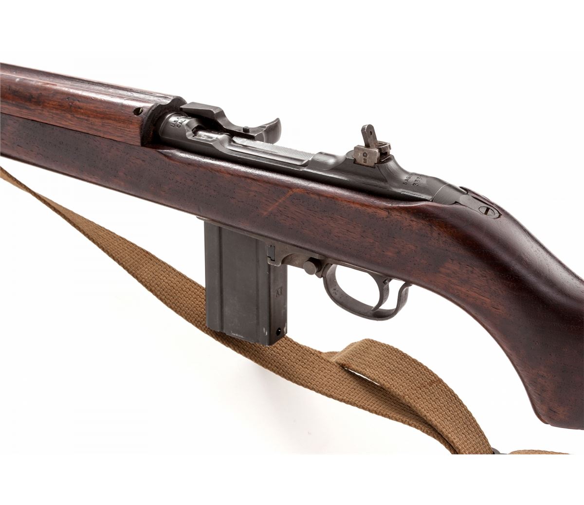 U.S. M1 Carbine, by Saginaw 'SG', #3332172, .30 Carb. cal., 18'' Saginaw barrel, parkerized finish, with correct ''SG'' cartouched stock. Flat bolt, flip sight, high wood, push-button safety, ''PM-SG'' marked steel buttplate, stamped and braised triggerguard, single rivet upper handguard, with correct WWII era light khaki sling with ''C'' pressed metal tips, and one parkerized magazine marked ''AI''. Condition is fine to near excellent with parkerized bolt showing light wear in actioning areas. Stock with some oil darkening and minor nicks and scuffs. Action is crisp, bore is bright. Est.: $1,800-$2,400. (C&R)