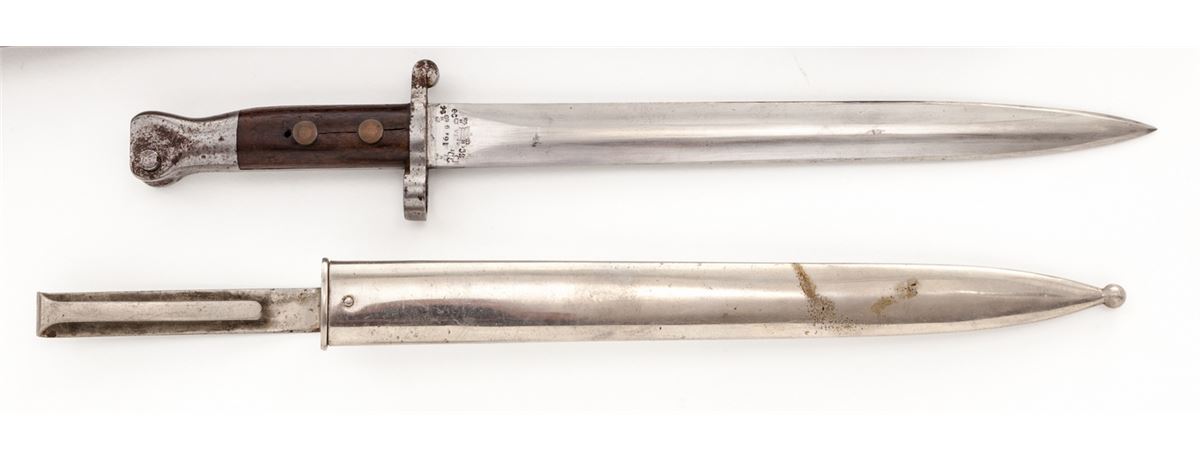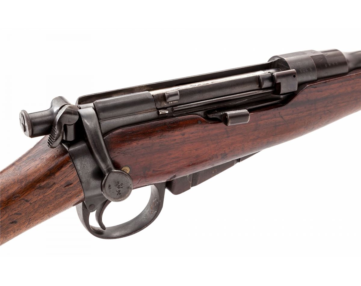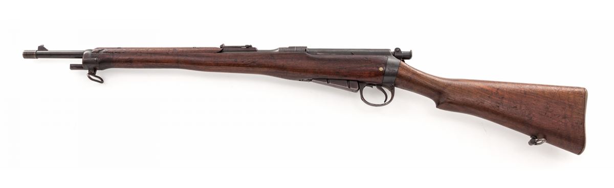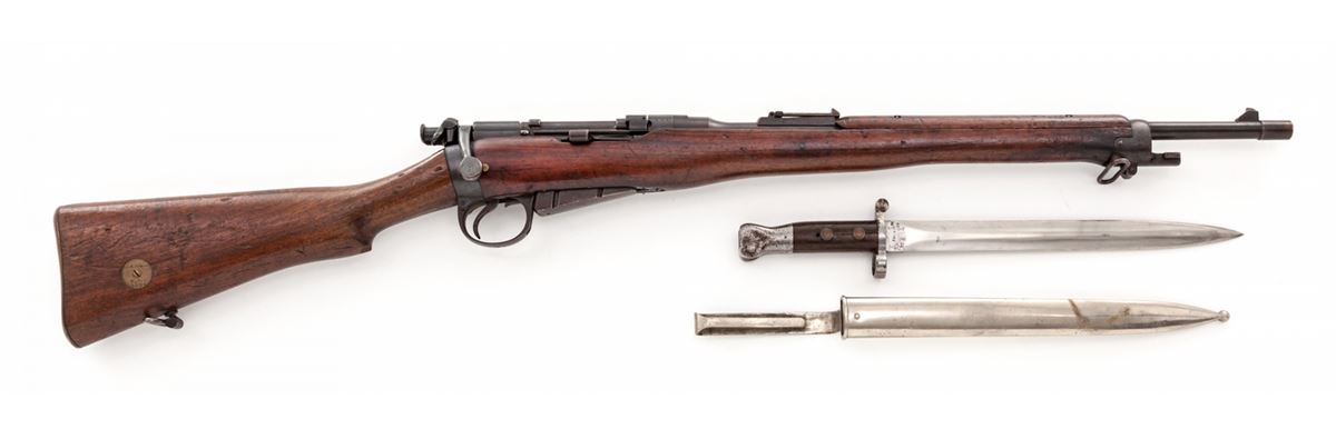 Enfield MK I Royal Irish Constabulary Carbine, #5655, .303 cal., 20-1/2'' barrel, blue finish, walnut stock and handguard, with correct bayonet and nickel-plated scabbard. Original five-round magazine is retained with single shot cutoff; receiver ring marked ''(crown)/V.R./Enfield 1898/L.E.C.-I''. Stock disc marked ''RIC/4364'' with crisp Enfield cartouche. Condition is fine retaining approx. 92% thinning and toning blue. Stock with light scuffs, scratches, and some oil darkening. Chamber area with full complement of English proofmarks. Action is good, bore is fine. Est.: $750-$1,000. (Antique)