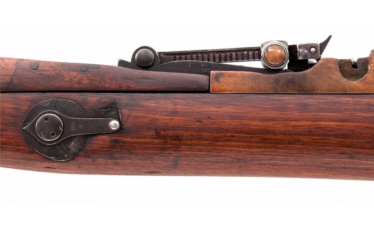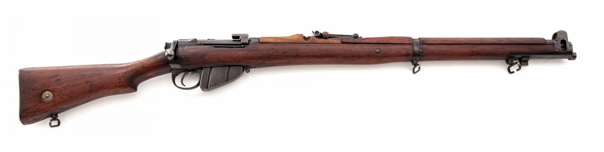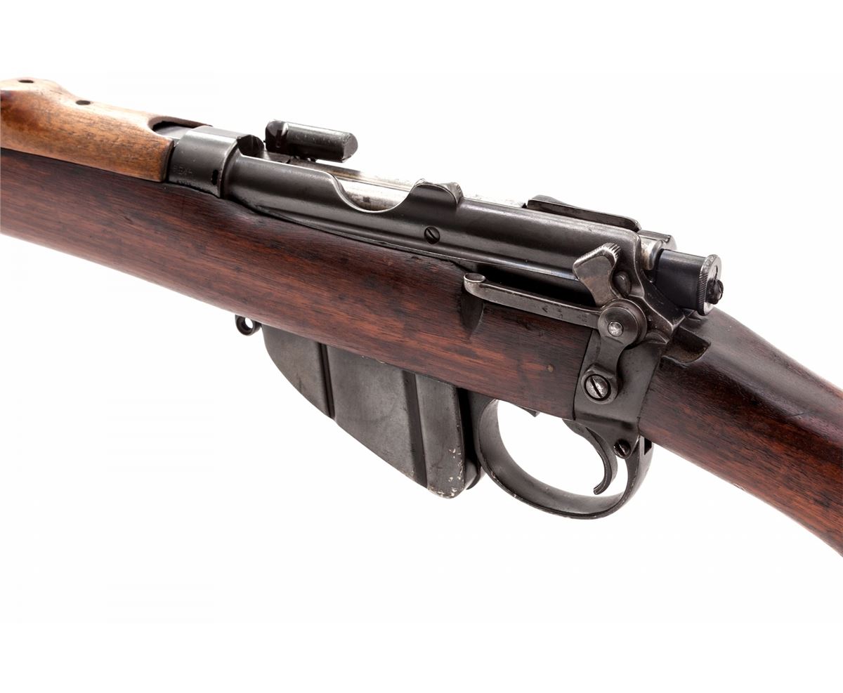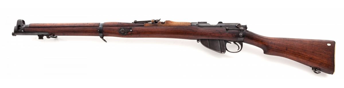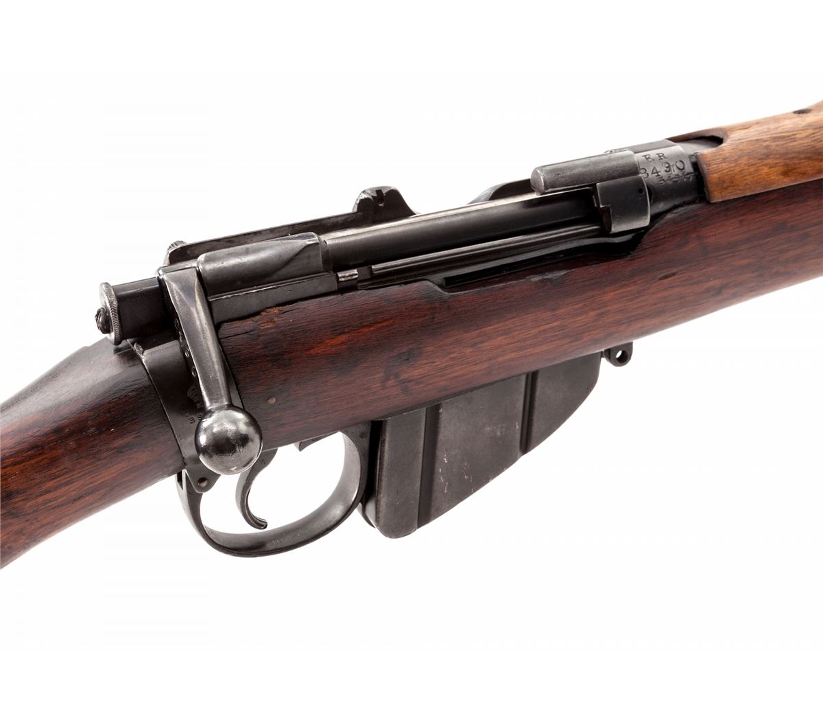 BSA No. 1 MK I*** Bolt Action Rifle, #ER8490, .303 cal., 25'' barrel, blue finish, walnut stock, volley sights, with improved tangent leaf rear sight with bone slide tip. Bolt head with slide for bolt head charger guide. Dated 1907 at receiver ring. Condition is fine retaining approx. 95% arsenal finish with light scuffs to stock and oil staining near metal surfaces. Action is crisp, bore is fine. As issued to the Irish Free State. Est.: $450-$600. (C&R)