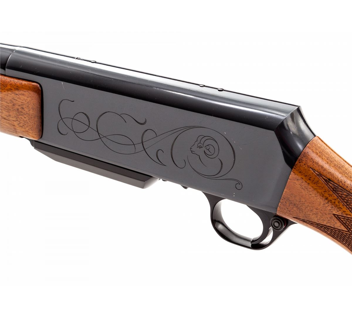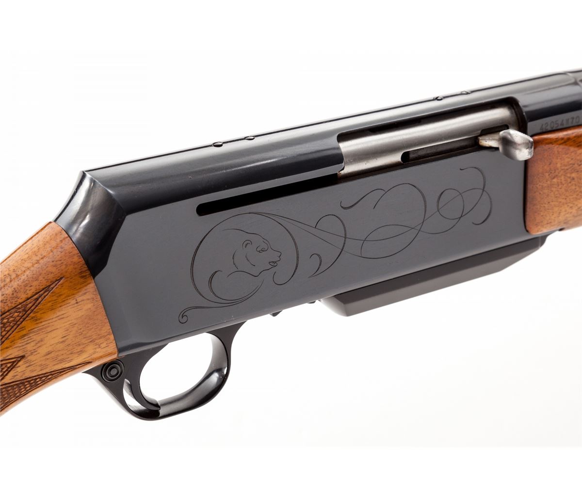 Grade II Belgian Browning BAR Semi-Automatic Rifle, #42054M70, .338 Win. mag. cal., 24'' barrel, blue finish, decorative scroll ram and cougar motif, factory checkered walnut stock and forend, with one lightly decorated magazine. Mfg'd 1970. Condition is excellent retaining approx. 98%+ original finish, with light scratching to receiver side from field use. Stock shows very minor impressions as well. Action is crisp, bore is bright. Est.: $800-$1,200. (Modern)