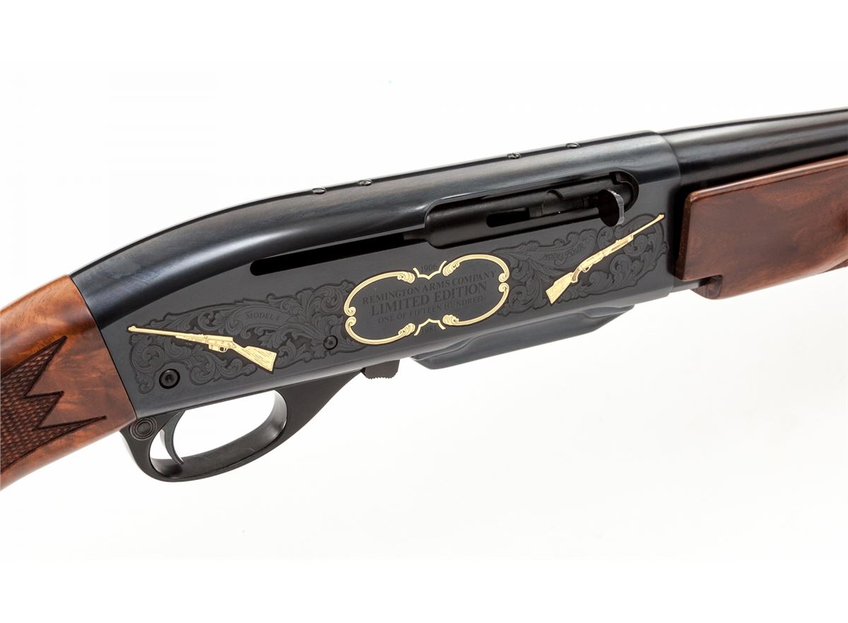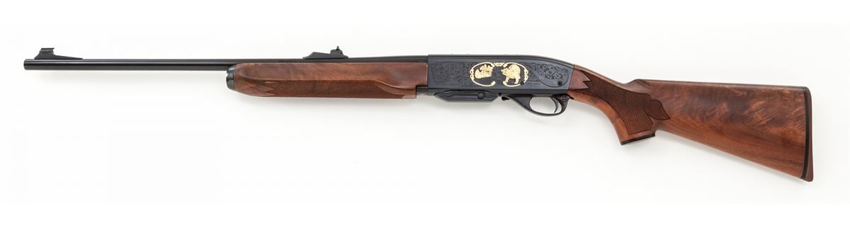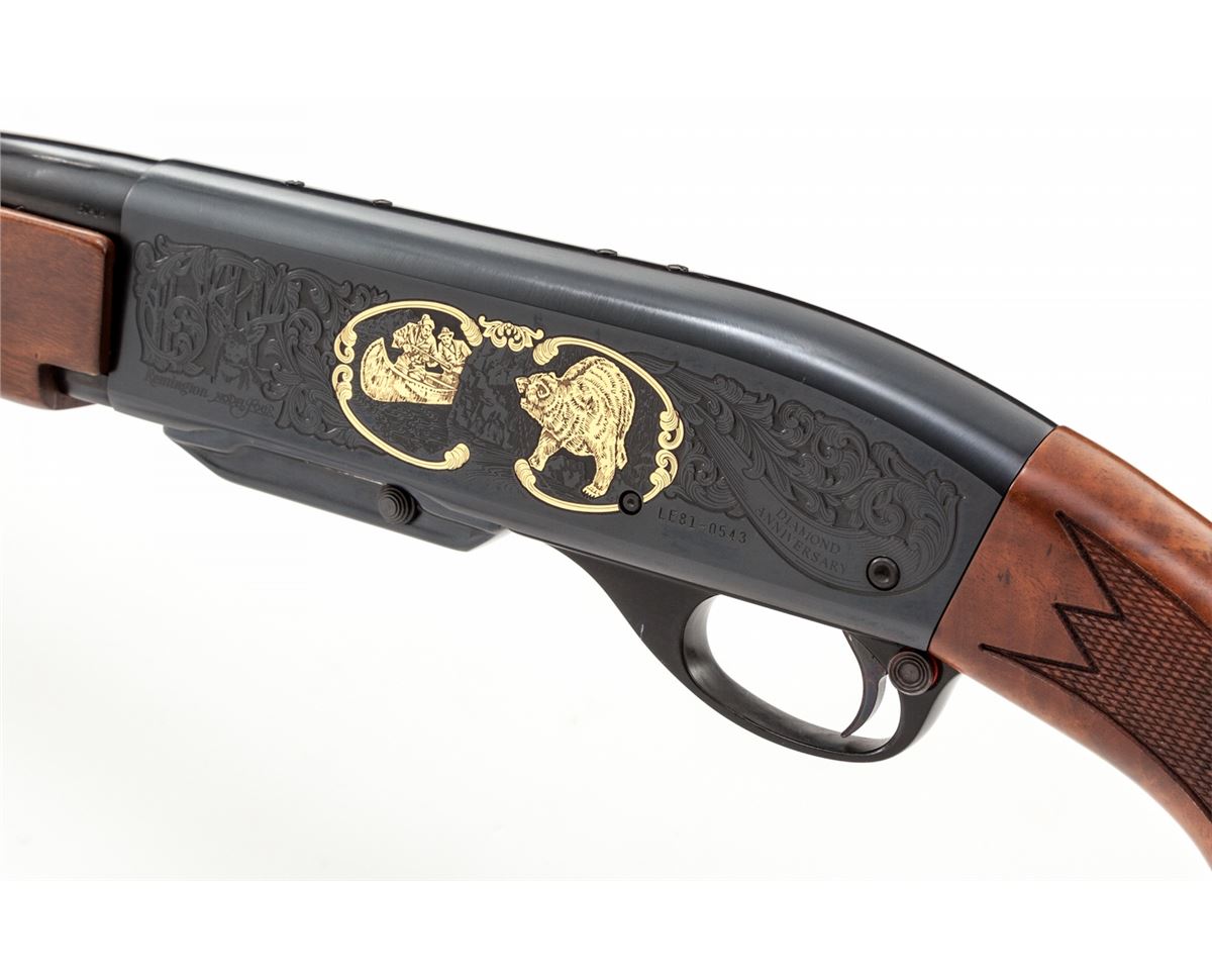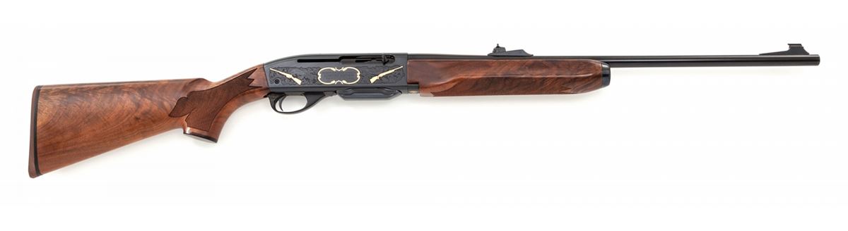 Remington Diamond Anniversary Model 4 Semi-Automatic Rifle, #LE810543, .30-06 cal., 22'' barrel, roll-engraved blue finish with gold rifles, bear and hunter scene, and right side marked ''1906-1981 Remington Arms Co. Limited Edition, 1 of 1500'', with select grade checkered walnut stock and standard sights. Condition is excellent showing only light marks from rack storage as several small scratches to left side forward portion of triggerguard area. Stock and action are crisp, bore is bright. Est.: $750-$1,000. (Modern)