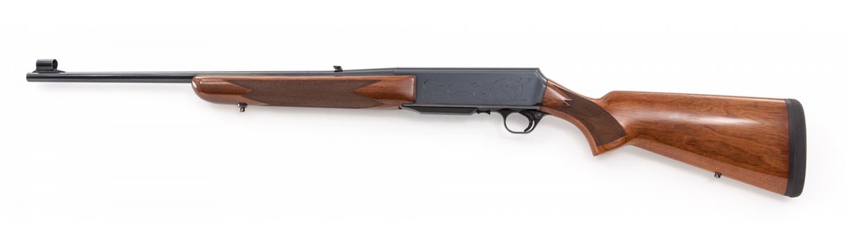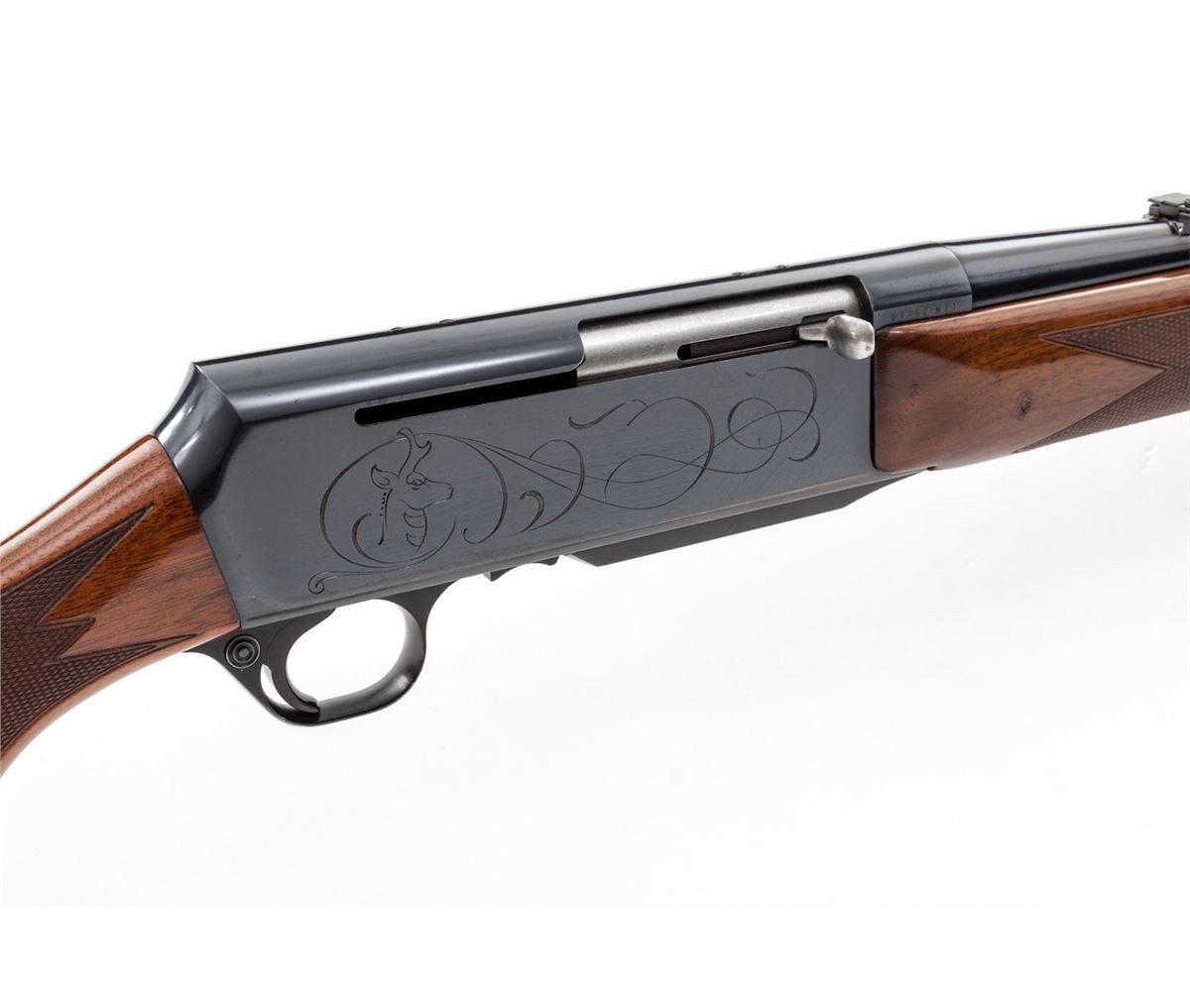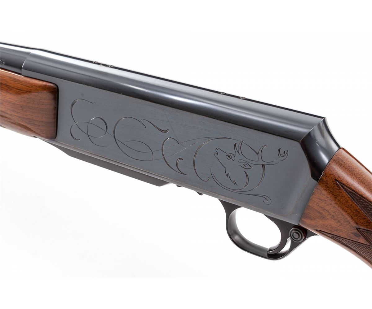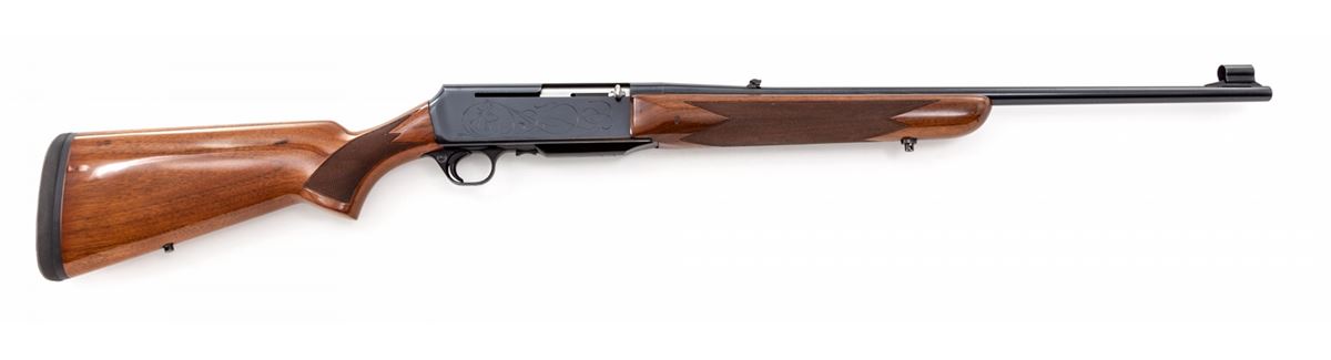 Grade II Belgian Browning BAR Semi-Automatic Rifle, #93352M71, .30-06 cal., 22'' barrel, blue finish, checkered walnut stock, with soft rubber butt pad. Receiver with light engraving showing big game heads. Condition is about fine retaining approx. 95% factory blue. Checkers remain mostly crisp with light impressions to stock. Small blemish to top of receiver where scope mount would normally be affixed. Action is crisp, bore is bright. Est.: $750-$1,000. (Modern)