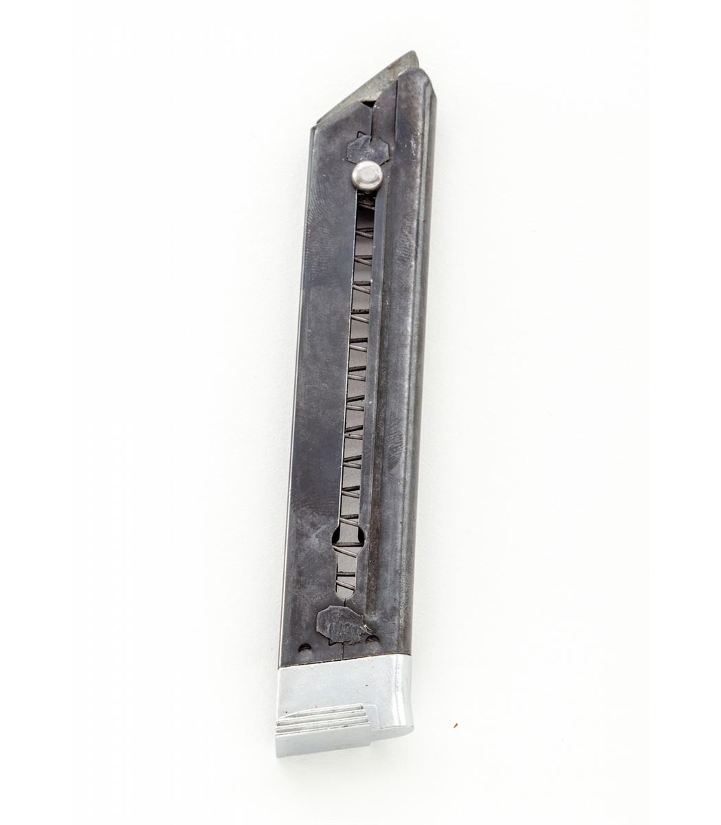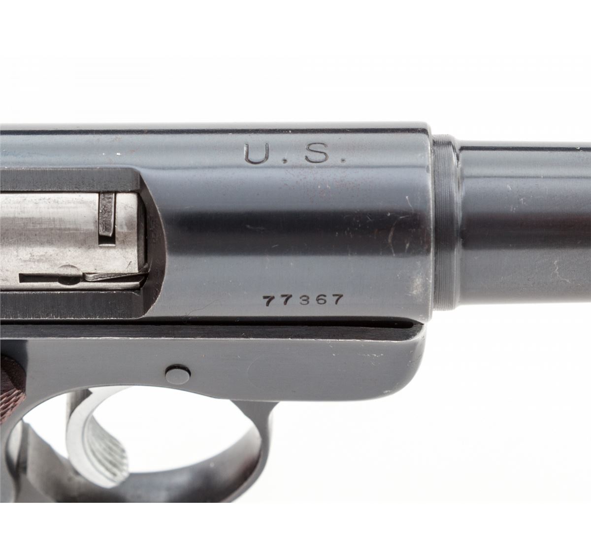 Scarce Early U.S. marked Ruger MK I (T7678) Semi-Automatic Target Pistol, #77367, .22 LR cal., 6-7/8'' medium-weight barrel, blue finish, thumbrest walnut checkered stock, with micro-adjustable rear sight and Patridge style front sight, and two (2) correct early mags. ''U.S.'' neatly marked above chamber area. Mfg'd approx. 1955, being in the first shipment of 4000 to the U.S. Army Ordnance Dept. within the accepted serial number range of 75,800 to 79,999. Condition is excellent retaining approx. 97% blue with light thinning at muzzle and high edges, and light general overall micro-scratching with some thinning to front strap. Grips and action are crisp, bore is bright. Interesting article from December 2001 American Rifleman included. Est.: $500-$750. (C&R/PPT)