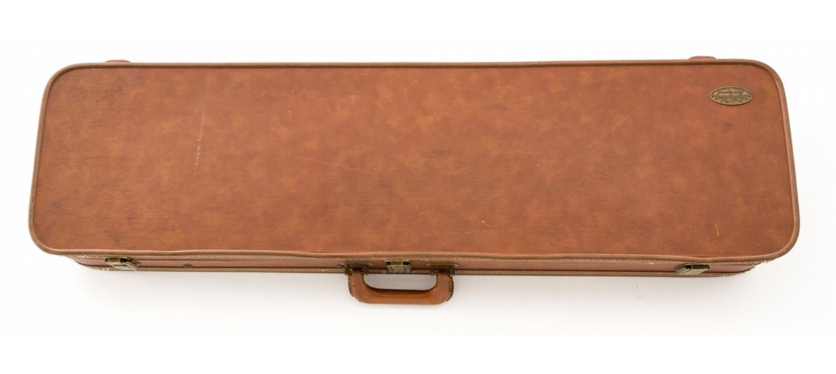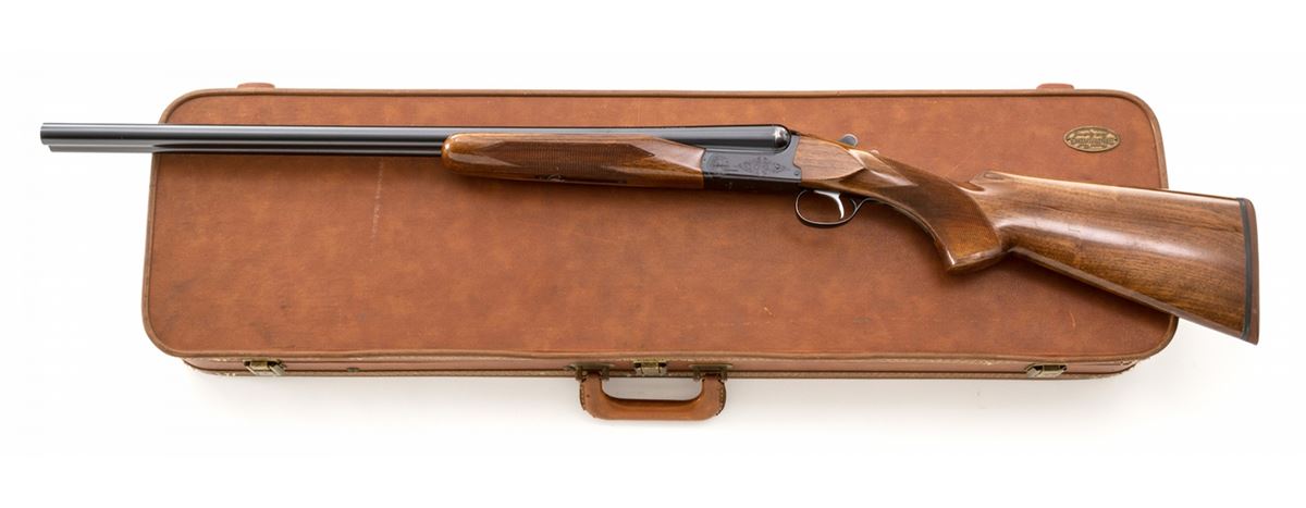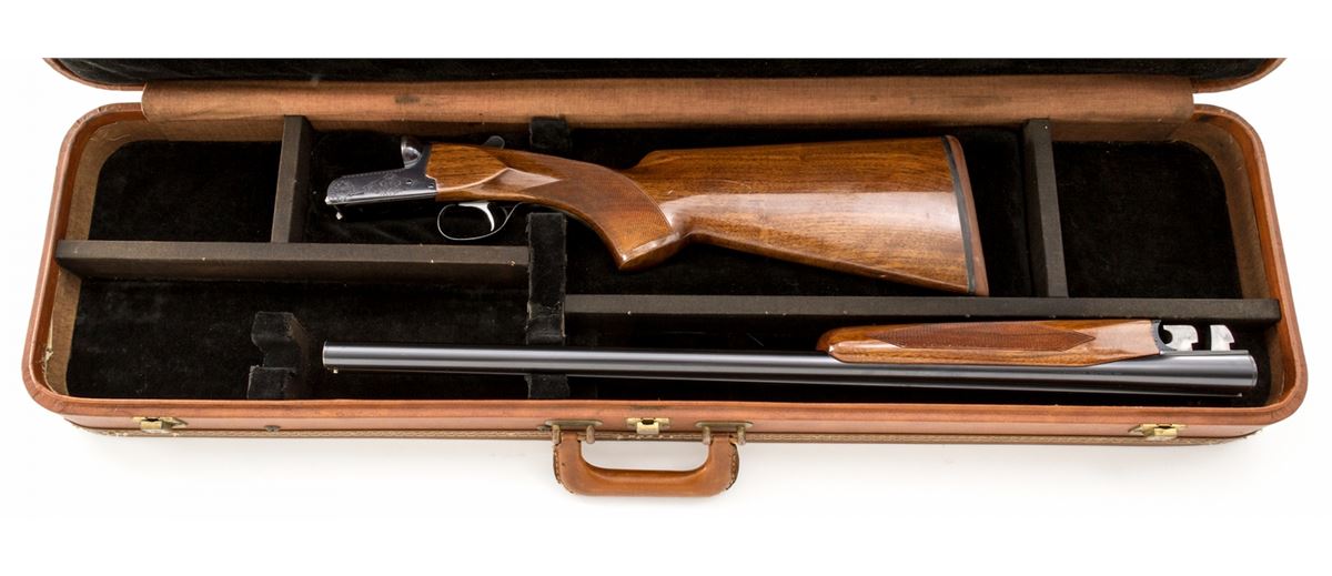 Browning B-S/S Side-by-Side Boxlock Shotgun, #4376A72, 12 ga., 2-3/4'', blue finish, 26'' barrels with silver front bead, choked Mod/IC., manual sliding top tang safety, single non-selective trigger, light scroll engraving on frame; gloss finish walnut pistol-grip stock and beavertail forend with a 14-1/2'' length of pull over a 1/2'' solid Old English red recoil pad. Mechanically sound showing light use and carry scratches in stock finish; blue worn off the lower tang. Contained in a relined Browning Hartmann luggage case, no keys. Est.: $900-$1,200. (Modern)