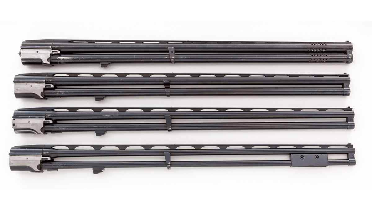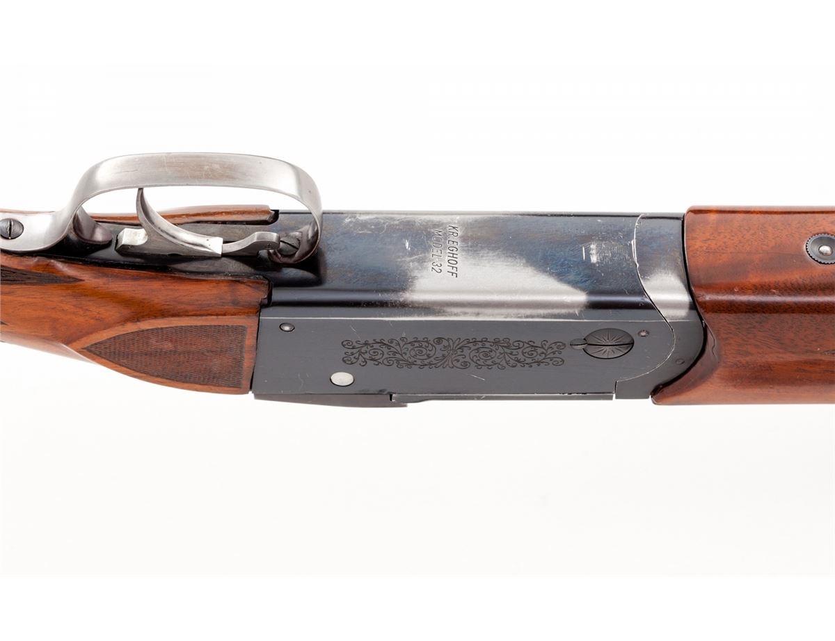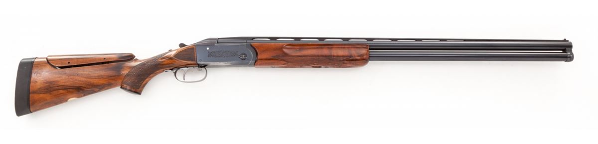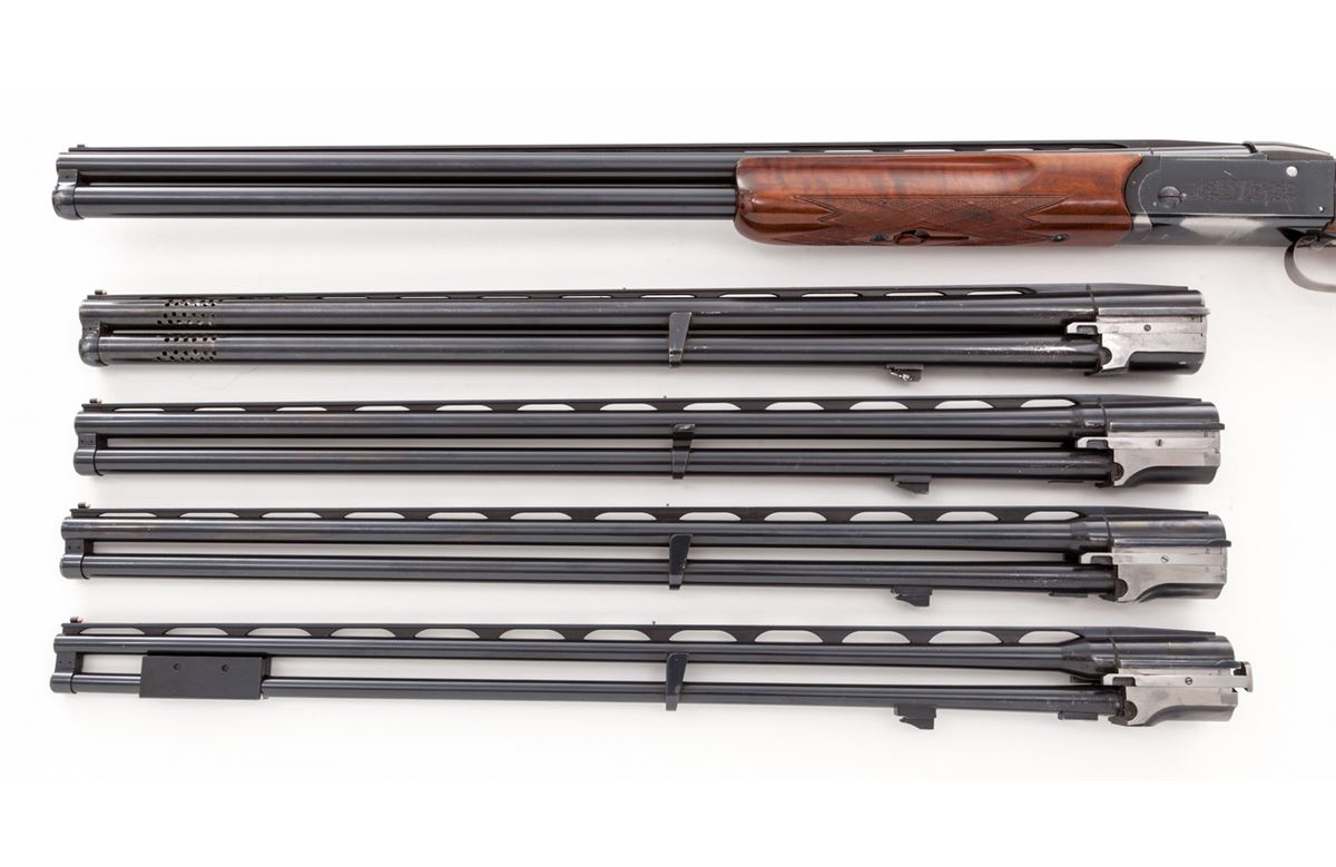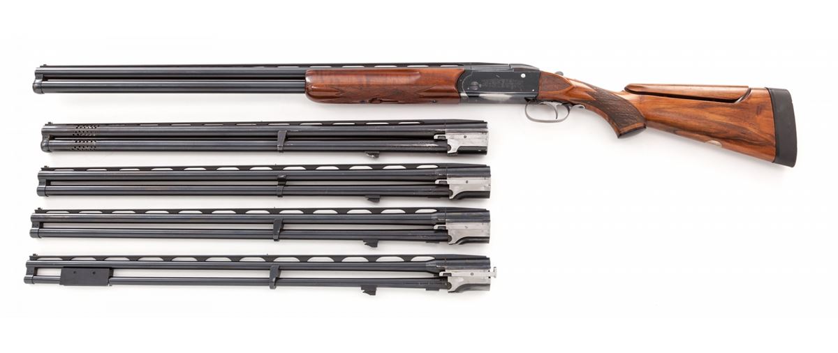 Krieghoff Standard Model 32 Over/Under Shotgun With Five Fitted Barrel Sets and Three Sub-Gauge Insert Sets, #3797, blue finish, single selective mechanical trigger with barrel selector toggle in the triggerguard and manual top tang safety; barrels with 8mm ventilated ribs, white front and silver middle beads, importer marked ''Made for Europa Corporation Miami Florida''. Bbl. 1) #3797, 30'', 12 ga,, 2-3/4'', Ulm Proof date 5/69, bores measure .731'' and .736'', chokes originally stamped Full/Full are now bored cylinder. Bbl. 2) #3797, 28'' ported, 12 ga., 2-3/4'', Ulm Proof date 8/68, now out of proof with bores opened to .775'' for use with Briley sub-gauge inserts. Bbl. 3) no serial #, 28'', 20 ga., 3'' magnum, Ulm Proof date 10/68, bores measure .630'' and .633'', chokes stamped Skeet/Skeet measure .008'' and .005''. Bbl. 4) no serial #, 28'', 28 ga., 3'' magnum, Ulm Proof date 5/69, bores measure .554'', chokes stamped Skeet/Skeet measure .005'', Bbl. 5) no serial #, 28'', .410'', 3'' magnum, Ulm Proof date 6/69, chokes stamped Skeet/Skeet. Sub-gauge inserts by Briley are 20 ga., 28 ga., and .410'', all with removable skeet chokes. The semi-gloss walnut pistol grip buttstock features a height adjustable comb, checkered side panels, rosewood pistol grip cap, vacant initial oval on the toe line and along with the fingergroove target forearm has 24 LPI skip-line checkering. Length of pull is 14-1/2'' over a 1-3/8'' black rubber recoil pad, drop at heel is 1-7/8'', assembled weight with bbl. 1 is 8-1/2 lbs. The frame, bbl. 1 and sub-gauge inserts are housed in a two-tone wood and leatherette key lock case, no keys present; the four 28'' barrels are in a second case of a similar style with six Briley removable choke sets for the sub-gauge inserts, two for each gauge, with barrel tools, assorted spare parts and two keys. Overall condition remains very good with 95% blue on the barrels and frame sides, 75% blue on the underside of the frame with the trigger guard mostly silvered; assembly points and barrel ribs have moderate scuffs and scratches, barrel and insert bores are bright; stock and forearm have scattered mars and scrapes with wood to metal beginning separations at the stock head and a 1'' hairline fracture from the top tang; sliding safety engages loosely, ejectors are weak, barrels have slight play in the hangers, lock-up with all barrels is good but along with internal action components should be inspected. Cases are sturdy with cover material loosening along one edge; two of three interior divider leather retaining straps in the smaller case are missing. Est.: $3,500-$5,000. (Modern)