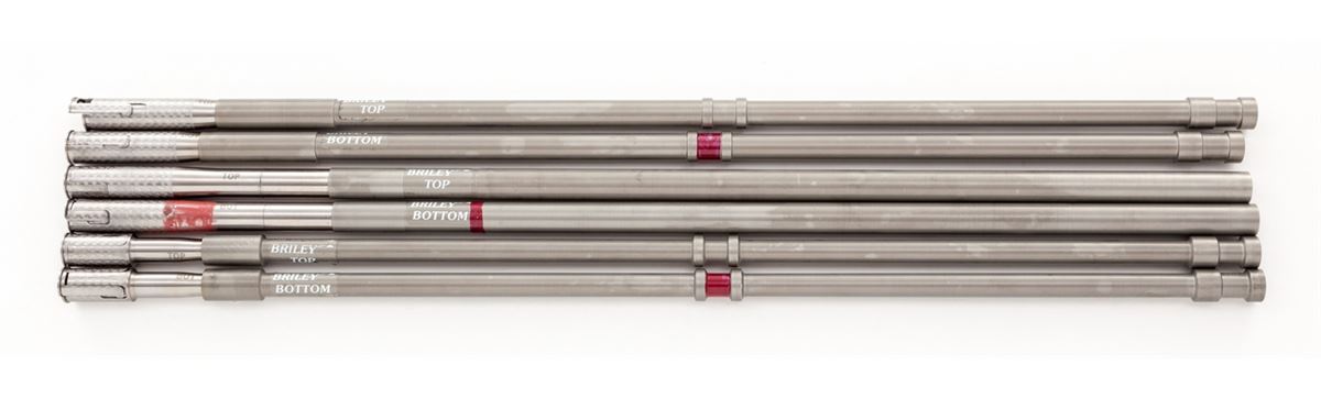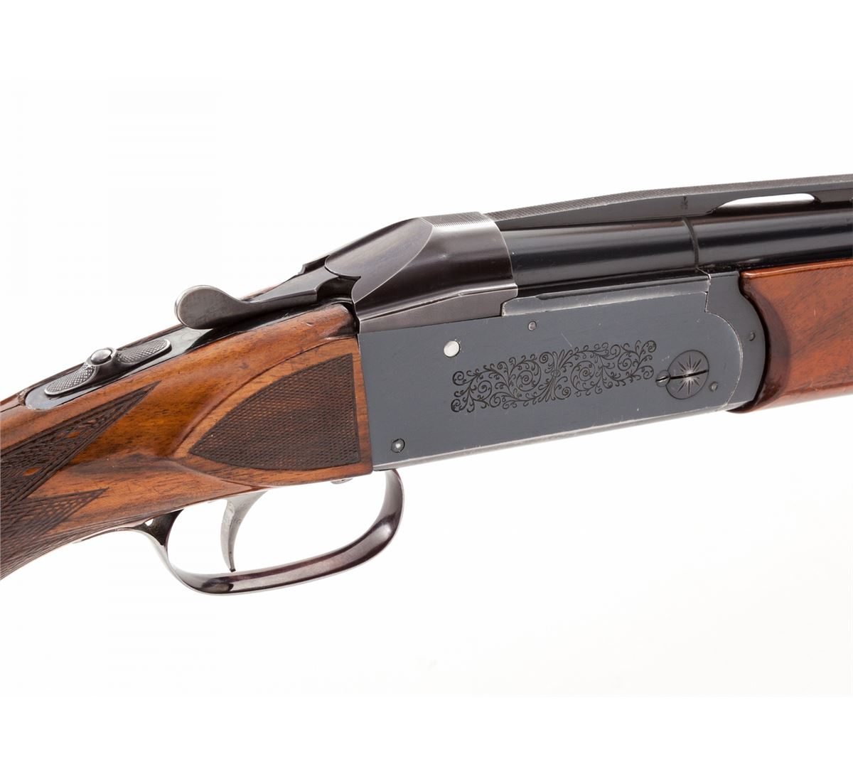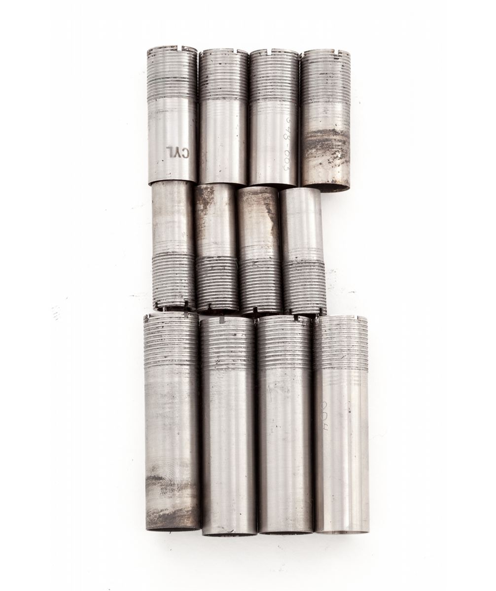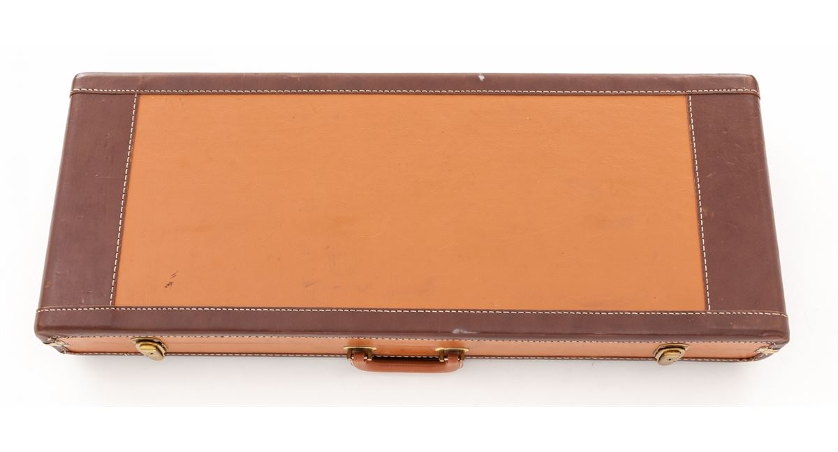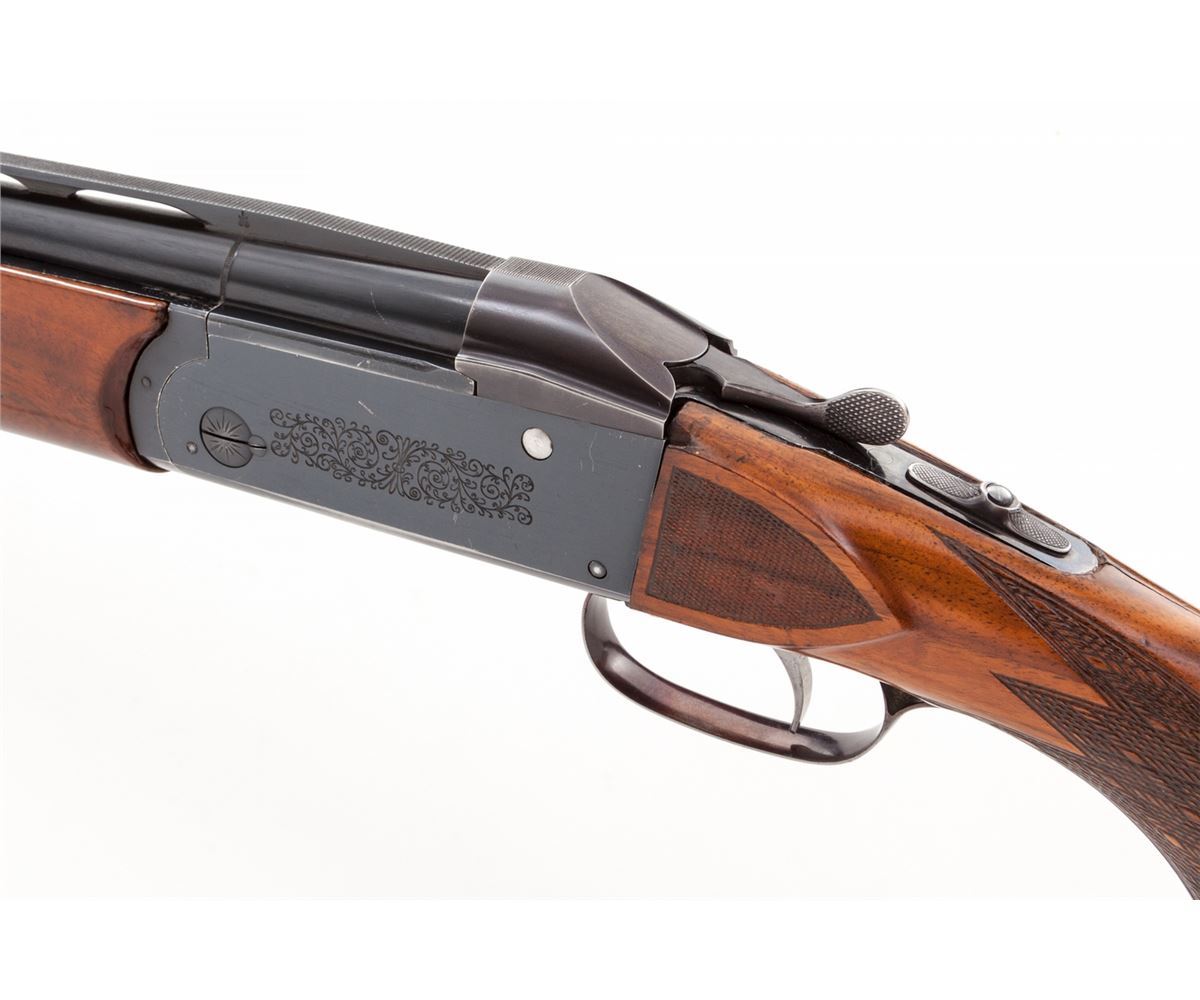 Krieghoff Standard Model 32 Over/Under Shotgun With Five Fitted Barrel Sets and Three Sub-Gauge Insert Sets, #3797, blue finish, single selective mechanical trigger with barrel selector toggle in the triggerguard and manual top tang safety; barrels with 8mm ventilated ribs, white front and silver middle beads, importer marked ''Made for Europa Corporation Miami Florida''. Bbl. 1) #3797, 30'', 12 ga,, 2-3/4'', Ulm Proof date 5/69, bores measure .731'' and .736'', chokes originally stamped Full/Full are now bored cylinder. Bbl. 2) #3797, 28'' ported, 12 ga., 2-3/4'', Ulm Proof date 8/68, now out of proof with bores opened to .775'' for use with Briley sub-gauge inserts. Bbl. 3) no serial #, 28'', 20 ga., 3'' magnum, Ulm Proof date 10/68, bores measure .630'' and .633'', chokes stamped Skeet/Skeet measure .008'' and .005''. Bbl. 4) no serial #, 28'', 28 ga., 3'' magnum, Ulm Proof date 5/69, bores measure .554'', chokes stamped Skeet/Skeet measure .005'', Bbl. 5) no serial #, 28'', .410'', 3'' magnum, Ulm Proof date 6/69, chokes stamped Skeet/Skeet. Sub-gauge inserts by Briley are 20 ga., 28 ga., and .410'', all with removable skeet chokes. The semi-gloss walnut pistol grip buttstock features a height adjustable comb, checkered side panels, rosewood pistol grip cap, vacant initial oval on the toe line and along with the fingergroove target forearm has 24 LPI skip-line checkering. Length of pull is 14-1/2'' over a 1-3/8'' black rubber recoil pad, drop at heel is 1-7/8'', assembled weight with bbl. 1 is 8-1/2 lbs. The frame, bbl. 1 and sub-gauge inserts are housed in a two-tone wood and leatherette key lock case, no keys present; the four 28'' barrels are in a second case of a similar style with six Briley removable choke sets for the sub-gauge inserts, two for each gauge, with barrel tools, assorted spare parts and two keys. Overall condition remains very good with 95% blue on the barrels and frame sides, 75% blue on the underside of the frame with the trigger guard mostly silvered; assembly points and barrel ribs have moderate scuffs and scratches, barrel and insert bores are bright; stock and forearm have scattered mars and scrapes with wood to metal beginning separations at the stock head and a 1'' hairline fracture from the top tang; sliding safety engages loosely, ejectors are weak, barrels have slight play in the hangers, lock-up with all barrels is good but along with internal action components should be inspected. Cases are sturdy with cover material loosening along one edge; two of three interior divider leather retaining straps in the smaller case are missing. Est.: $3,500-$5,000. (Modern)