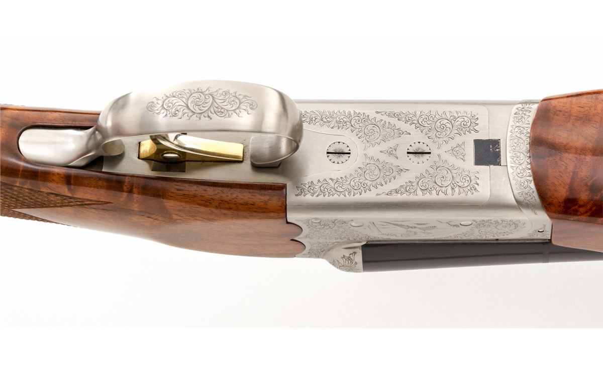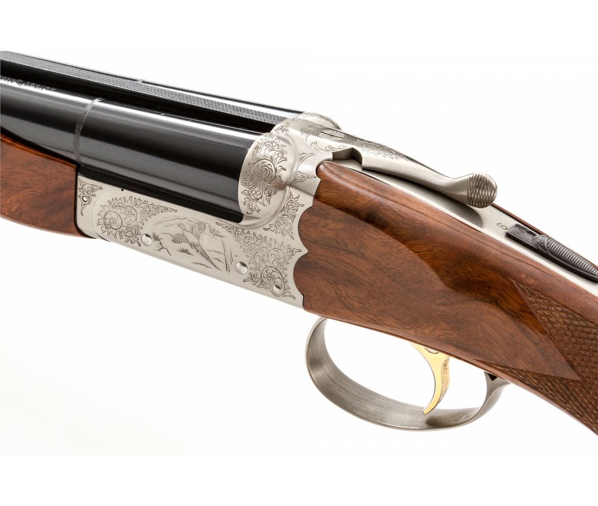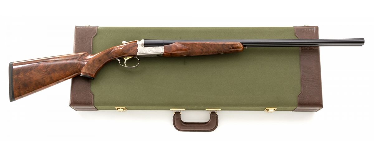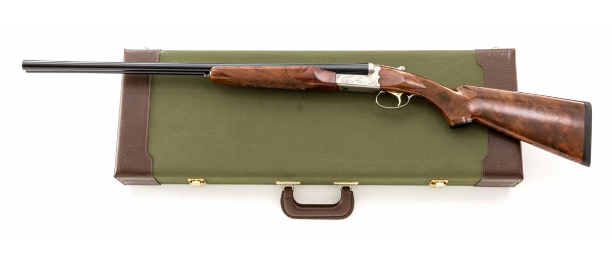 SKB Model 385 Scalloped Frame Side-by-Side Shotgun, #NS42808, 20 ga., 3'' ch., 26'' blue finish barrels with matted solid rib and front silver bead, five interchangeable choke tubes (F,M,IC,SK/SK), gold-plated single selective inertia trigger, automatic sliding top tang safety, bright silver nitride finish frame with roll engraved scroll and game birds; importer marked ''G.U. Inc.'' Claro walnut swept pistol-grip stock with high-gloss finish and semi-beavertail forend. Length of pull 14-1/4'' over a 1/2'' black Old English recoil pad. Condition appears near new with a few assembly and handling marks. Left wrist has a small factory repair in the grain. Included is a green fabric universal case with choke wrench and muzzle protectors. Est.: $1,000-$1,500. (Modern)