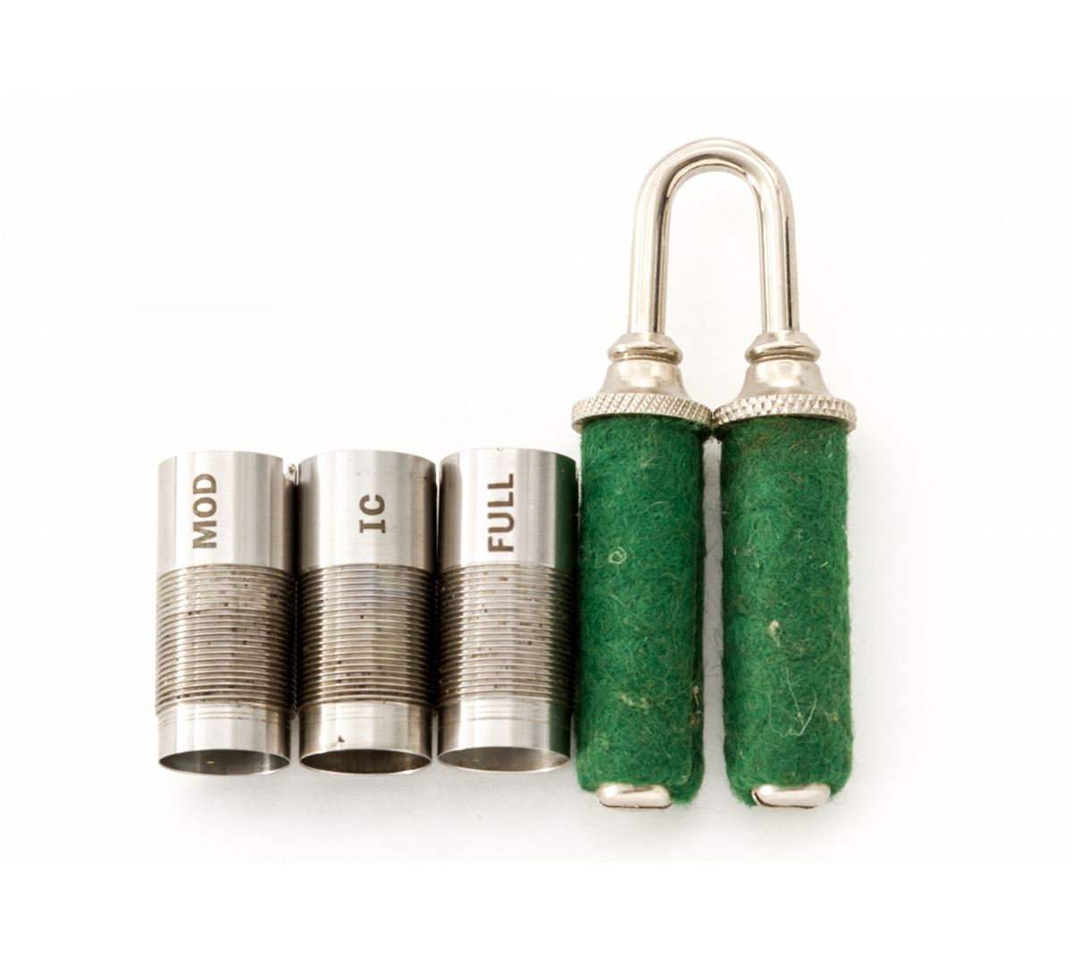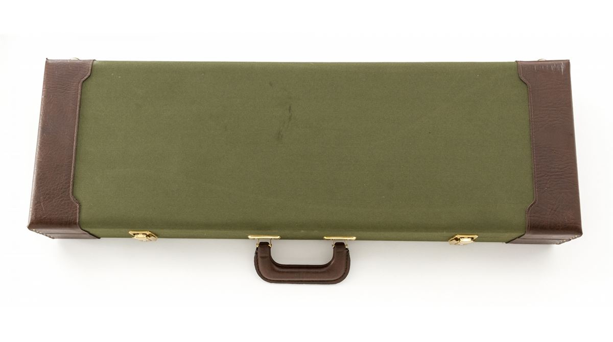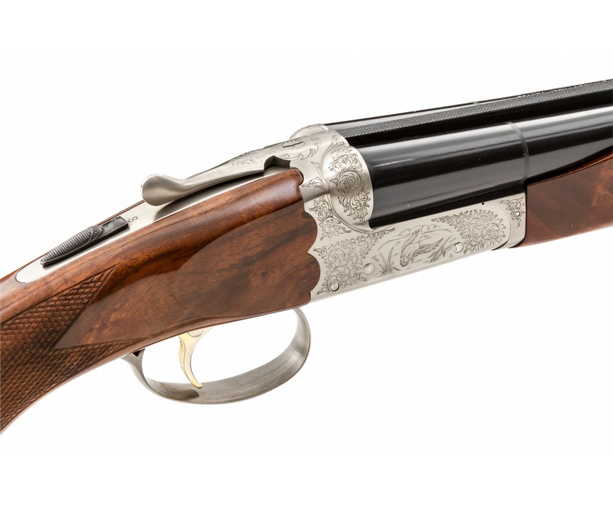 SKB Model 385 Scalloped Frame Side-by-Side Shotgun, #NS42808, 20 ga., 3'' ch., 26'' blue finish barrels with matted solid rib and front silver bead, five interchangeable choke tubes (F,M,IC,SK/SK), gold-plated single selective inertia trigger, automatic sliding top tang safety, bright silver nitride finish frame with roll engraved scroll and game birds; importer marked ''G.U. Inc.'' Claro walnut swept pistol-grip stock with high-gloss finish and semi-beavertail forend. Length of pull 14-1/4'' over a 1/2'' black Old English recoil pad. Condition appears near new with a few assembly and handling marks. Left wrist has a small factory repair in the grain. Included is a green fabric universal case with choke wrench and muzzle protectors. Est.: $1,000-$1,500. (Modern)