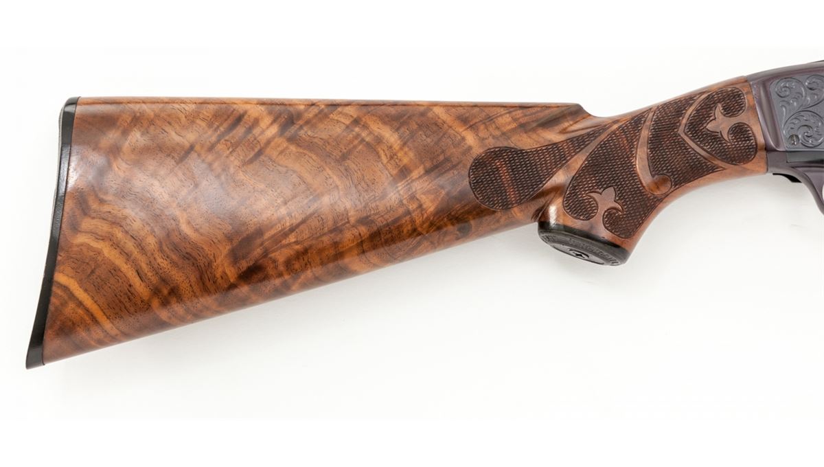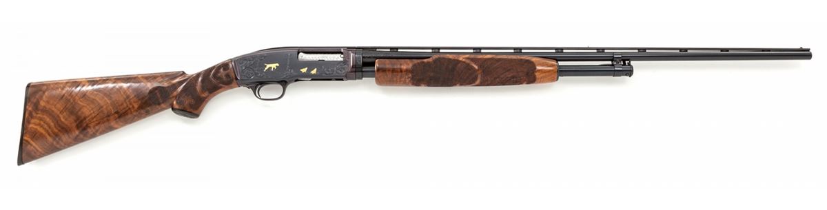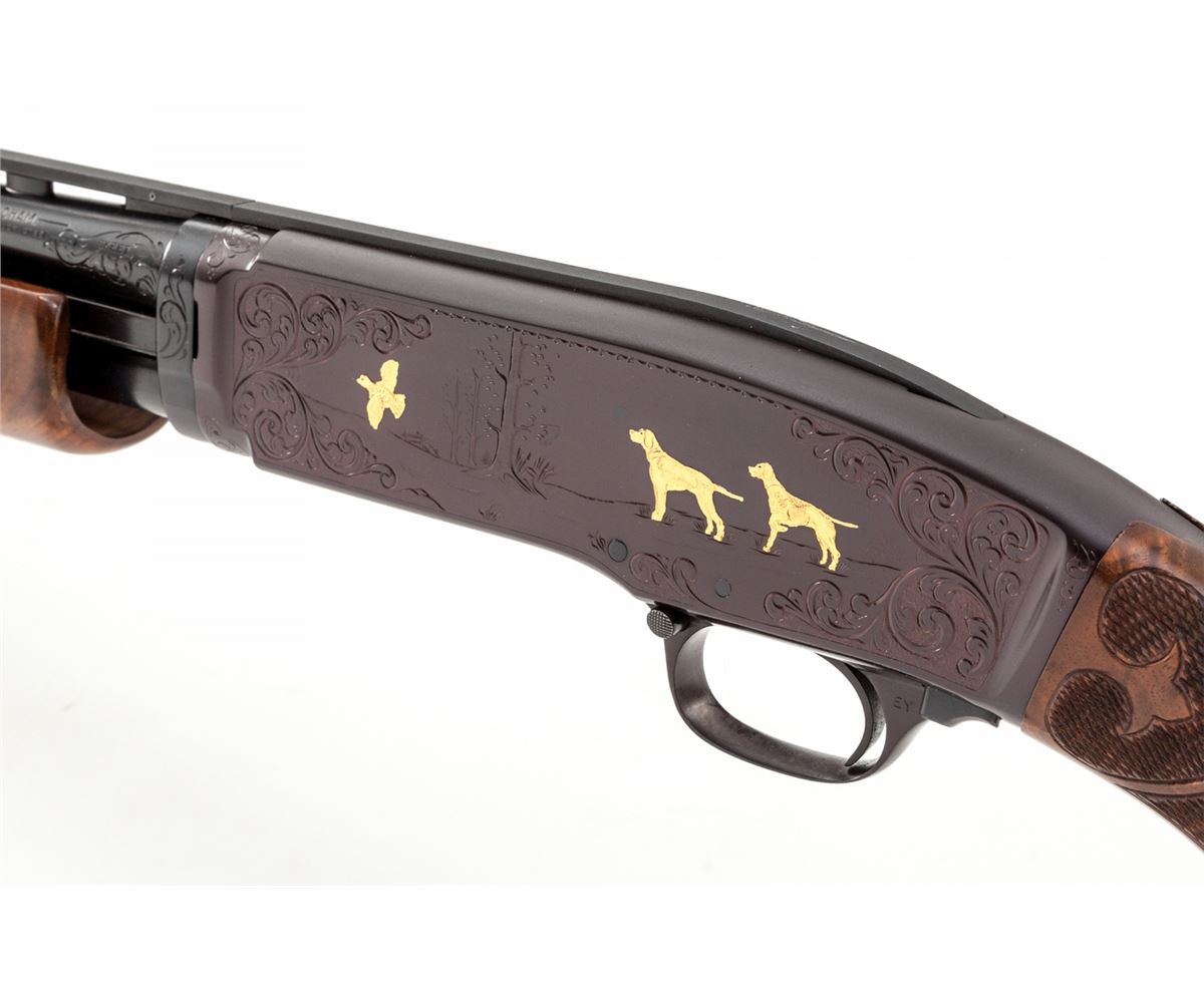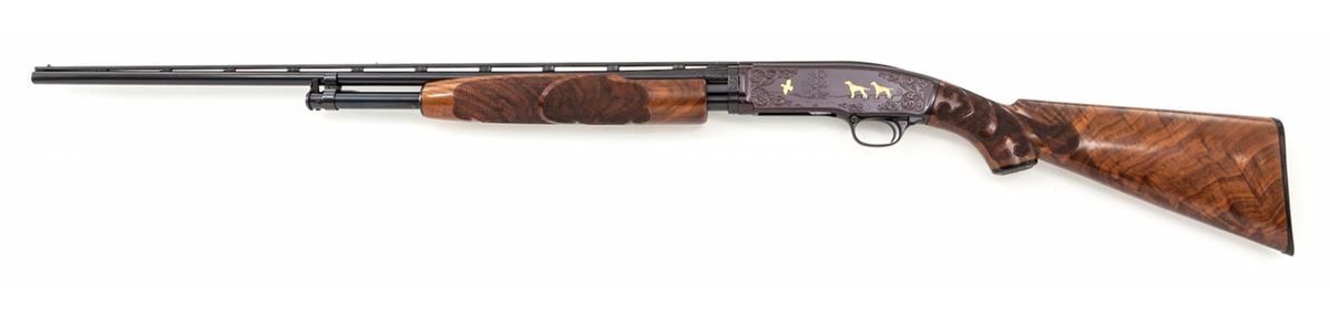 Custom Engraved and Gold Inlaid Winchester Model 42 Slide Action Skeet Shotgun, #72495, .410 bore, 3'', bright blue finish, 28'' barrel with front white and middle silver beads, matted ventilated rib, Skeet choke, manual button safety in triggerguard, bright engine-turned bolt, carrier and extractor; receiver assembly and barrel chamber are engraved in a style closely resembling the original Winchester No. 42-5 pattern with broad foliate scroll and punch dot background engraving bordering a gold inlaid English Pointer and two gold inlaid grouse on the right side of the frame, with a gold inlaid grouse and two gold inlaid English Pointers on left side; lower receiver extension has a lightly engraved pigeon; engraver's initials ''L.C.'' are just forward of loading port. The replacement pistol-grip stock and handle are semi-gloss finish, flame figure AA Claro walnut with 20-line-per-inch fleur-de-lis and ribbon checkering and an original Winchester grip cap. Length of pull is 14'' over a black Winchester hard rubber buttplate; drop at comb: 1-1/2''; drop at heel: 2''; weight is 6-3/8 lbs. Mfg'd circa 1948. Condition remains very fine as enhanced and refinished showing light use with a tight action and bright bore; 98% reblue with plum toning on the receiver and triggerguard; stock wood surface is wavy, and revarnish has a few small handling marks. Est.: $2,000-$2,500. (C&R)