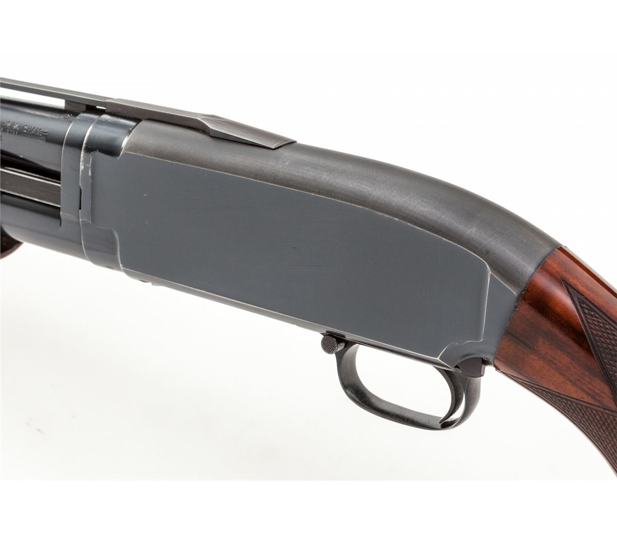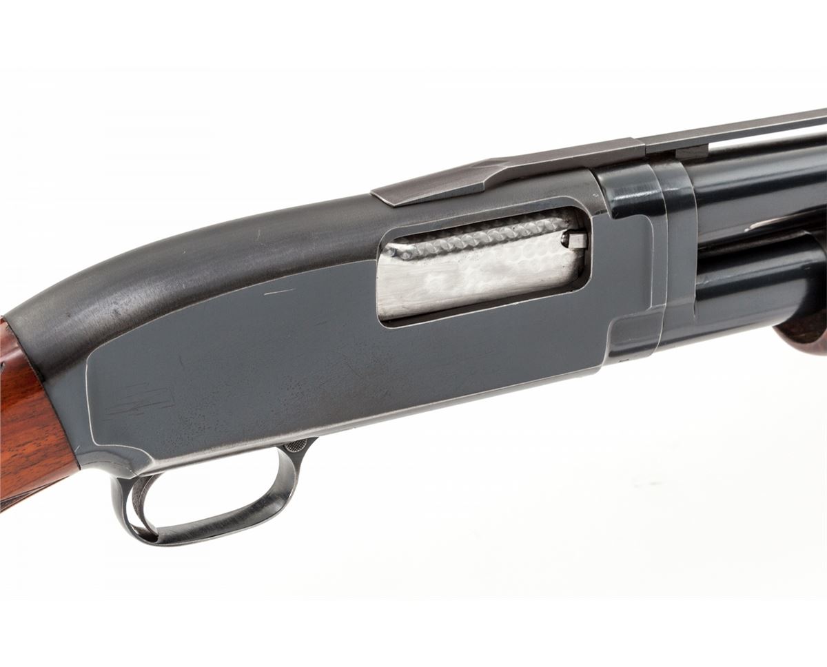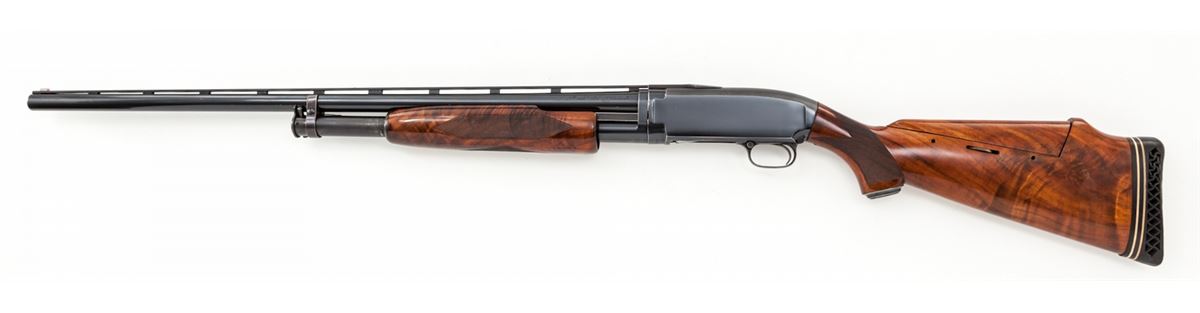 Customized Winchester Model 12 Slide Action Trap Shotgun, #1929286, 12 ga., 2-3/4'' chambers, blue finish , 30'' barrel with matted ventilated rib, front orange resin and middle white beads, Full choke, manual button safety in triggerguard, bright engine-turned bolt, carrier and extractor; engraved pigeon on lower receiver extension; replacement pistol-grip Monte Carlo stock and handle in high gloss finish AA figure Claro walnut with the original Winchester metal grip cap and height adjustable comb; 18-line-per-inch checkering. Length of pull: 14-5/8'' over 1-1/8'' black Pachmayr Whiteline ventilated recoil pad and spacer; weight is 9-1/4 lbs. Mfg'd circa 1961. Mechanical condition remains excellent showing only light use, bore is bright, action is tight, choke is opened to Modified; barrel reblue is 99% with scattered small scratches and oxidation, receiver blue has scuffs and assembly marks, bolt polishing is scuffed. Stock finish has light handling marks. Est.: $800-$1,200. (C&R)