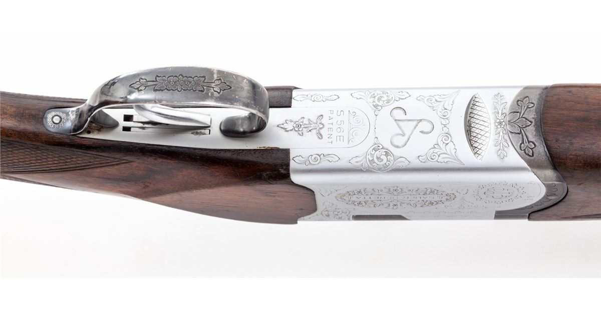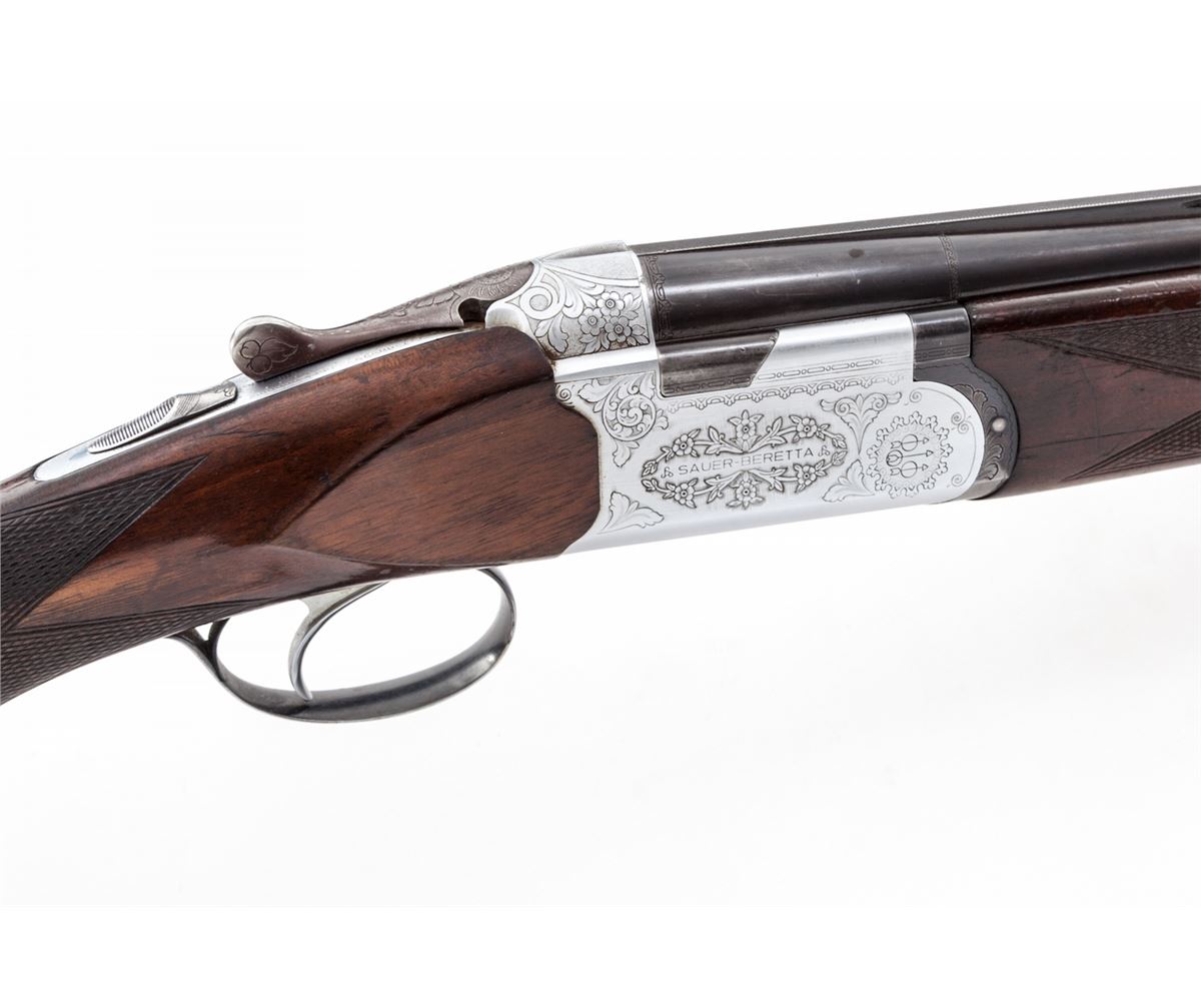 Sauer-Beretta S56E Over/Under Shotgun, #34738, 12 ga., 28'' vent rib barrels choked Full/Full, lightly engraved coin-finished frame, manual safety, extractors, European pistol-grip cheekpiece checkered walnut stock, with factory black plastic buttplate, with European style sling swivels. Condition is very good to fine showing moderate field use, with light thinning to finish on barrels, wear to checkers on stock. Good action, bright bores. Est.: $500-$750. (Modern)