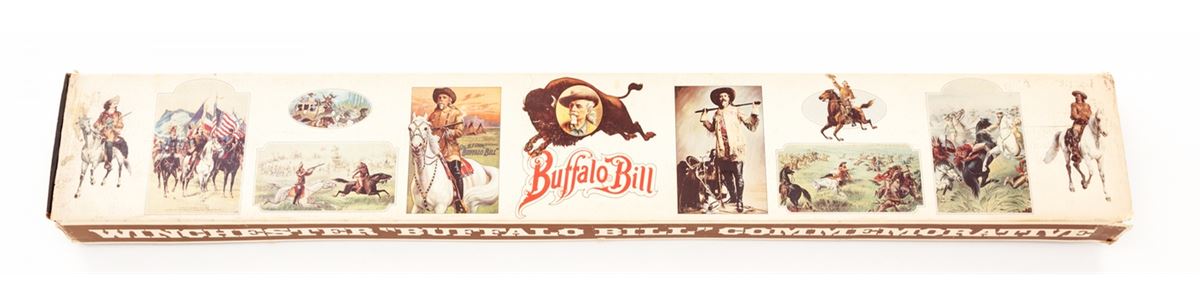 Winchester Model 94 Buffalo Bill Commemorative Lever Action Rifle, #WC3467, .30-30 cal., 26'' octagon barrel, walnut stock inlaid with Buffalo Bill commemorative medallion. Tang engraved ''W.F. Cody/Chief of Scouts'' in script. Condition is excellent, appearing as new and unfired, in original box with paperwork. Polychrome slipcover shows tatters and tears to edges. Est.: $750-$1,000. (Modern)