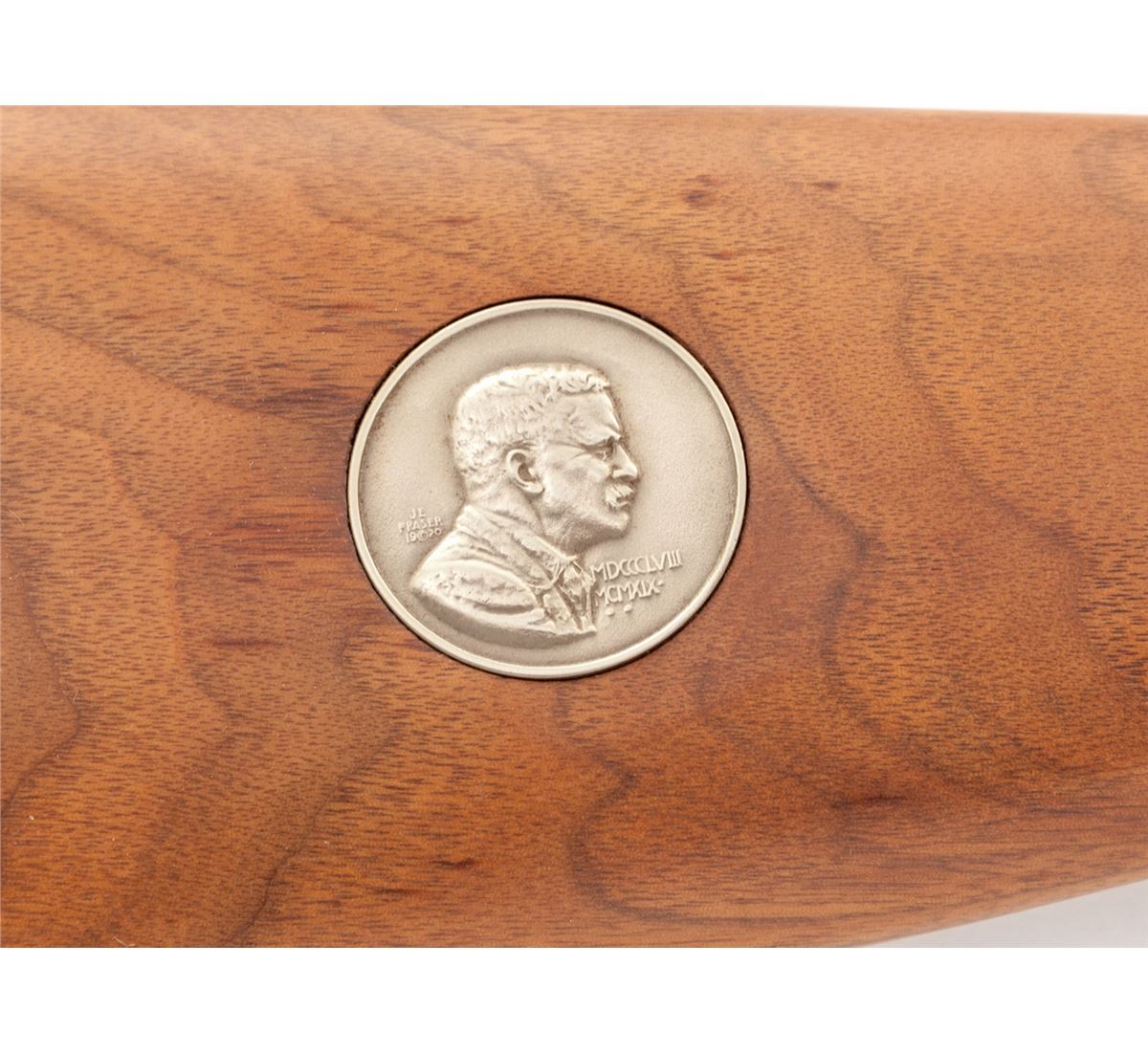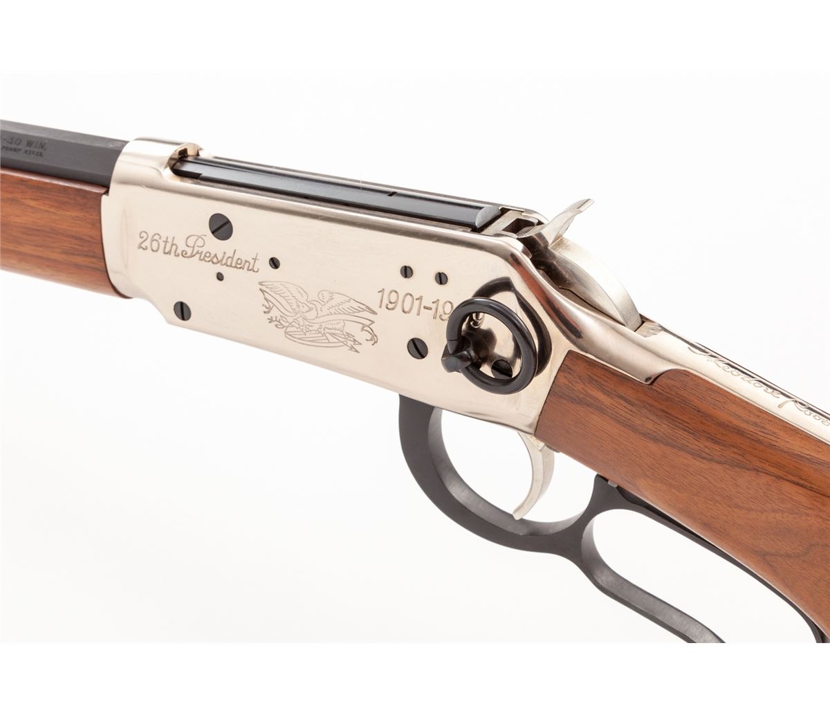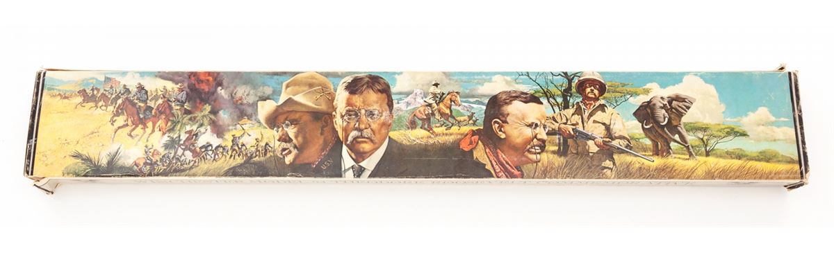 Winchester Model 94 Theodore Roosevelt Commemorative Lever Action Rifle, #TR28741, .30-30 cal., 26'' octagon barrel, lightly engraved frame, smooth walnut stock inlaid with Theodore Roosevelt commemorative medallion. Tang marked ''Theodore Roosevelt'' in script. Condition is excellent, appearing as new and unfired, in original box. Polychrome slipcover shows slight tears and wear to edges. Est.: $600-$800. (Modern)