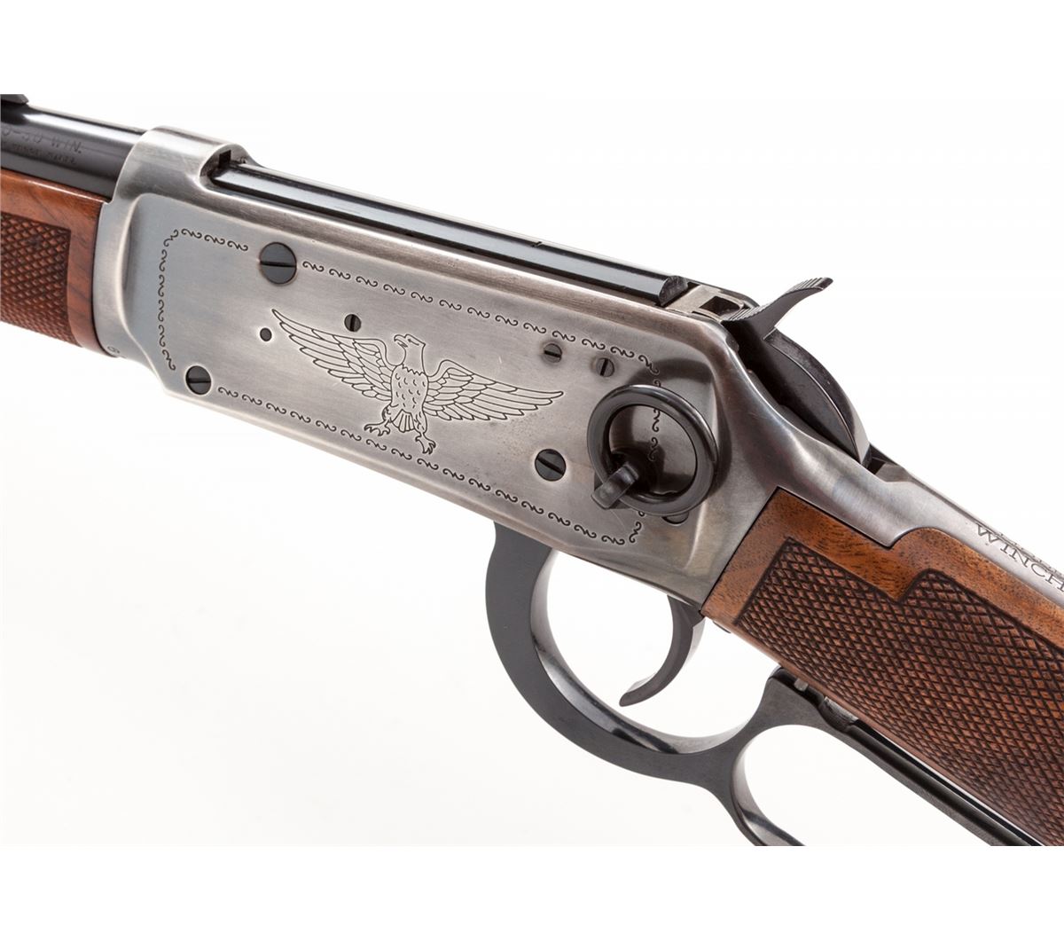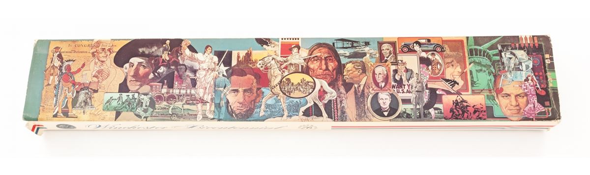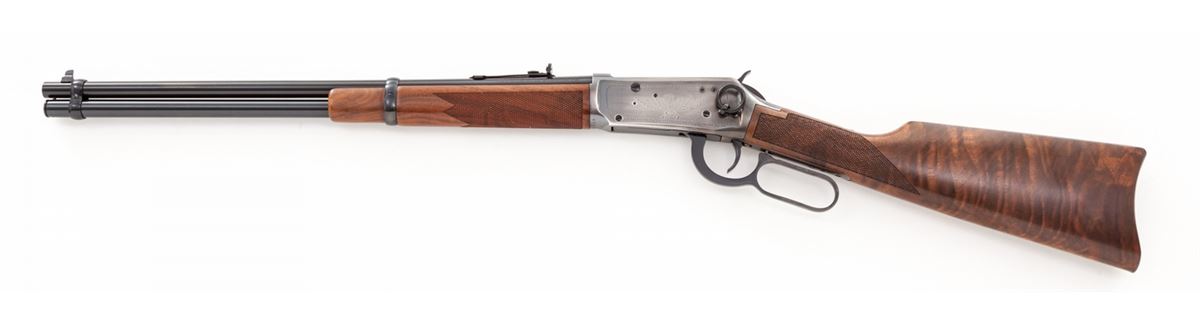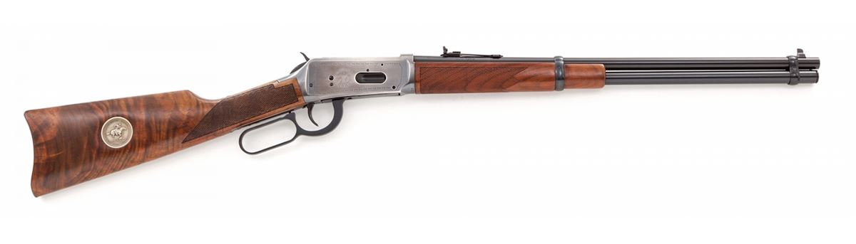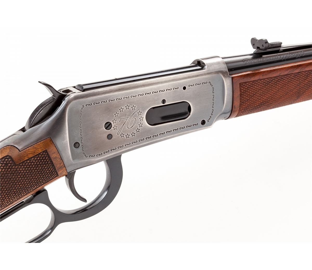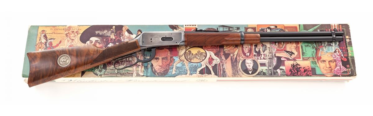 Winchester Model 94 BiCentennial Lever Action Saddlering Carbine, #USA02619, .30-30 cal., 20'' barrel, antique silver finish, pressed checkered walnut stock with Winchester Rider medallion. Condition is excellent, appearing as new and unfired, in original box, with polychrome slipcover showing wear to edges. Est.: $800-$1,200. (Modern)