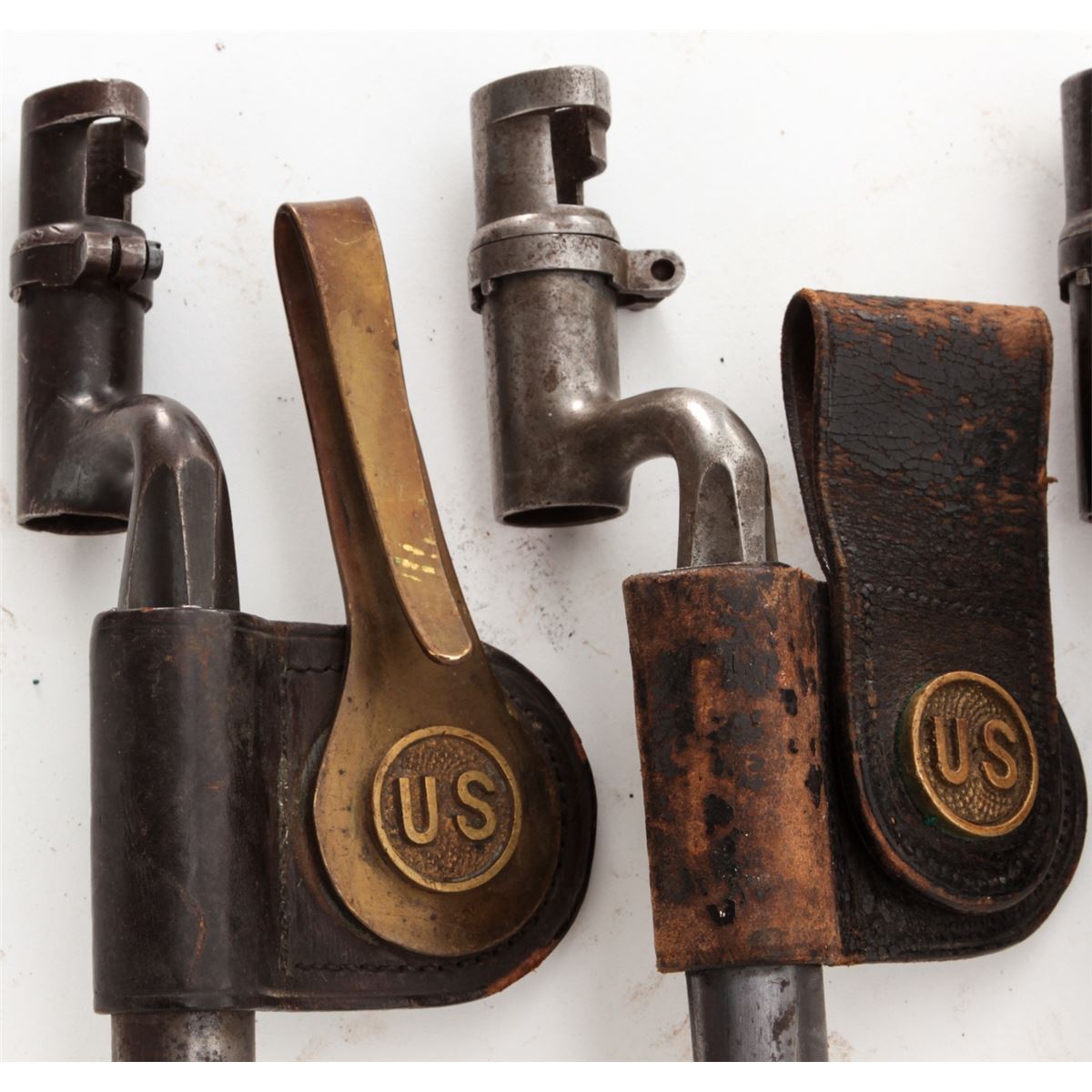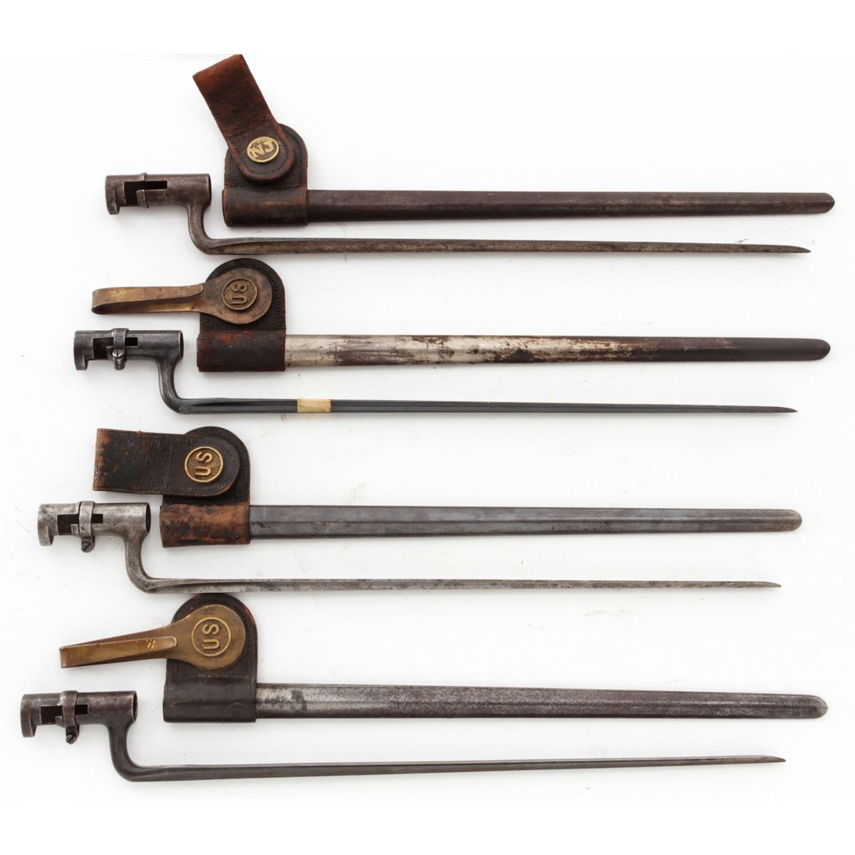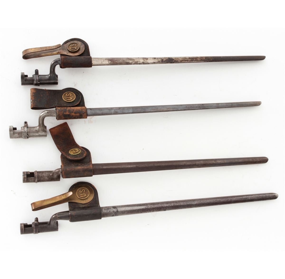 Lot of Four (4) Model 1873 Trapdoor Socket Bayonets, all marked ''U.S.'' with 18'' blades, metal scabbards, leather frogs, and two with brass hangars. Three of the frogs with brass ''US'' buttons and one with a brass ''NJ'' button. Conditions are good overall showing normal signs of age and wear. Two of the blades are bright with moderate to heavy carbon spotting and scattered light pitting; the other two bayonets with blue blades that have most likely been re-blued at some point and time. Leather frogs with varying amounts of age and wear but remain intact. Est.: $300-$400/lot.