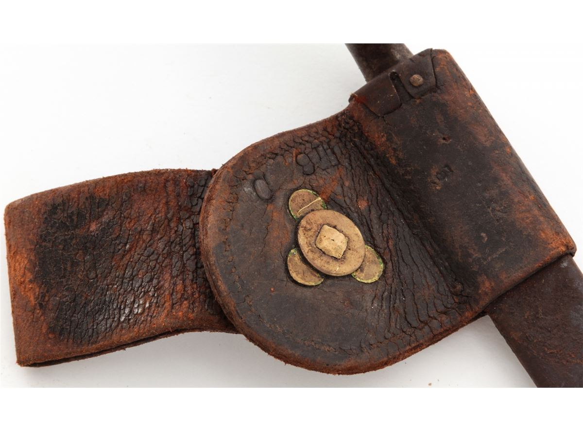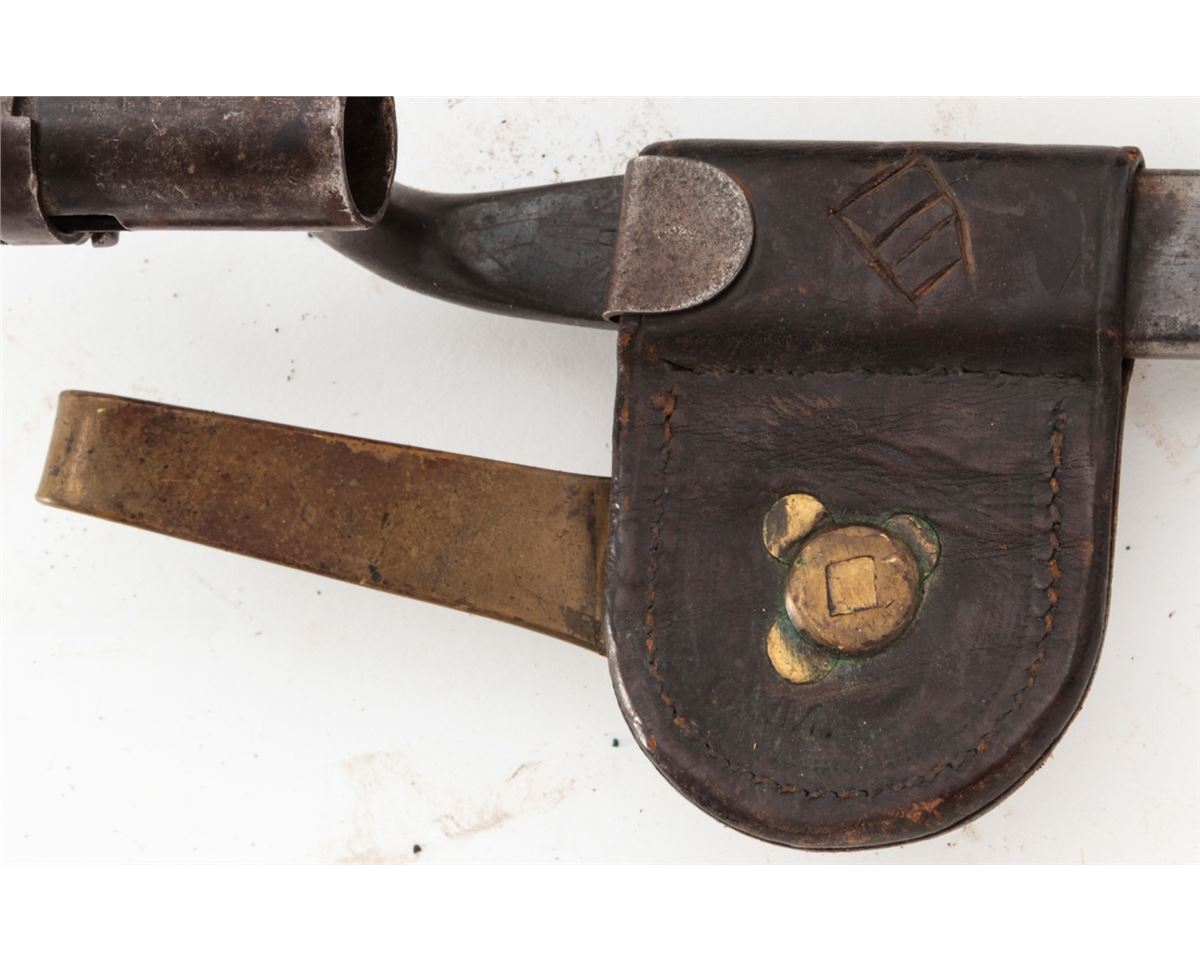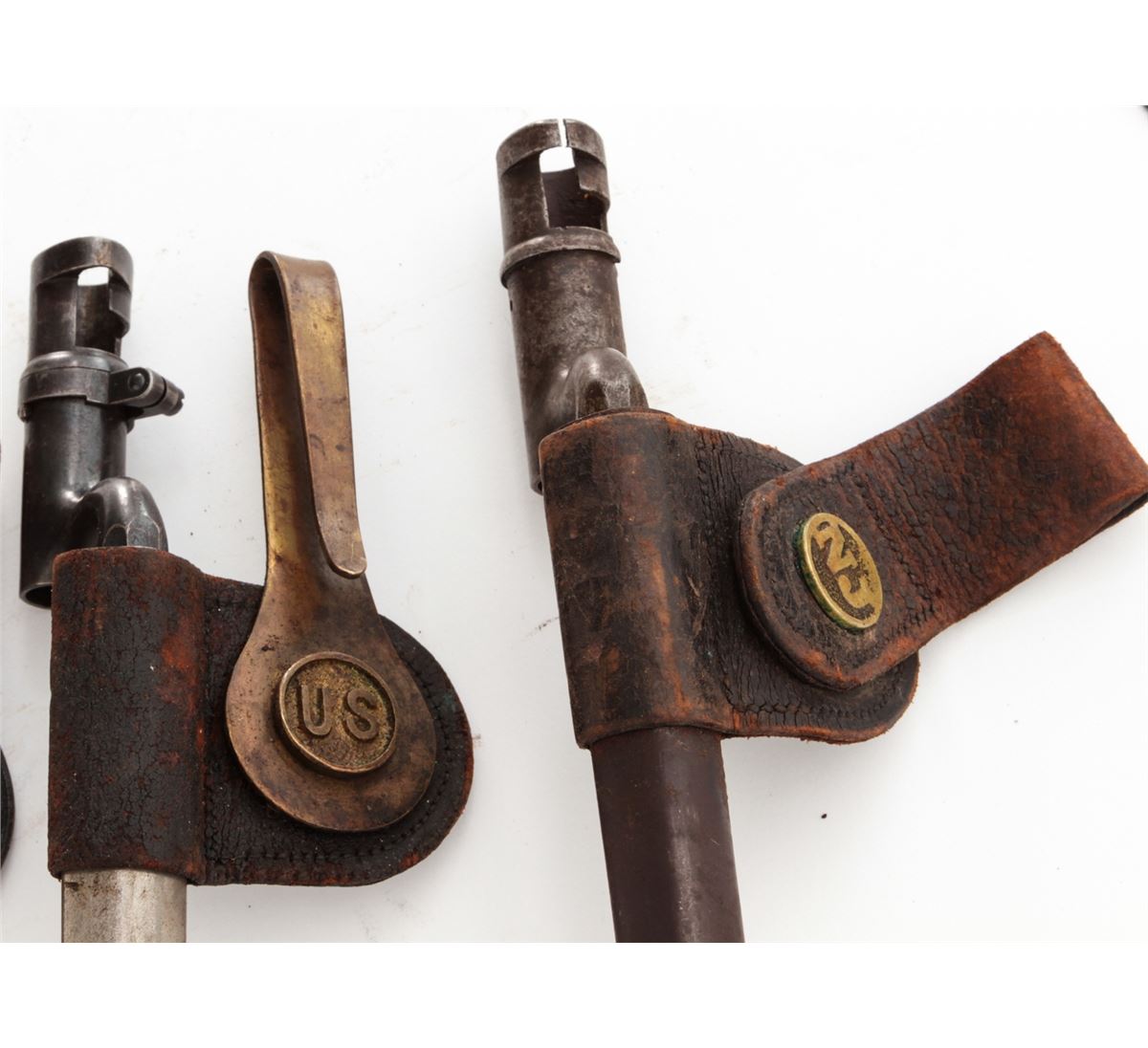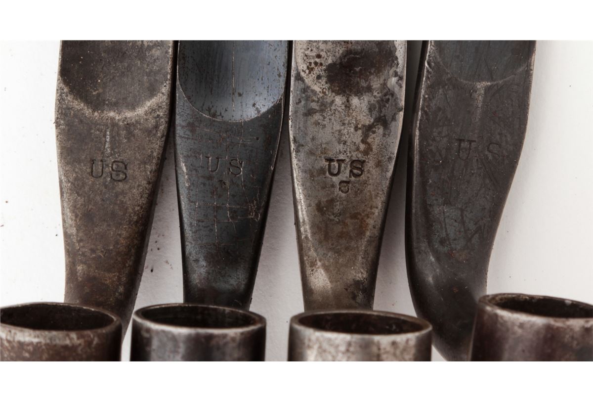 Lot of Four (4) Model 1873 Trapdoor Socket Bayonets, all marked ''U.S.'' with 18'' blades, metal scabbards, leather frogs, and two with brass hangars. Three of the frogs with brass ''US'' buttons and one with a brass ''NJ'' button. Conditions are good overall showing normal signs of age and wear. Two of the blades are bright with moderate to heavy carbon spotting and scattered light pitting; the other two bayonets with blue blades that have most likely been re-blued at some point and time. Leather frogs with varying amounts of age and wear but remain intact. Est.: $300-$400/lot.