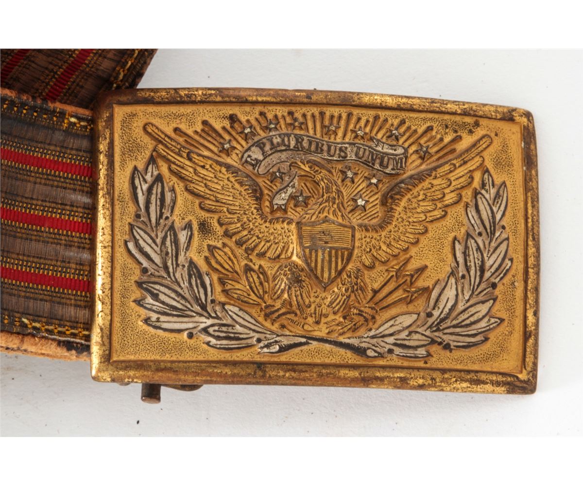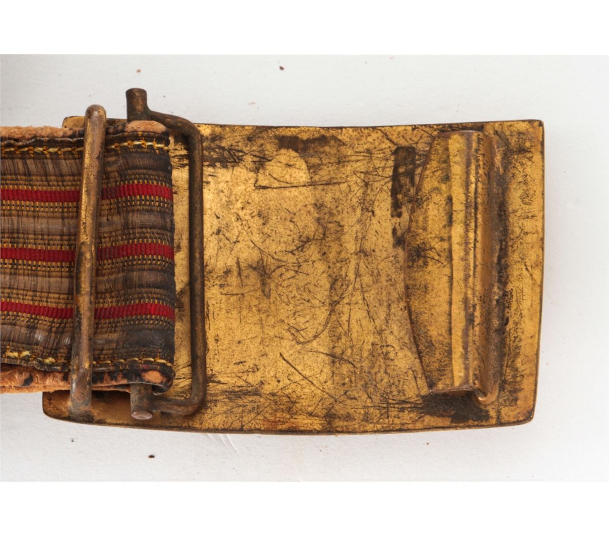 Late 19th to Early 20th Century Artillery Officer's Dress Belt, with Gold and Silver Gilt Eagle Belt Plate. Condition to belt plate is excellent; belt with frays and scuffs to finished leather. Est.: $150-$300.
