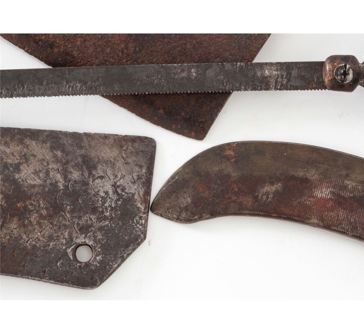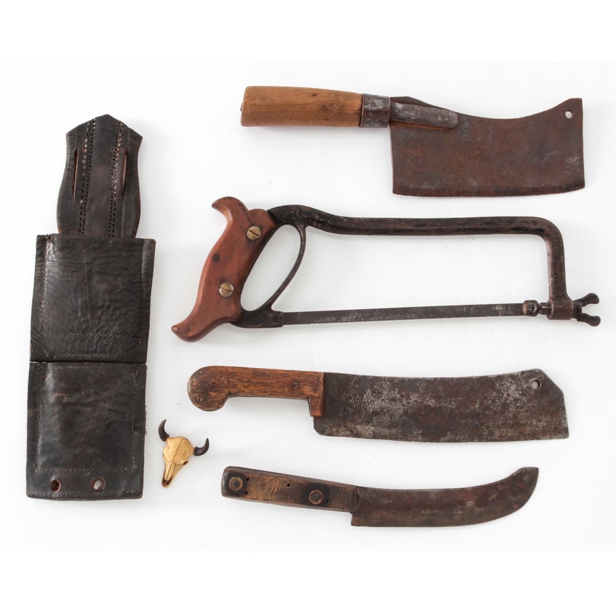 Lot of Late 18th to Early 19th Century Knives and Tools, including cast iron hack saw, skinning knife, several meat cleavers, and one black scabbard with bronze U.S. devices. Condition is very good with moderate overall patination. Est.: $200-$400/lot.