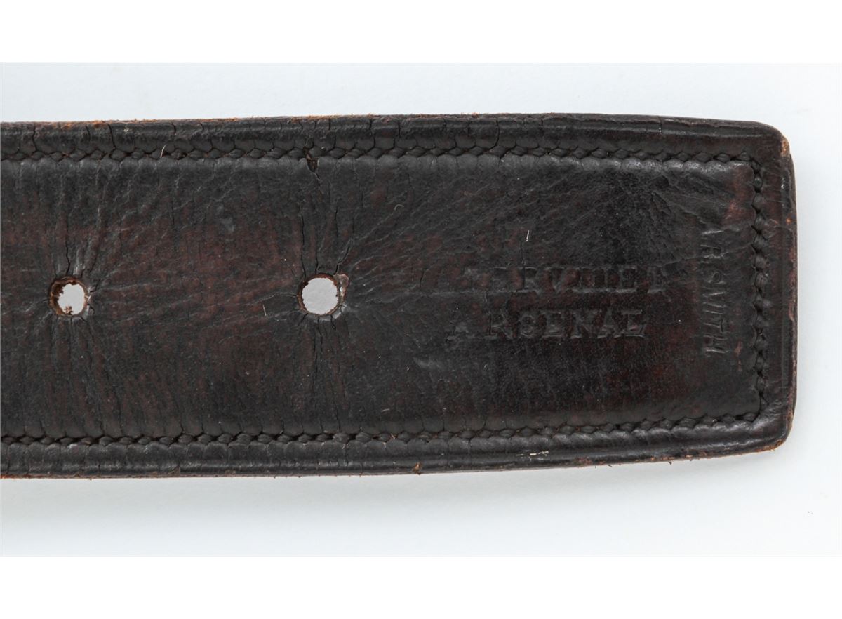 U.S. Model 1876 Wide Variation Cartridge Belt, by Watervliet Arsenal, with 54 loops for .45-70 Gov't Carbine or rifle cartridges. Condition is fine showing very light fraying to edges of loops. Bridal leather tongue with moderate crazing, and small wear-thru marks to back portion. Clear markings with final inspection by A.R. Smith. Est.: $200-$400.