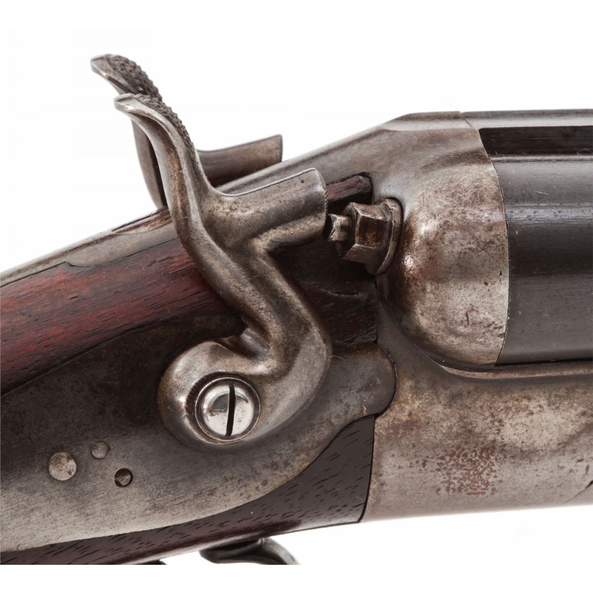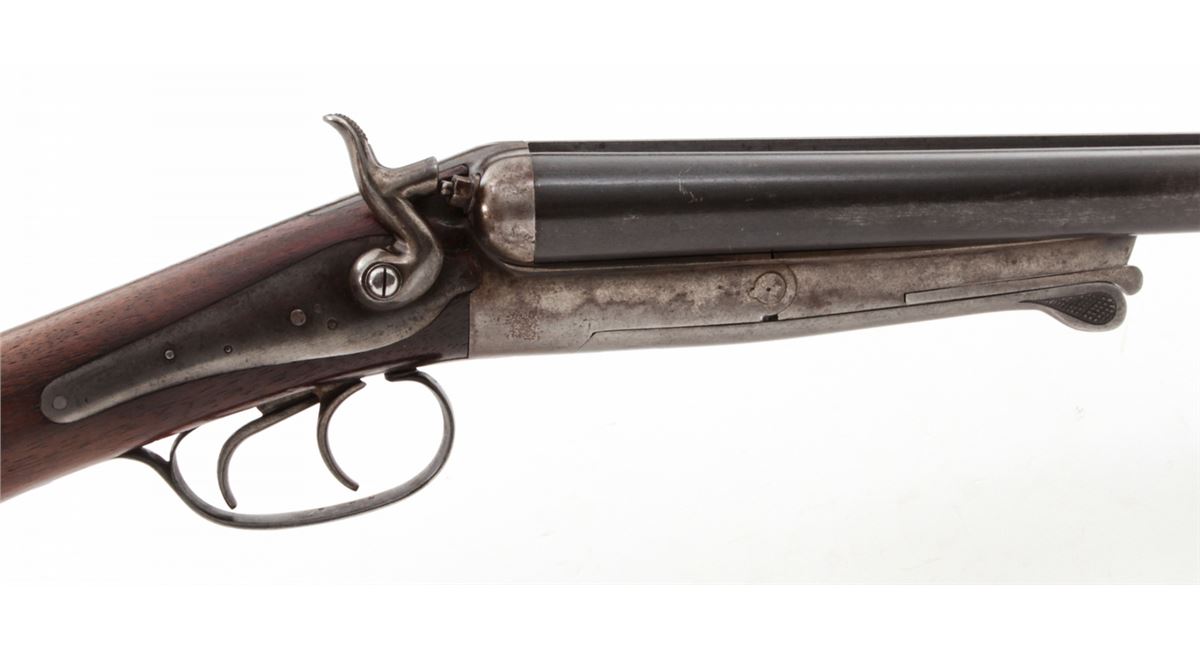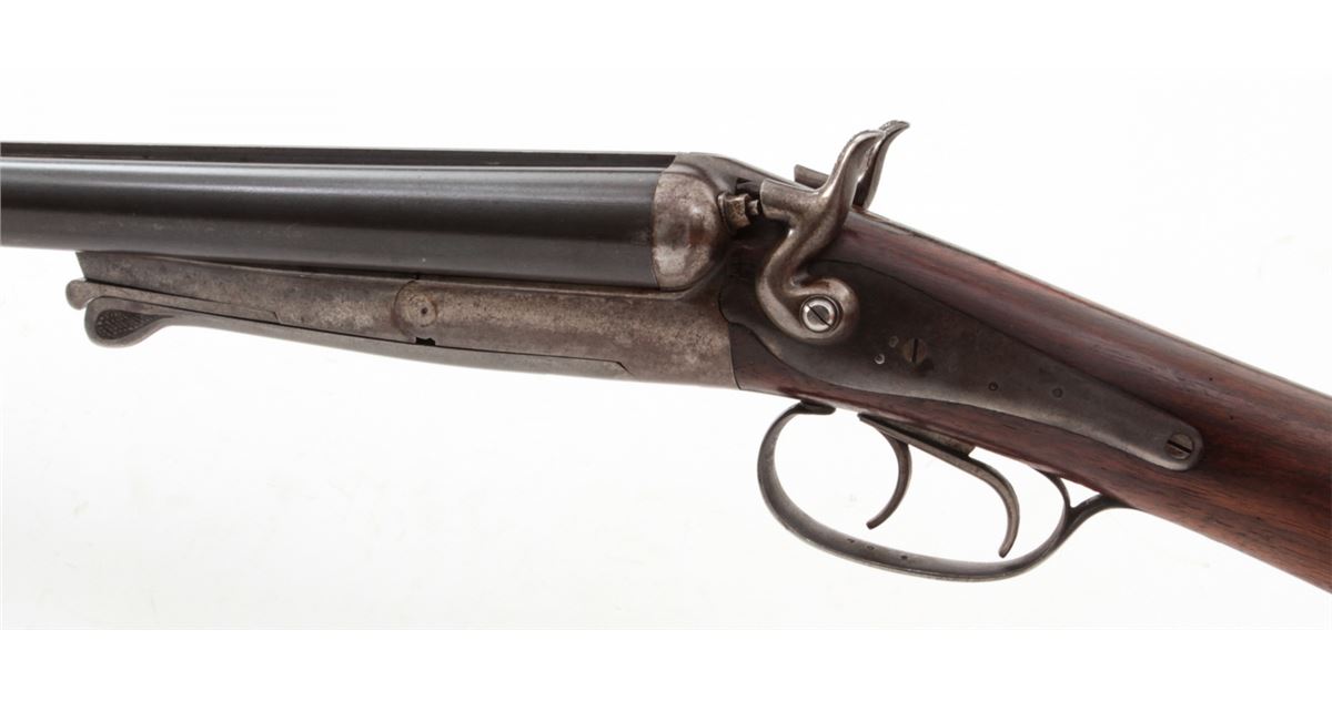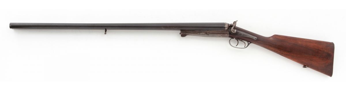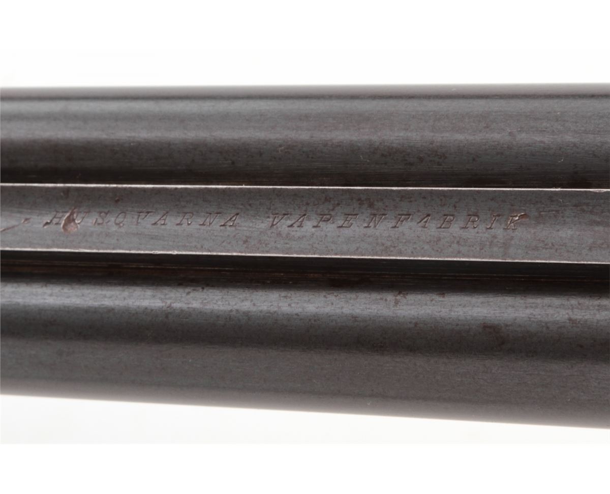 Antique Husqvarna Side-by-Side Underlever Shotgun, #112702, 12 ga., 29-1/2'' game rib barrels choked Full/Full, blue and case hardened finish, walnut stock, with integral steel forend. Condition is fine to near excellent. Barrel assembly retains approx. 94% blue, back locks retain 30% case hardened colors, frame has toned a silvery gray. Stock shows approx. 80% original varnish with light scuffs and minor handling marks. Good action, fine bores. Est.: $400-$600. (Antique)