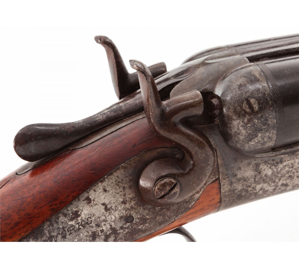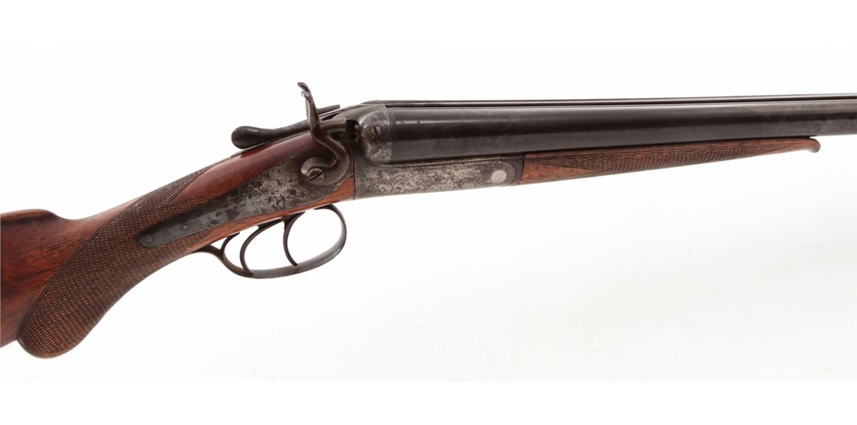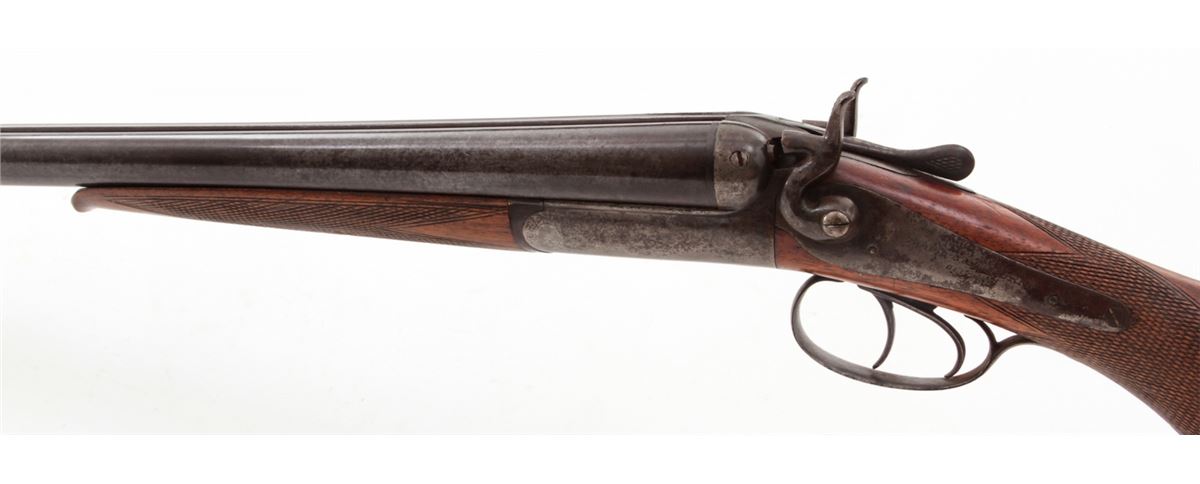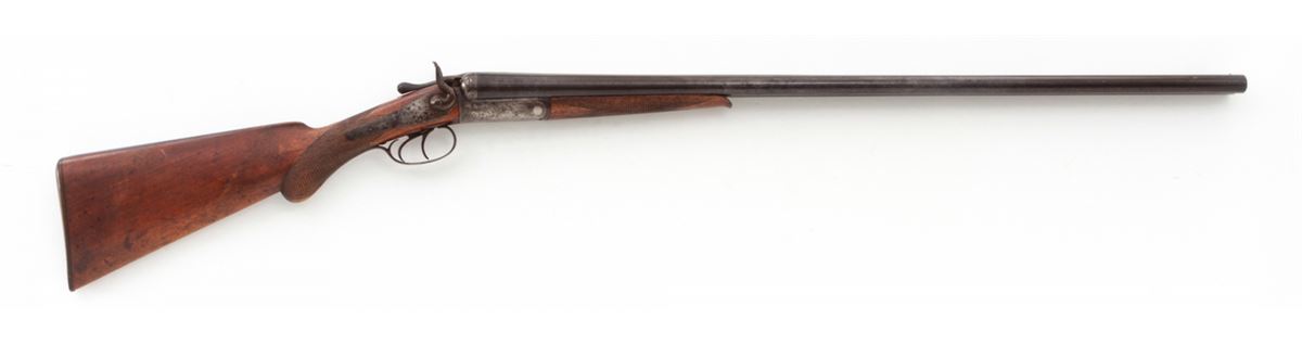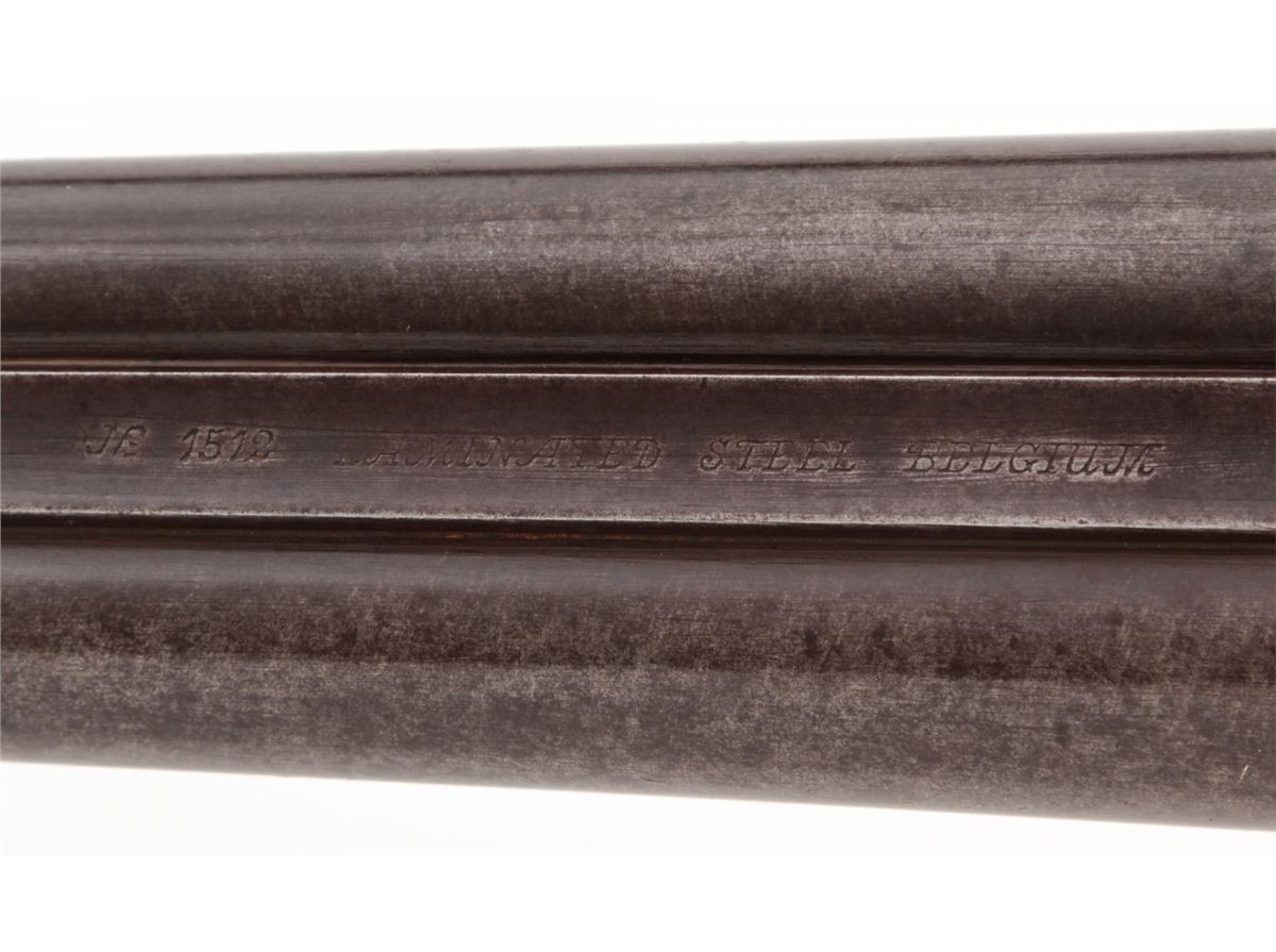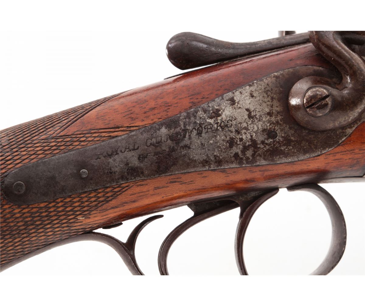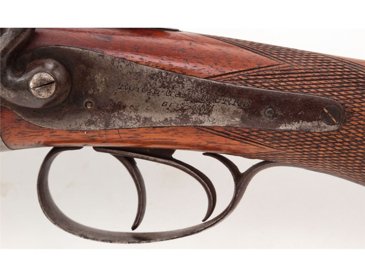 Royal Gunworks Side-by-Side Shotgun, #40635, 12 ga., 32'' Damascus blue barrels choked Full/Mod., top of barrels marked ''Laminated Steel, Belgium'', case hardened finish, exposed hammers, double triggers, checkered walnut Prince of Wales stock with splinter forend, with original brown hard rubber butt pad. Back locks marked ''Royal Gunworks, Belgium''. Condition is very good. Barrels retain approx. 60% toning blue; case hardened portions have toned a brownish gray. Varnished stock retains approx. 90% finish with scratches and minor spots from water. Good action and bores; left barrel with small ding approx. 10'' from muzzle. Est.: $200-$400. (Antique)