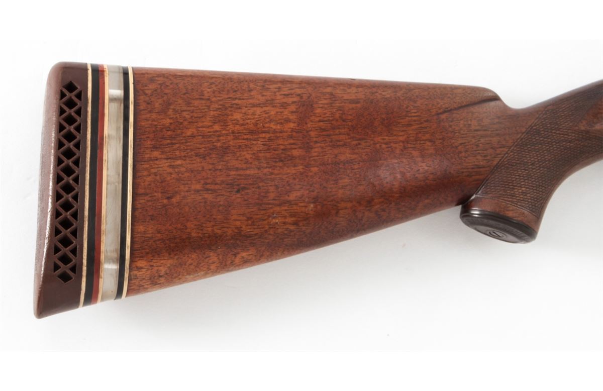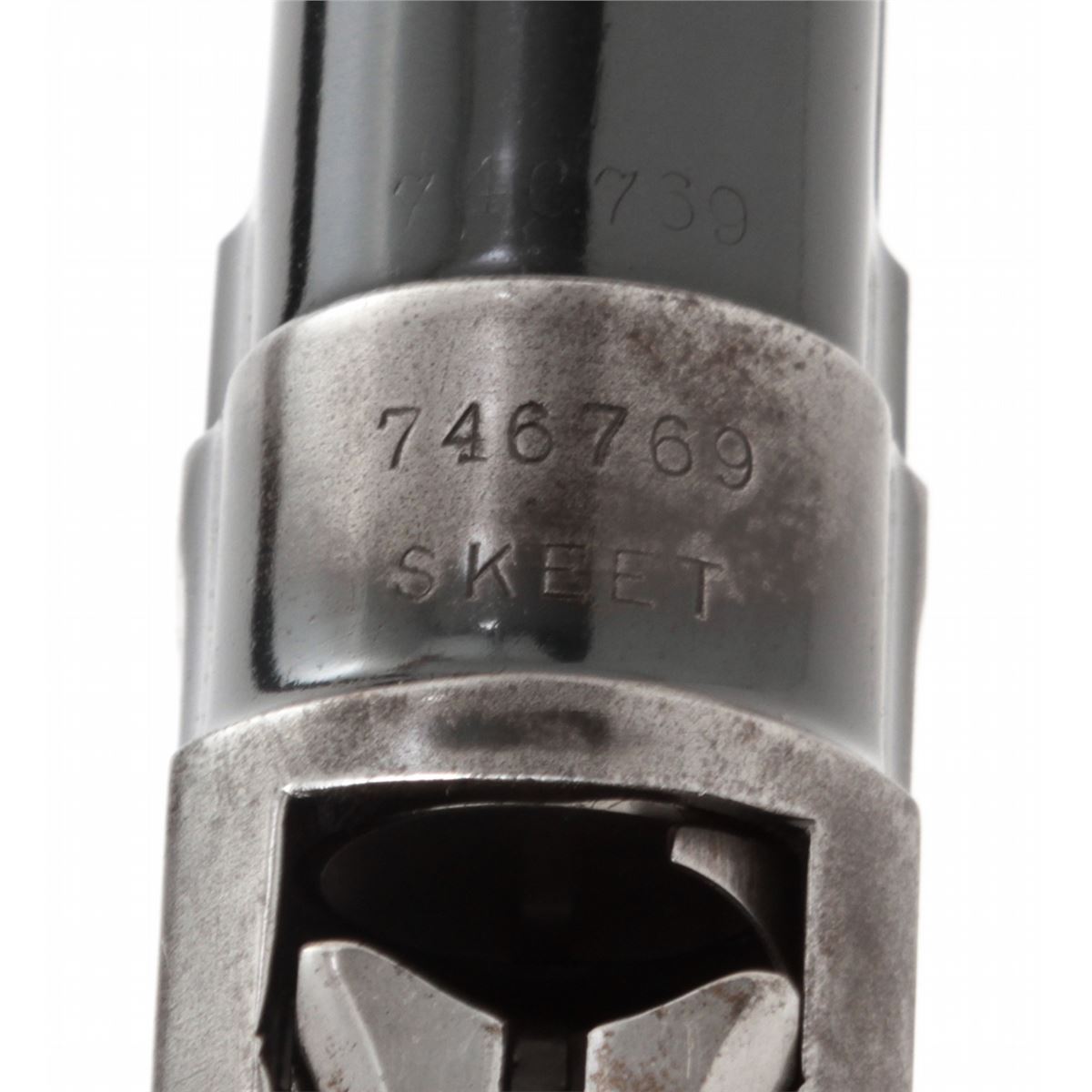 Winchester Model 12 Skeet Pump Action Shotgun, #746769, 12 ga., 30'' Skeet rib barrel choked Full, blue finish, walnut stock with added spacers and Whiteline rubber butt pad. Dual white beads to rib. Bottom of receiver just below serial number marked ''Skeet''. Mfg'd 1937. Condition is very good as partially refinished. Barrel and mag tube show approx. 92% of a later blue. Frame retains 85%-90% thinning original blue. Stock with moderate use and flattening to checks. Length of pull to end of wood: 12''; to end of pad and spacers: 13-5/8''. Action is good, bore is fine. Est.: $250-$450. (C&R)