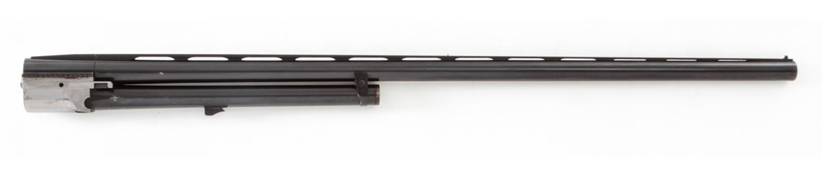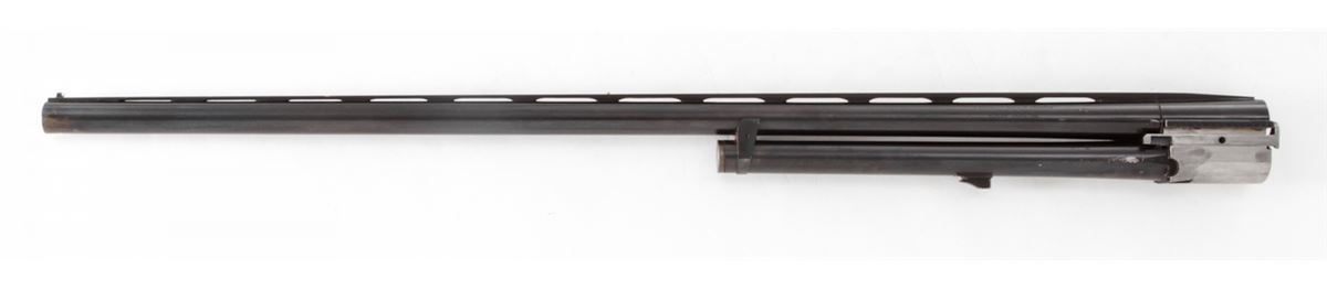 Krieghoff Model 32 Top Single Trap Shotgun Barrel, #1055, 12 ga., 2-3/4'', 30'' blue with .732'' bore and extra full .058'' constriction, 8mm tapered ventilated rib with white front and silver middle beads, Ulm Proof date 3/62. Condition is excellent with 98% blue and bright bore, includes snap cap weight; missing both ejector screws. Est.: $500-$800.